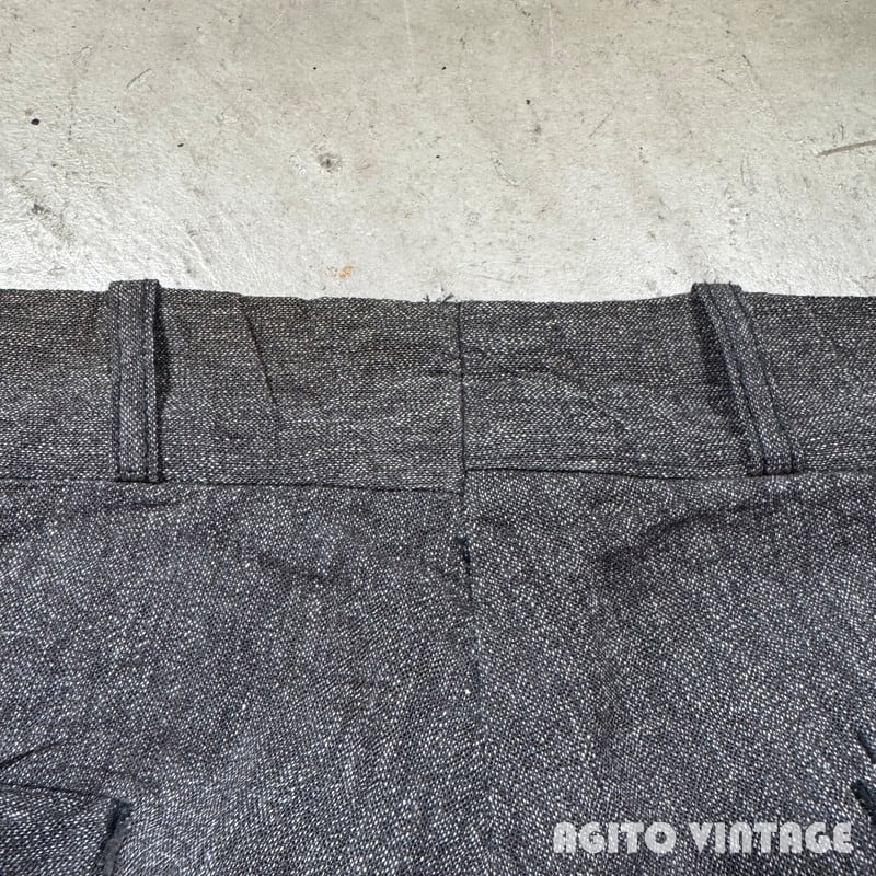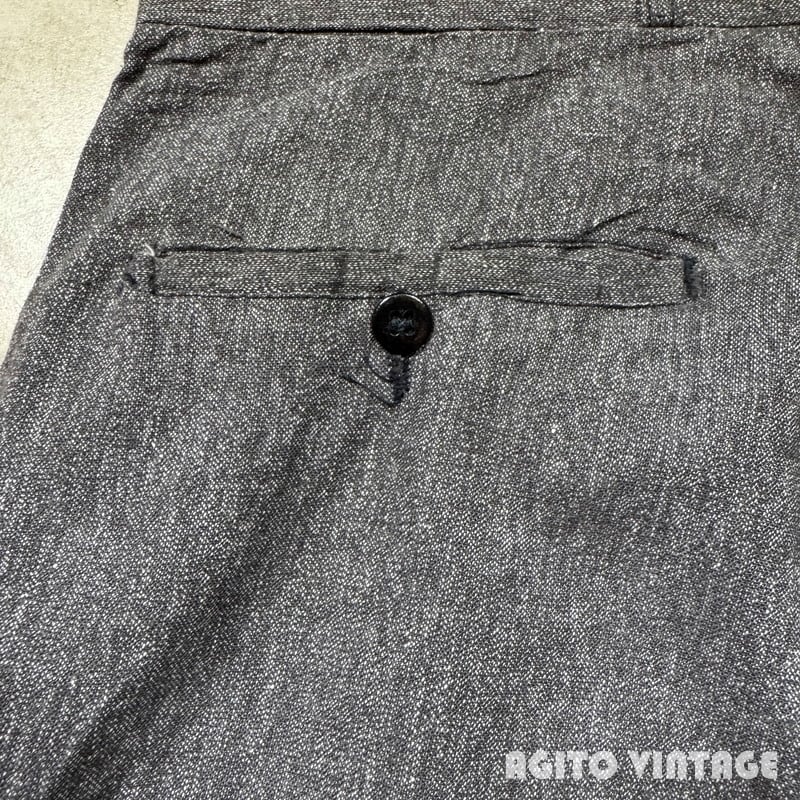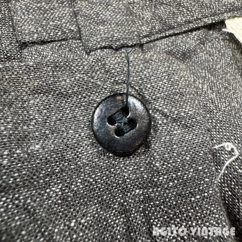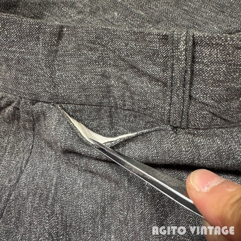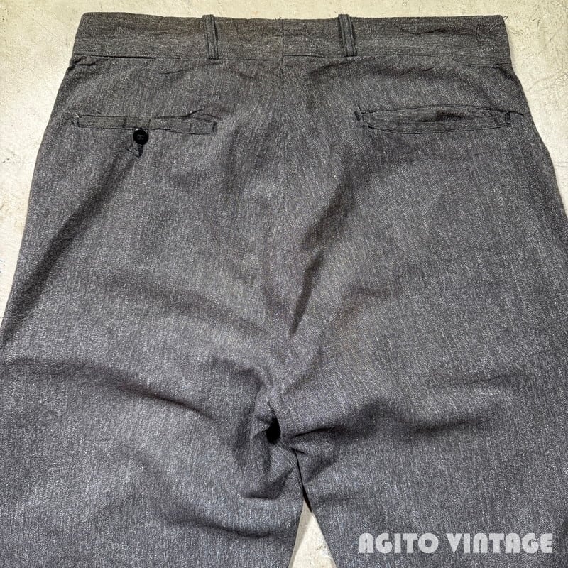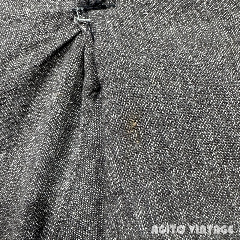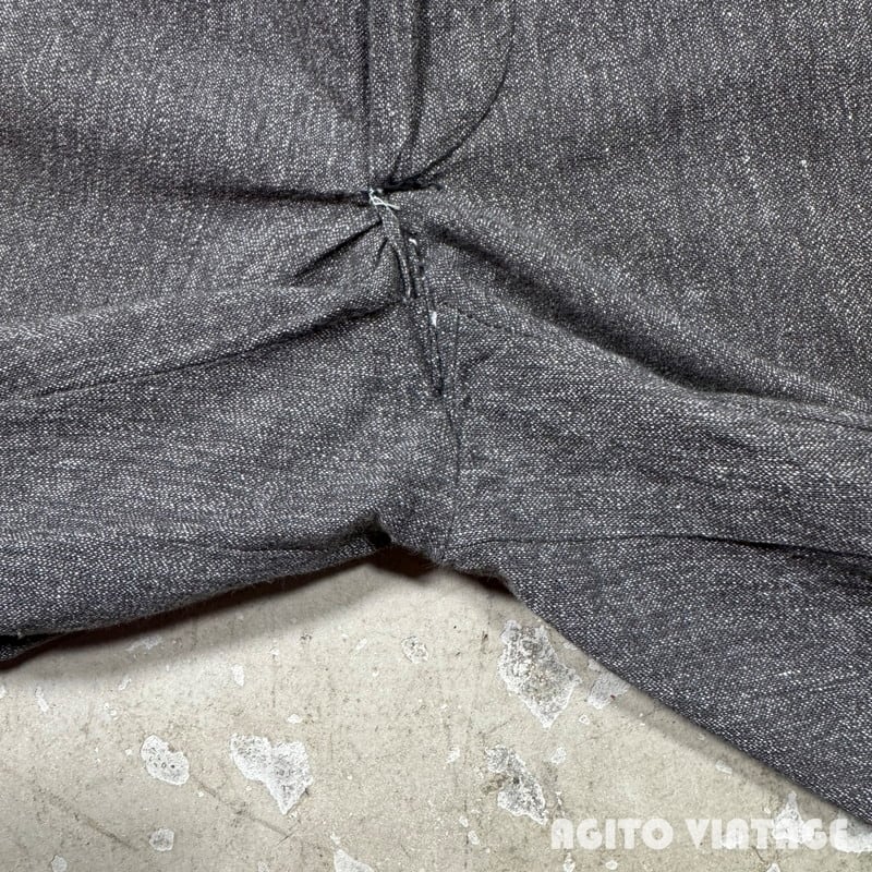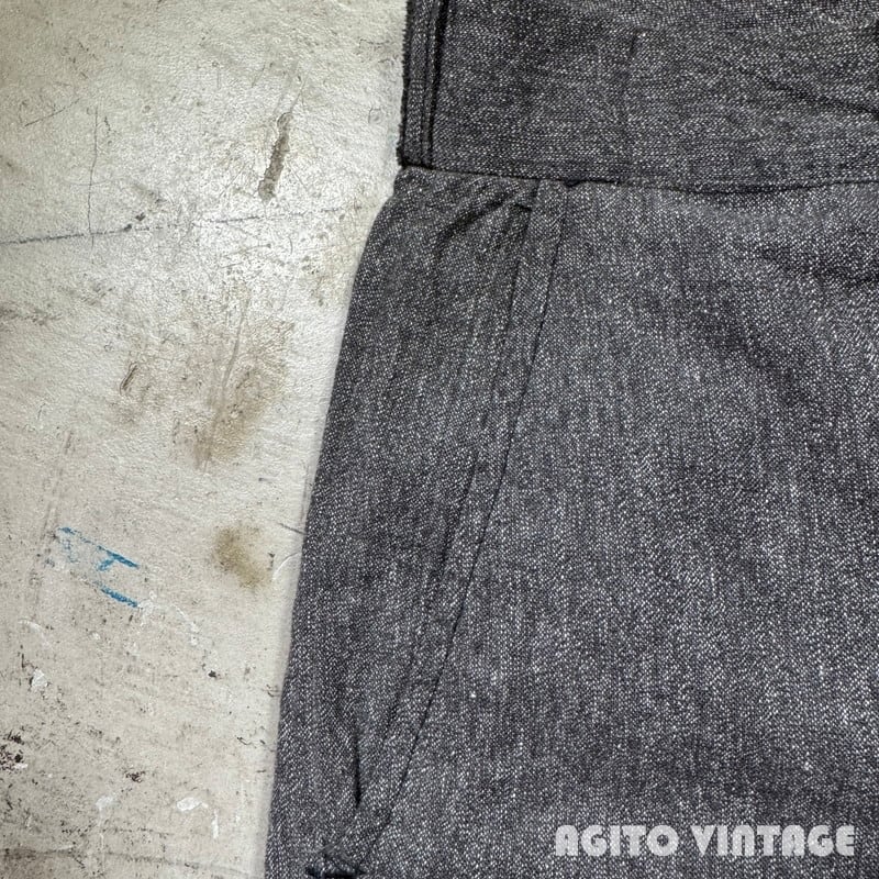 50年代から60年代頃と思われるUnknownシャンブレーワークパンツです。タグ等が無いのでブランド等の詳細は不明です。生地感はブラックシャンブレーシャツと同様の薄手です。フロントはボタンフライで、ボタンは全て抜いつけです。ポケット縁は片玉縁仕様です。股には動きやすさを出す為にガゼットクロッチが採用されています。アウトシームは片耳仕様です。テーパードの無いゆったりとしたストレートシルエットです。目立つ汚れやダメージは特に無くグッドコンディションと言える1本です。ウエストは実寸で約W32インチですのでサイズが合う方も多いのではないでしょうか。レングスは6.5cm内側に折り返しがある為、5cm程ですと長さの調整が出来ます。薄手の生地なので真冬には不向きですが真冬以外は使い易いのでゆったりストレートのワークパンツをお探しだった方はいかがでしょうか。ブラックシャンブレー地のパンツはシャツに比べ見かける機会も少ないかと思いますので是非この機会にお見逃しなく。