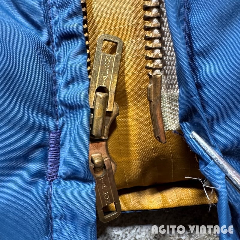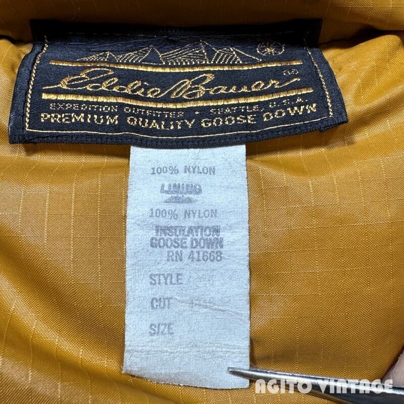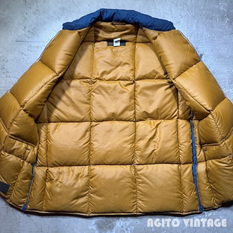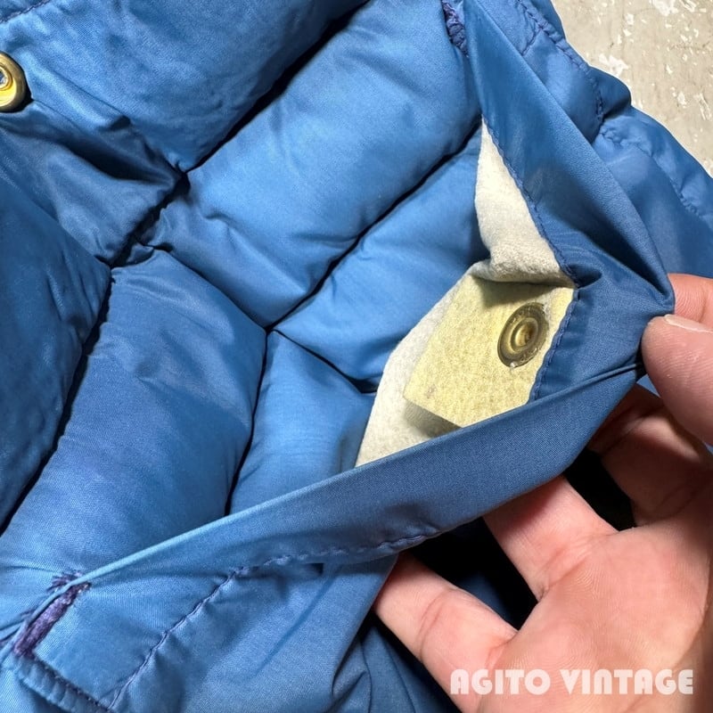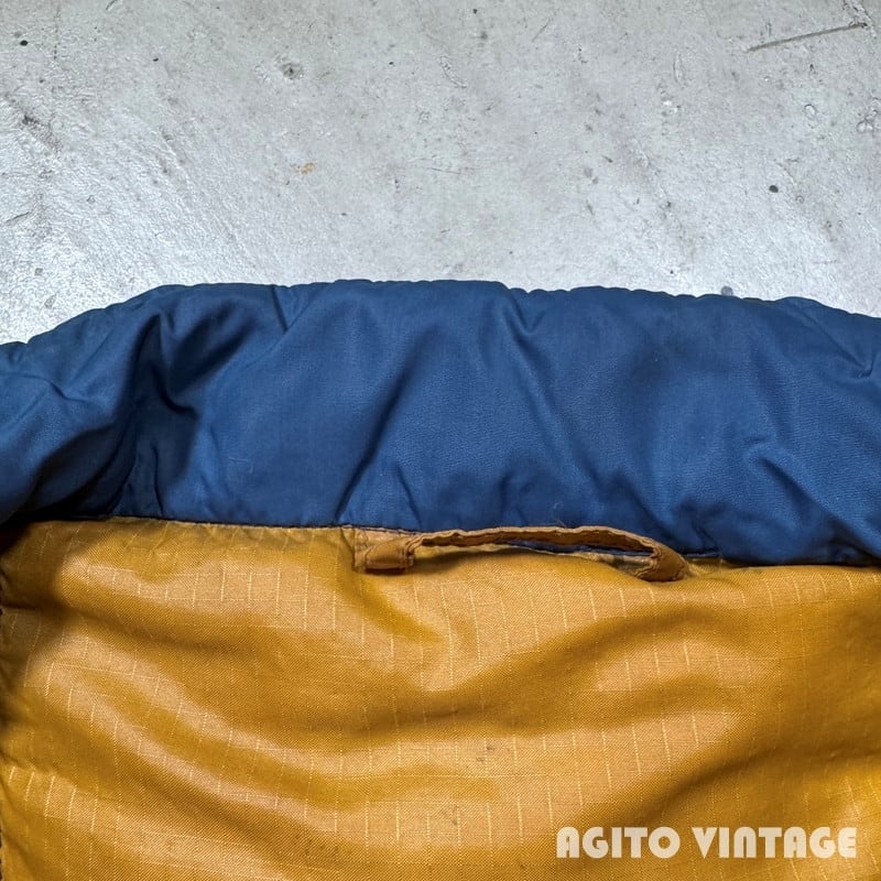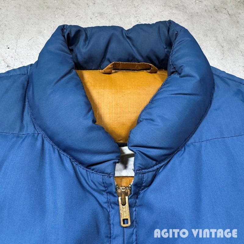 70年代頃のEddie Bauer Snowline Vestです。60年代に使用されていた日の出タグから移行した頃のモデルでしょうか。黒タグの下部には紙タグもしっかりと残っています。フロントはTALONのダブルジッパーが採用されています。フロント下部にはふらっぽポケットが配置されておりボタンにはEBの浮彫が入ります。カラーはウィンターブルーというすこしネイビーに近い色味です。裏地はマスタードぽい色味です。首元やフロント中央、ジッパーの両サイド等に薄汚れがございます。ダメージは特に無くコンディションは良好かと思います。タグの表記がかなり薄れていますがXLの文字が確認できます。着丈が78cmを越えているのでもしかするとXL TALL表記なのかもしれません。古いダウンベストでこのサイズ感はなかなか見かけないと思います。ブランケット付きのカバーオールなどの上からも充分羽織っていただけます。着丈のあるダウンベストをお探しだった方は是非この機会にいかがでしょうか。