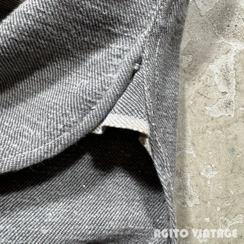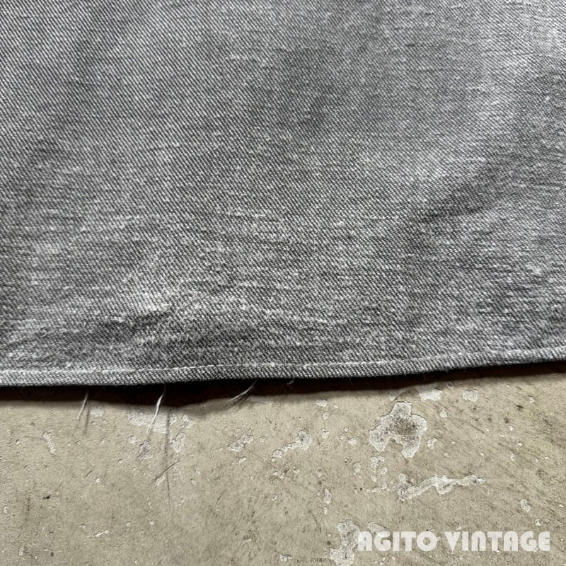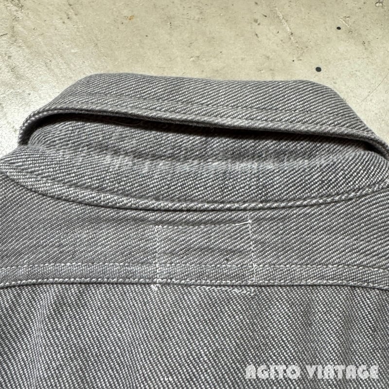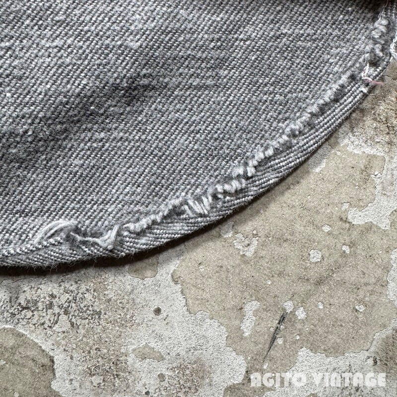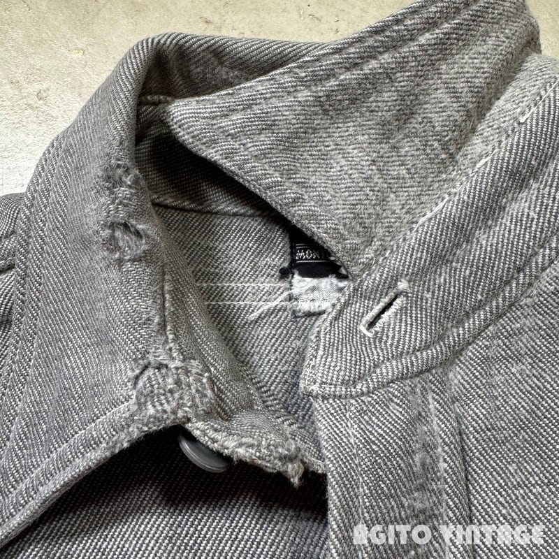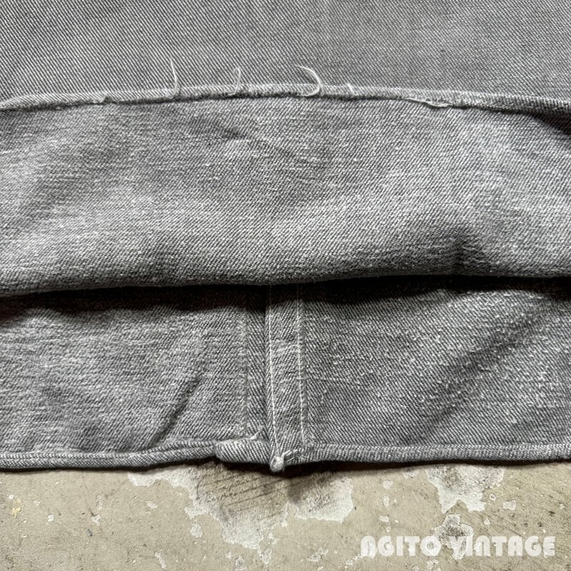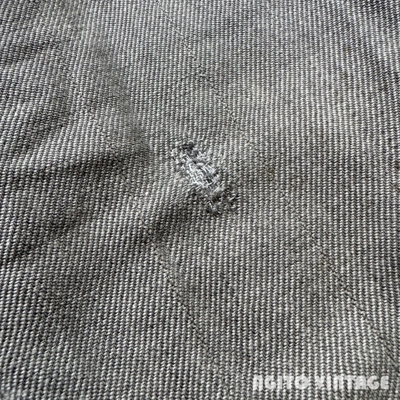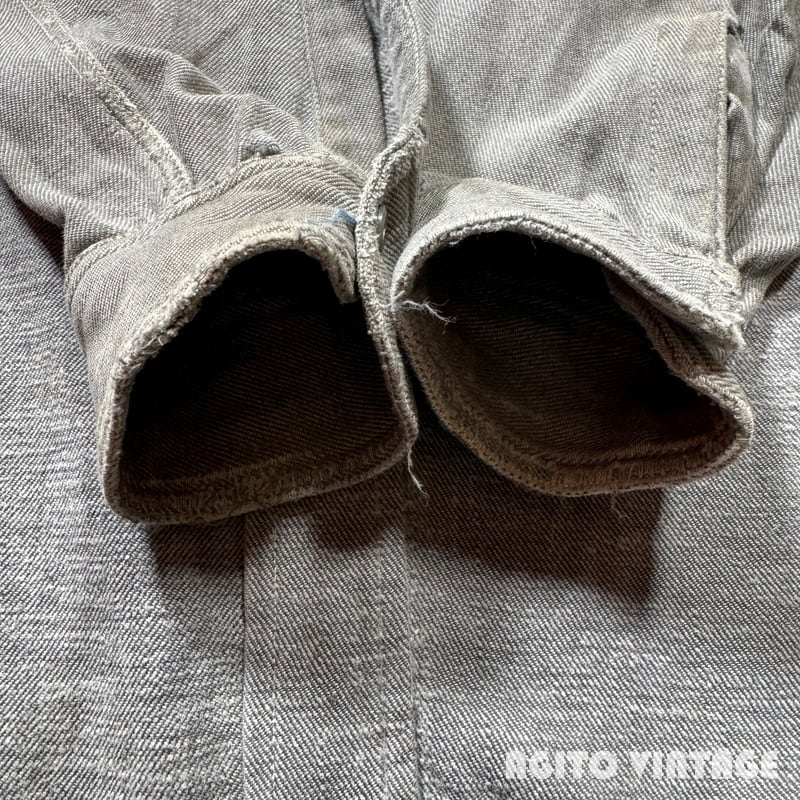 30年代から40年代頃のMONTGOMERY WARD コットンコバートワークシャツです。アメリカ3大ストアで有名なMONTGOMERY WARD(モンゴメリーワード)が展開していたワークウェアです。ご紹介するこちらは、台襟、ダブルステッチ、サイドマチ付きなど非常に古いディティールが見られる1着で、小ぶりなブランドタグが付きます。ボタンはメタルと樹脂製の物がミックスで付けられています。襟や袖先にダメージがあり、襟周りや腹部には擦れによる毛羽立ちがございます。細かな汚れも見られます。90年近く前の衣料としては悪くないかと思います。サイズ表記はございませんがM相当かと思われます。着丈がありますので古いワークチノなどにタックインして合わせてもカッコ良いのではないでしょうか。この年代あたりのシャツも見かける機会は少なくなってきたのでお好きな方は是非この機会にいかがでしょうか。