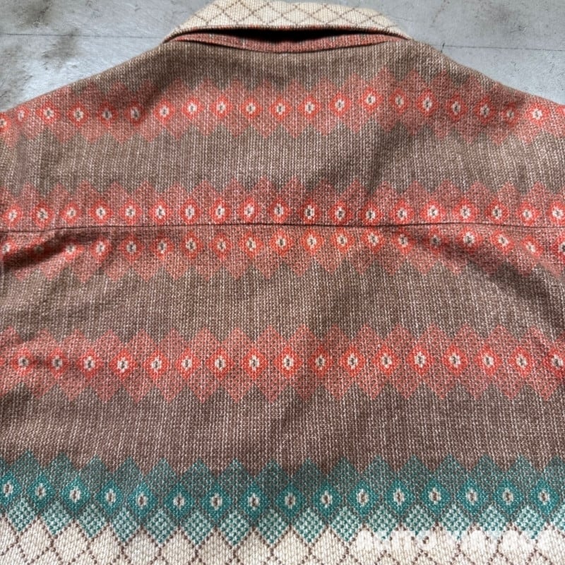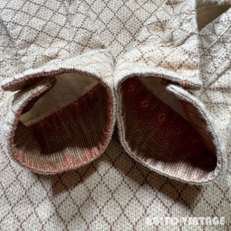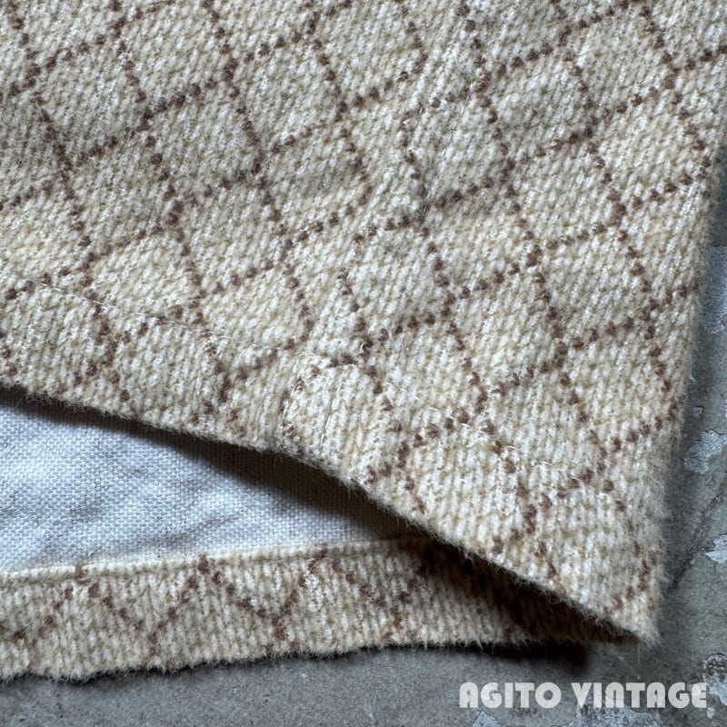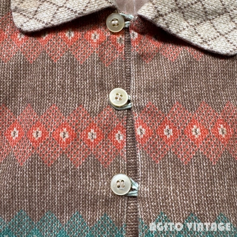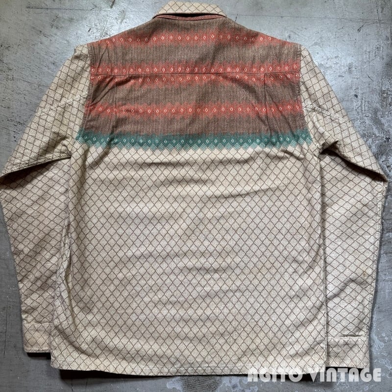50年代のOld Kentucky プリントネルプルオーバーシャツです。1904年にKentucky Manufacturing Co.として創業し、1960年代にはWASHINGTON DEE CEEを展開していたWASHINGTON MANUFUCTURIN社に吸収合併されたブランドです。ご紹介するこちらは、全面にプリントが入るネルシャツで、フロントが三つボタンのプルオーバータイプです。襟は丸みのある袋縫いです。左胸のポケットは綺麗に柄が合わせられています。ネル特有の毛羽立ちはございますが目立ち汚れは無くコンディションの良い1着です。S表記ですので小柄な方や細身な方にお勧めです。この年代のプリネルでコンディションが良い物はなかなか出会わないと思いますのでサイズ感が合う方は是非この機会をお見逃しなく。