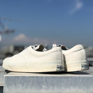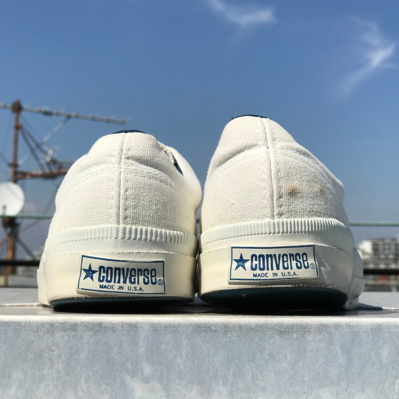 80年代頃のCONVERSEスキッドグリップです。1940年に当時人気スポーツであったテニス用につくられたのがこのスキッドグリップでコンバースの中でも長寿なモデルです。80年代頃からカラーバリエーション等も増えたようですが、こちらは定番のホワイトです。インソールはパイル地となっており、素足でも履きやすそうです。印字はされていますが、少し見えにくくなっています。履き口のナイロン部分に生地のダメージがございます。ソール減りもほとんど無い美品です。希少な80年代のUSA製ですので、お探しだった方は必見です。US8 1/2