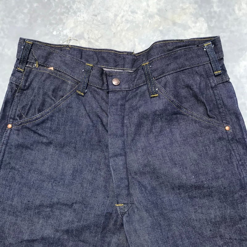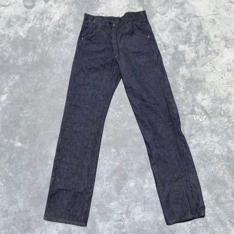 60年代頃のWESTERN JENSというブランドのデニムパンツです。マイナーなブランドで詳細は」不明ですが、60~70年代頃によく作られていたタイプの5ポケットパンツで、当時のBIG YANK等のデニムのディティールにも酷似しております。デッドストックからのワンウォッシュで、レングスもオリジナルです。革パッチは柔らかいレザーを使用しており、経年変化も楽しめそうです。フロントジッパーはFLEETというピンロックジッパーを採用しています。まだ糊も落ち切っていないワンウォッシュなので、ダメージやアタリ等も無く非常に状態も良い1本です。マイナーブランドではありますが、作りも本格的でこれから育て甲斐もありますので、サイズの合う方には大変おススメです。