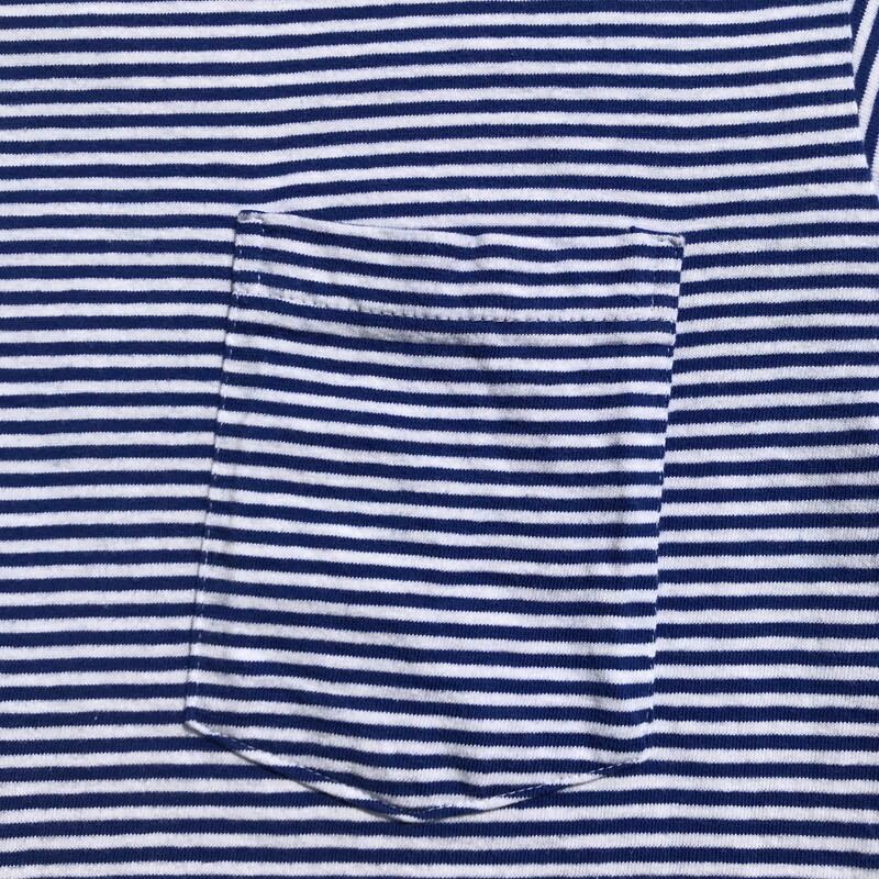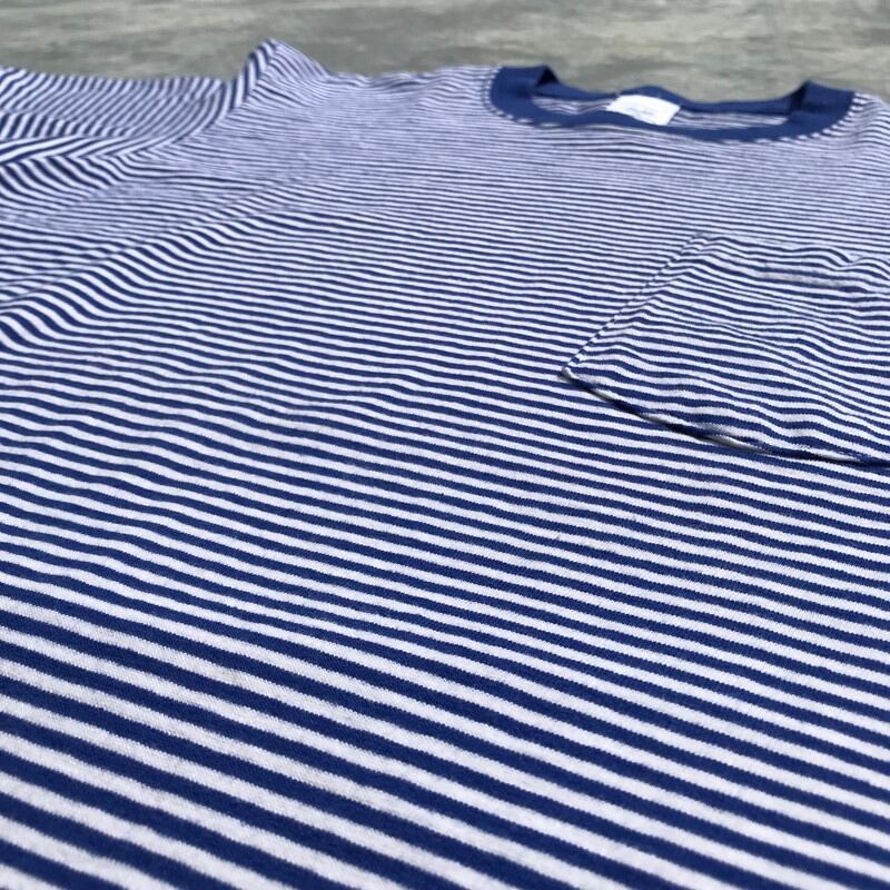 90'sころのTOWNCRAFTボーダーポケットTシャツです。アメリカを代表する3大ストアのJCPennyが展開するプライベートブランドです。年代は浅いですが、古着市場でも人気が高く、通年使えるTシャツです。狭いピッチ幅のボーダーなので、柄物とでも合わせやすいデザインです。使用感も少なくきれいです。ホワイトのコットンパンツと合わせてマリンスタイルはいかがでしょうか。