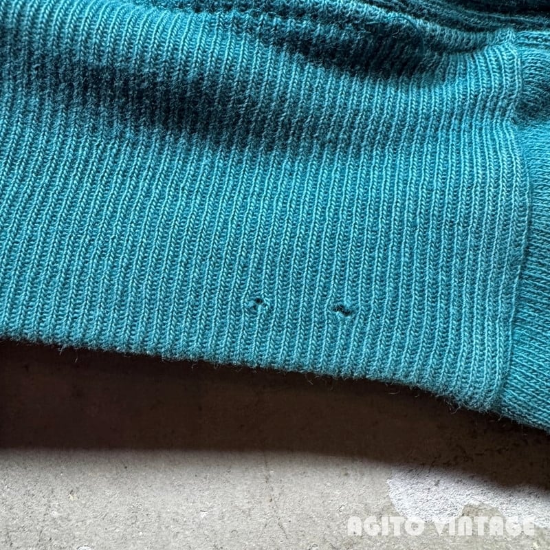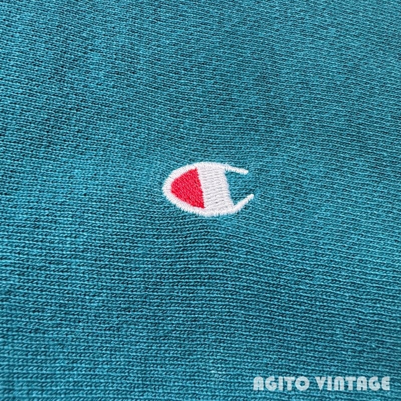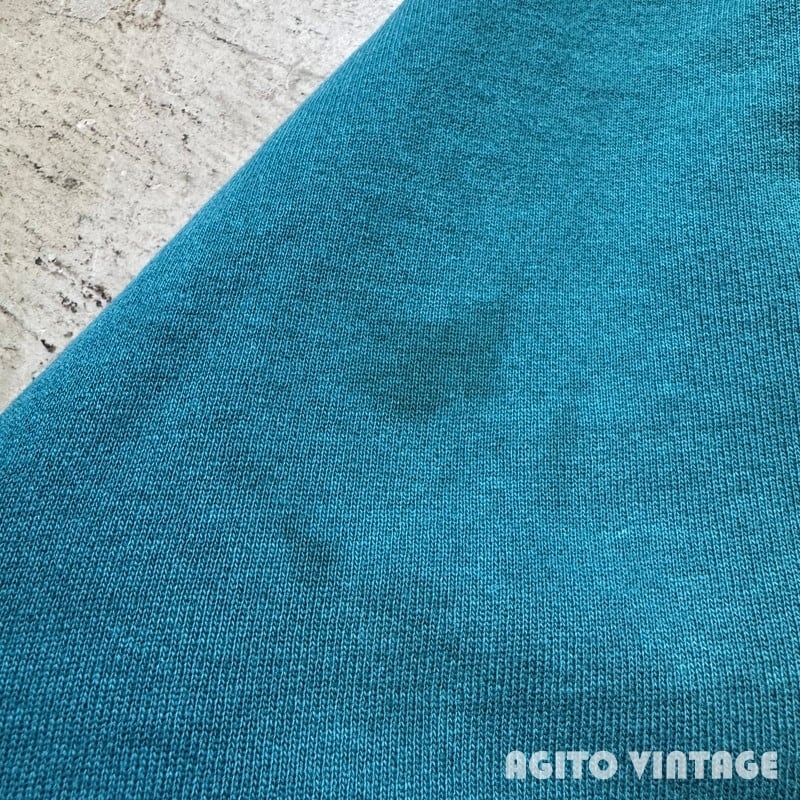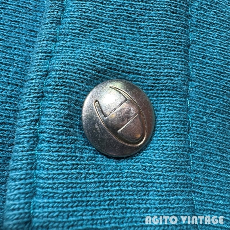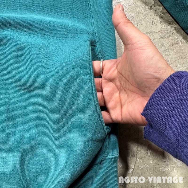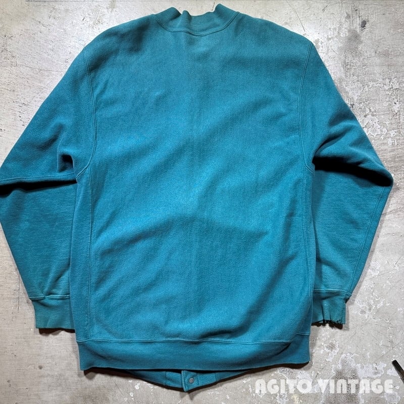 90年代のChampionリバースウィーブスナップカーディガンです。刺繍タグが付くUSA製です。色味はリバースでは見かける機会が多いですが、青みどりっぽい浅葱色(あさぎいろ)が一番近い表現かと思います。全体的にやや色褪せがあり良袖先にダメージや汚れがございます。タグは真ん中が裂けています。スナップは全て問題無く開閉できます。右肘付近に2~3cm大のシミがございます。X-LARGE表記で着丈に余裕のあるサイズ感です。カットソーや薄手のニットなどに軽く羽織れるので使い勝手の良いアイテムです。この色味がお好きな方は是非いかがでしょうか。