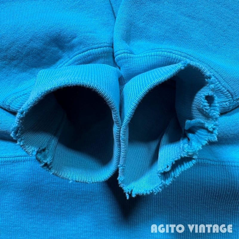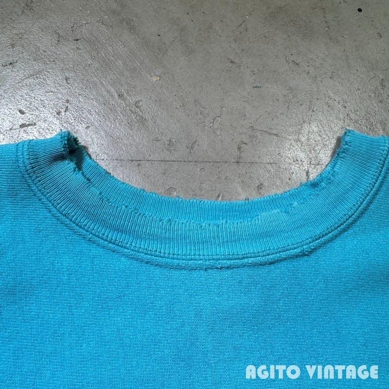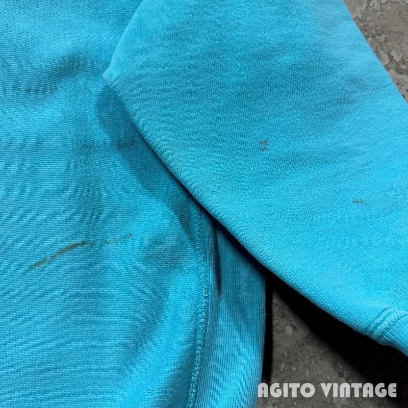 90年代のChampionリバースウィーブスウェットです。刺繍タグが付くUSA製です。1934年に誕生したリバースウィーブは現在もそのデザインはほとんど変わることなく非常に人気の高いアイテムとなっています。ご紹介するこちらは目付きと呼ばれるブランドアイコンの目玉が刺繍されたモデルでリバースウィーブの定番アイテムです。カラーリバースの中でも人気の高いターコイズです。ネック周りや袖先にダメージが見られます。全体的に色褪せも見られ、左腹部や袖に汚れがございます。その他擦れや薄汚れ等ございます。LARGE表記で程よいゆったりサイズです。定番だからこそ1着は持っておきたいアイテムなのではないでしょうか。ターコイズカラーを