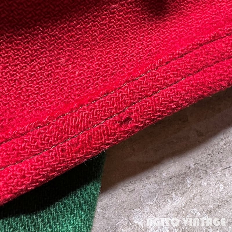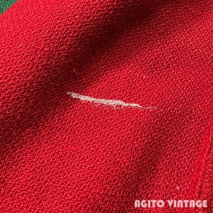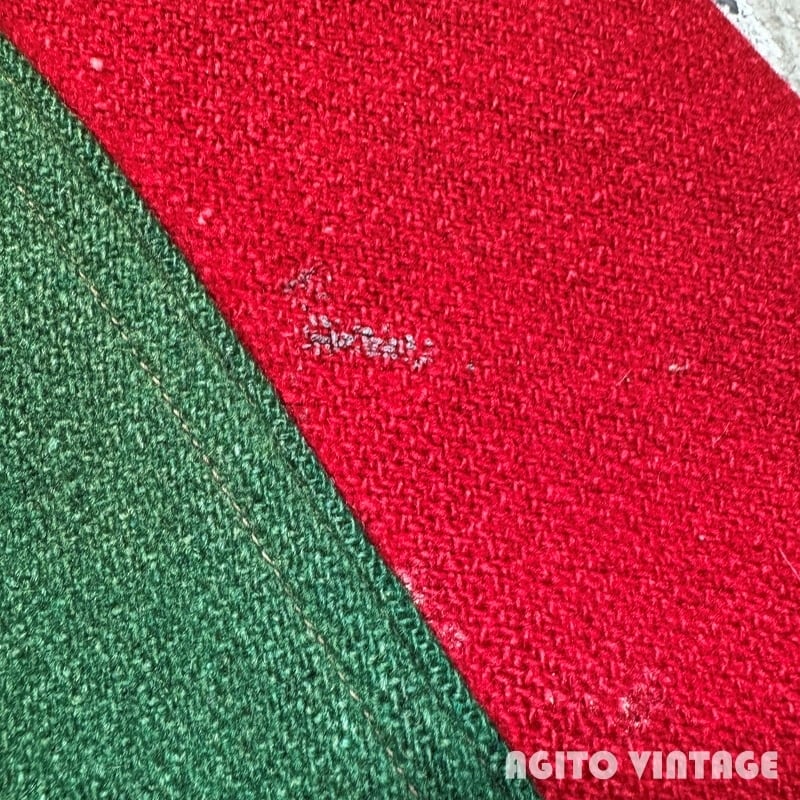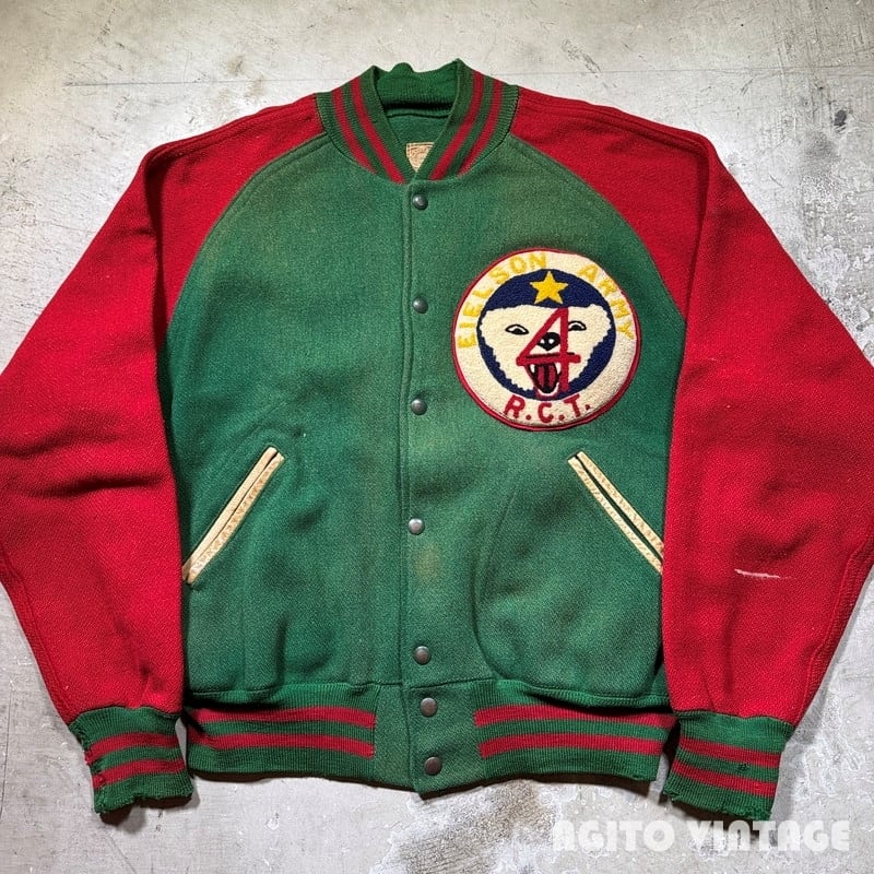 40年代頃のAHLETIC SUPPLY COMPANYのウールアワードジャケットです。ATHLETIC SUPPLY COMPANYは1932年に創業した制服やアスレチックウェア等を製造していたメーカーです。ご紹介するこちらは裏地の付かないウールで作られたアワードジャケットです。レッドとグリーンの2トーンでポケット縁にはレザーが使われており、フロントはスナップボタンが採用されています。左胸にはEIELSON ARMY 4 R.C.T.の大きなサガラワッペンが縫い付けられています。U.S.ARMY ALASKAはARCTIC WARRIOR'Sと呼ばれ、アイスホッケーチームも有していたようなので、その関連のジャケットなのかもしれません。袖のステッチ部分やリブ等に若干のダメージがございます。リブの破れた箇所は手縫いで補修されています。その他うす汚れ等もございますが、年代を考慮するとコンディションは良いのかなという印象です。サイズ表記がございませんが身幅もしっかりとありL相当の良いサイズ感だと思います。古いスタジャン自体見かける機会が少なくなってきましたが、ミリタリー関連のワッペンが付く物になるとそうそう見つからないのかなと思います。サイズも良くワッペンのインパクトも存在感があり古着好きとしての高揚感を与えてくれるスペシャルピースですのでお好きな方は是非この機会をお見逃しなく。