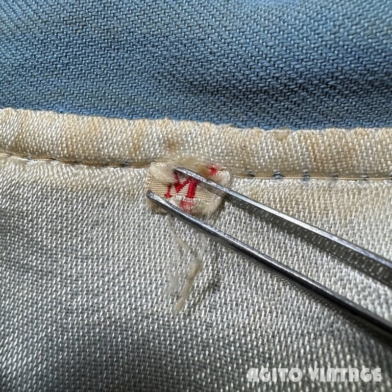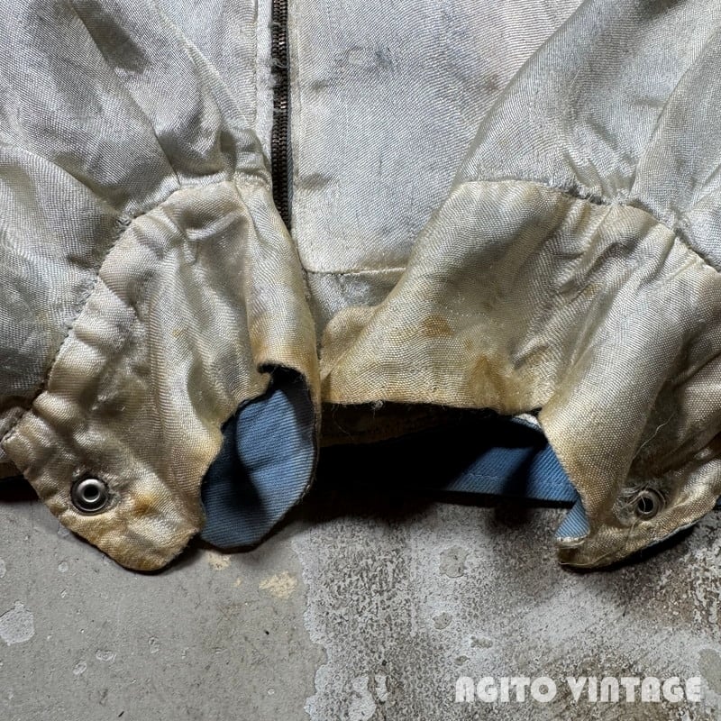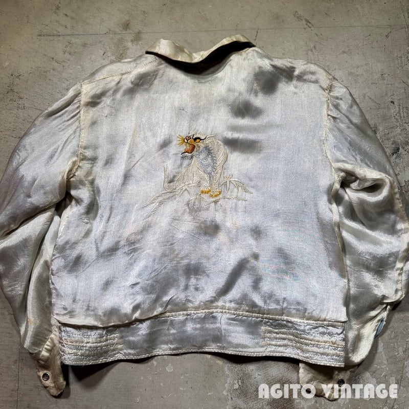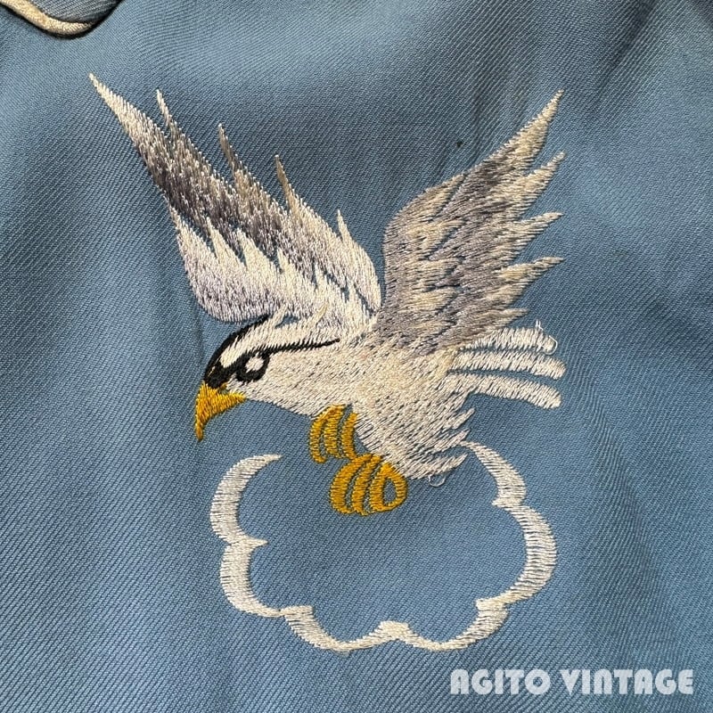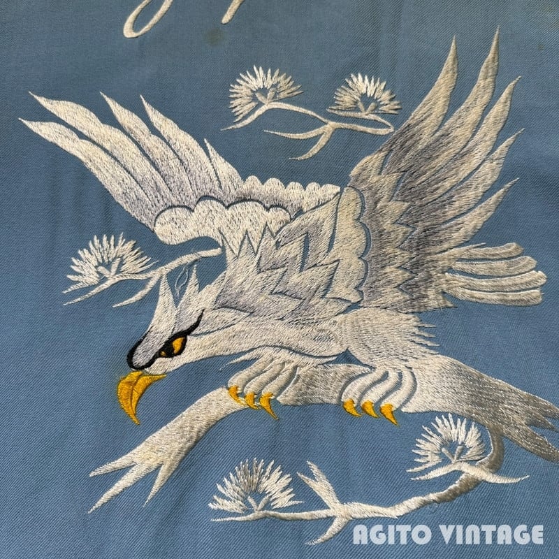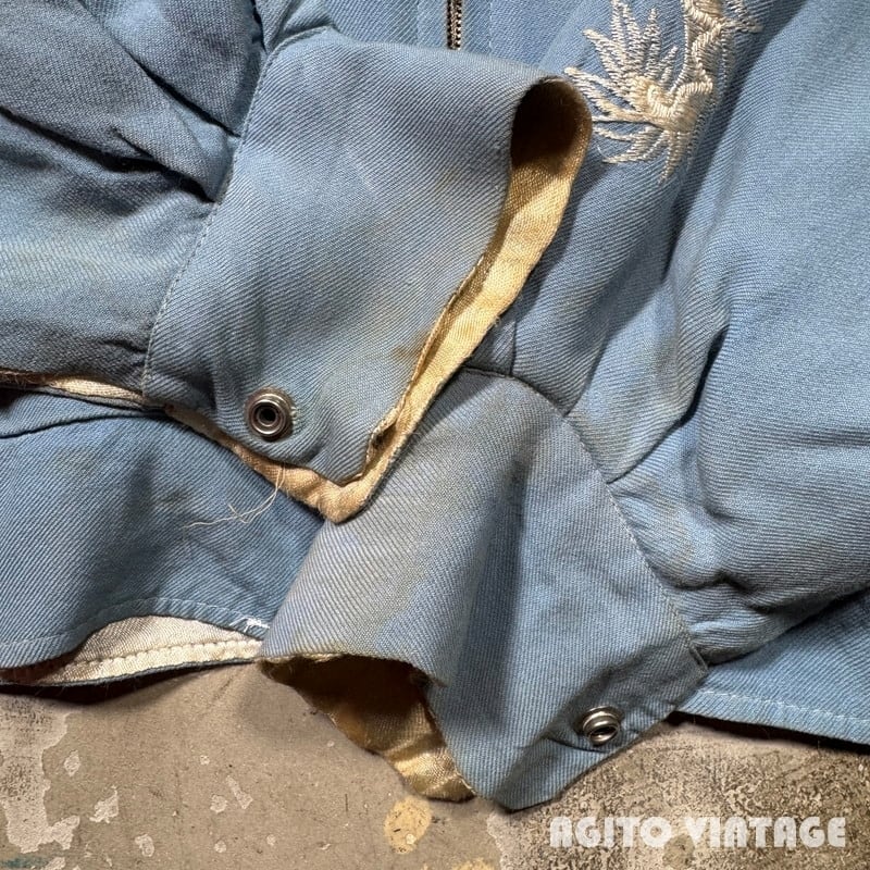 50年代から60年代頃のリバーシブルスーベニアジャケットです。スカジャン同様に当時日本に駐留していた米兵達が記念品として買い求めた土産品の一種でリブの付かないスウィングトップ型の1着です。表はサックスブルー、裏はサテンの様なパールホワイトのリバーシブル仕様です。鷹や龍、虎や富士山が各所に刺繍が施されています。YKKの回転式ジッパーが使われています。全体的に汚れや刺繍に一部ほつれなど見られ裏地面に汚れや生地にダメージが有る箇所がいくつかございます。内側脇には簡易的なハンドリペアも見られます。両袖先はスナップボタンが使われておりますが、下地にダメージが見られますので閉じていません(開閉はできますが下地に負担がかかるのでオススメしません)。M表記ですが小さめな作りですのでS相当かと思われます。小柄な方や女性にもお勧めです。数あるスーベニアジャケットでもこのスウィングトップ型をお探しの方も多いかと思います。カラーも良く良いアクセントとしてお使いいただけるのではないでしょうか。コレクションとしても良いですがサイズが合う方は是非この機会にいかがでしょうか。