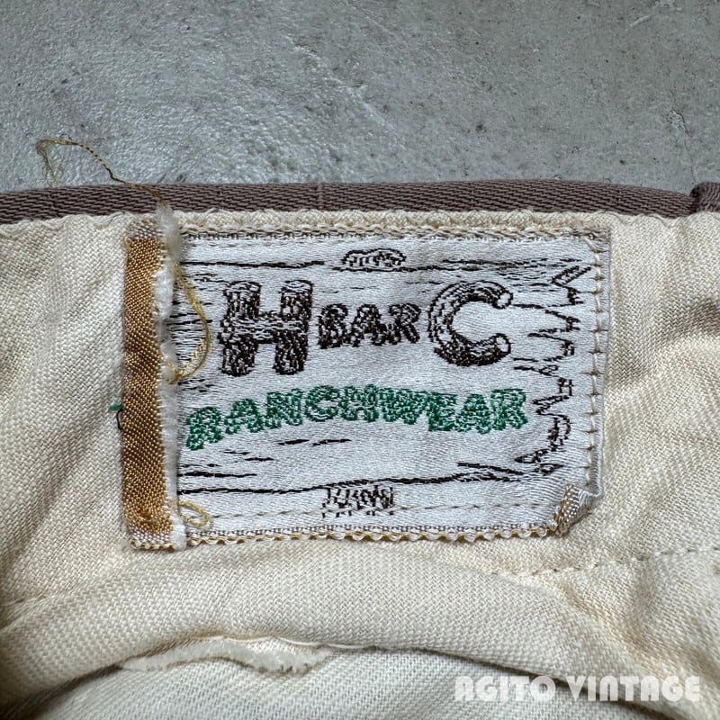 60年代頃のH BAR Cウェスタンパンツです。H BAR Cは1897年にテーラーブランドとしてブルックリンで創業し、1940年代に入りウェスタンウェアをメインに製造していたアメリカを代表するウェスタンウェアブランドです。ご紹介するこちらは、レーヨンともしかすると少しウールが混紡されているかもしれません。特徴的なベルトループとLポケ、背面のフラップポケットと王道なウェスタンパンツです。ピンクベージュカラーで絣柄が入るタイプです。フロントはCONMARのカムロックジッパーが使用されています。右のスレーキにマジックで文字が書かれています。その他細かな薄汚れやシミなどの使用感はあるものの目立つダメージは無くコンディションの良い1本です。ウエストは実寸でおおよそW33~W34インチでゆったりとしたストレートシルエットです。レングスは6cm内側に折り返しがございますので幾分伸ばせます。一般的なウェスタンパンツは無地物が多い印象ですが絣柄が入るだけでぐっと雰囲気も変わります。50~60年代ファッションがお好きな方は是非この機会にいかがでしょうか。サイズも良くオススメです。