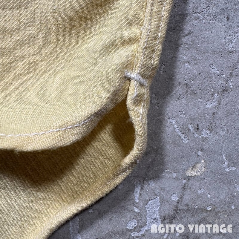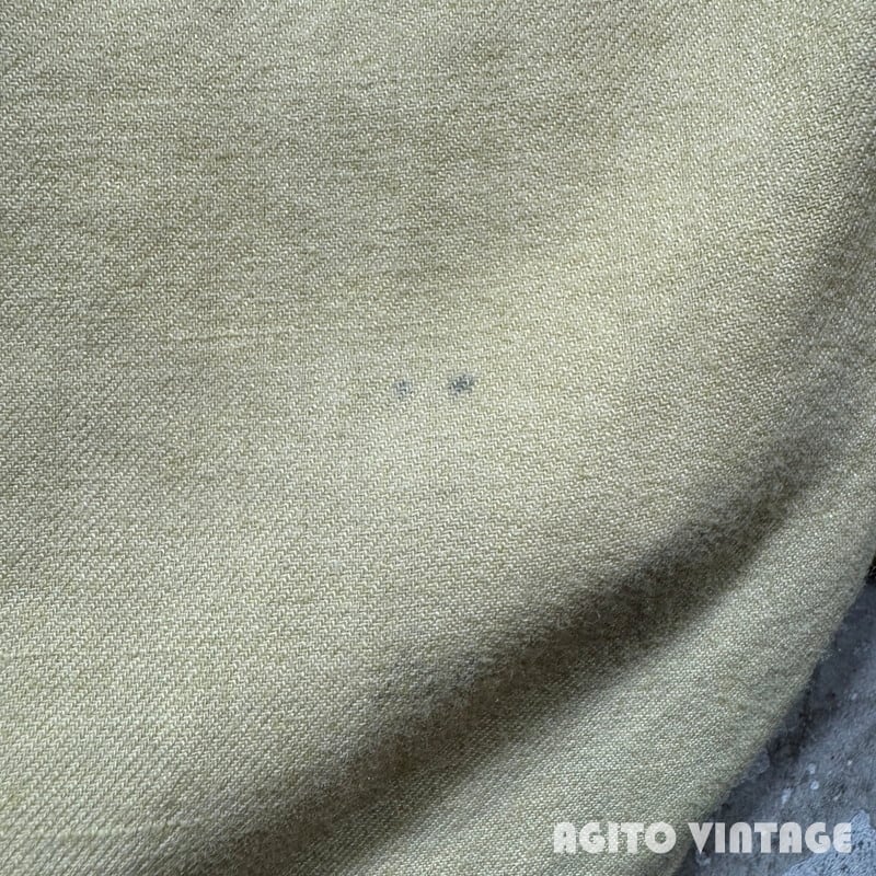40年代から50年代頃のVan Heusen オープンカラーシャツです。VAN HEUSEN は1881年に創業した140年以上続く老舗アメリカンシャツメーカーです。ご紹介するこちらはナイロンとレーヨンの混紡で淡いクリームイエローが印象的な1着です。襟は先細で長め、ループボタンが付く開襟仕様です。全てシャルボタンが使われています。サイドにマチは付きませんがボックス型ではなくラウンドテール型です。丸みのあるフラップにプリーツがあるポケットが特徴です。左袖にしみのような汚れがありその他薄汚れ等ございますがダメージは特に無くコンディションは良好です。M表記ですが少しゆとりがあるように感じます。色味も綺麗で暗くなりがちな冬のコーディーネートに良い差し色として使えます。サイズ感も良いのでお好きな方は是非この機会にいかがでしょうか。