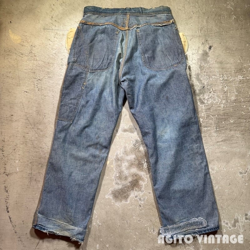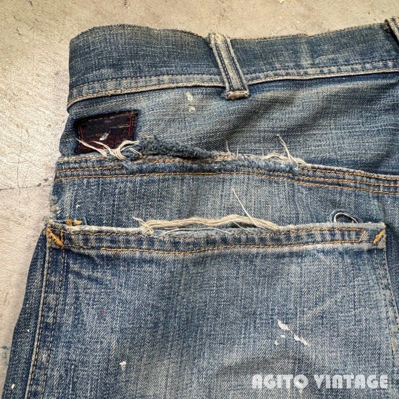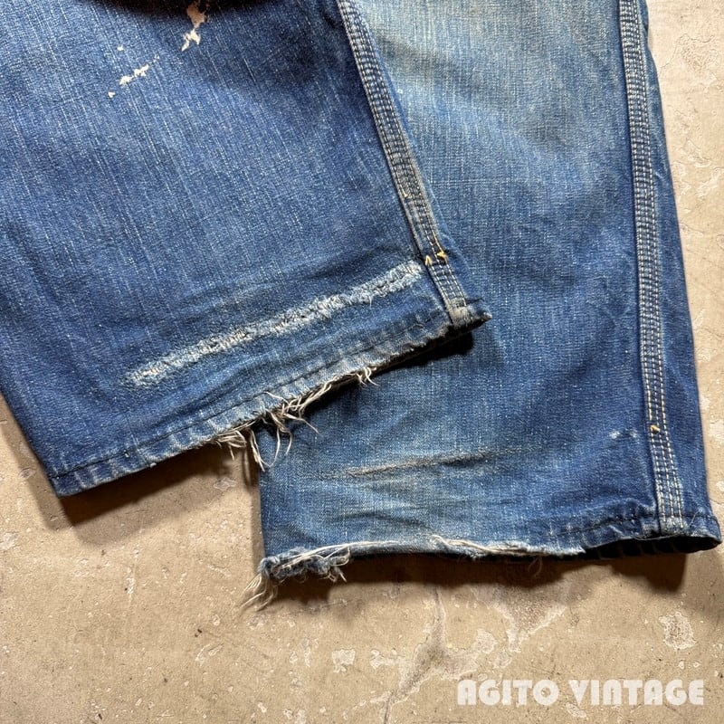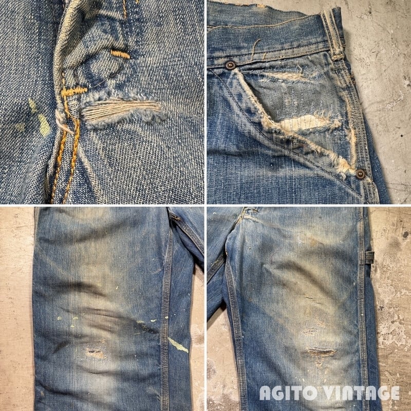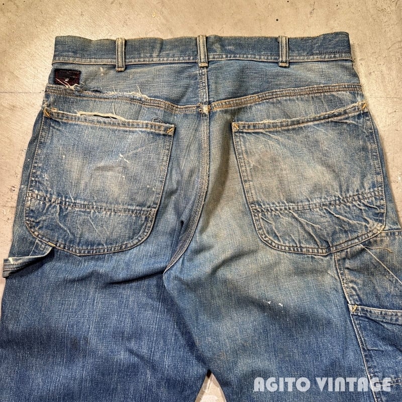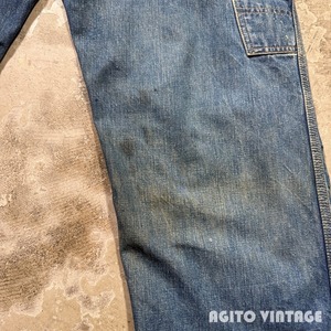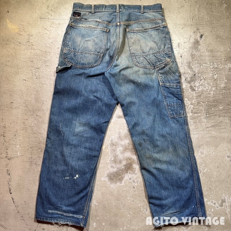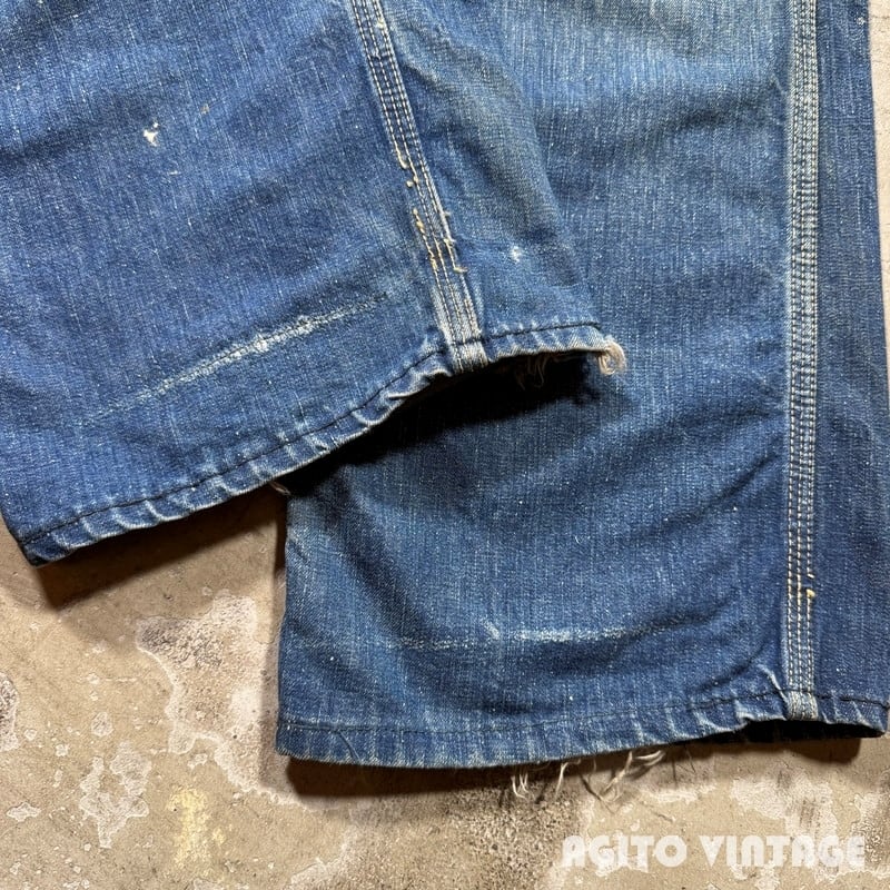 60年代から70年代初頭頃のLee191Zデニムペインターパンツです。全体的に激しく色落ちし、ペンキやダメージなどワークパンツらしい見事な面構えの1本です。フロントは42TALOMが使用されています。ポケットやスレーキ、股付け根、腿や膝、裾付近等多くのダメージやリペアが見られます。ペンキやインクの様な汚れも相まって非常に雰囲気の良い個体です。背面は良ーくやバックポケットにほつれなどのダメージがあり、両裾共にダメージがございます。ダメージやリペアはございますが生地はまだしっかりとしています。ウエストは実寸でW34程の良いサイズ感です。ストア物のペインターパンツに比べると191Zは見かける機会が減ったように感じます。ダメージ、リペアありのボロ系ですがグランジ系やリアルワークウェア等がお好きな方は是非この機会にいかがでしょうか。ヴィンテージのBeaconガウンなんかと合わせてもカッコ良いと思います。