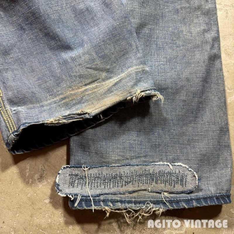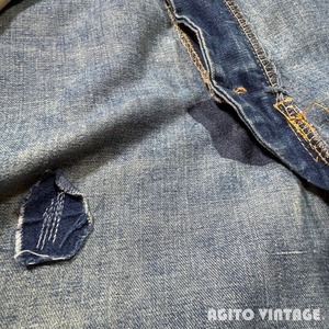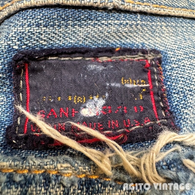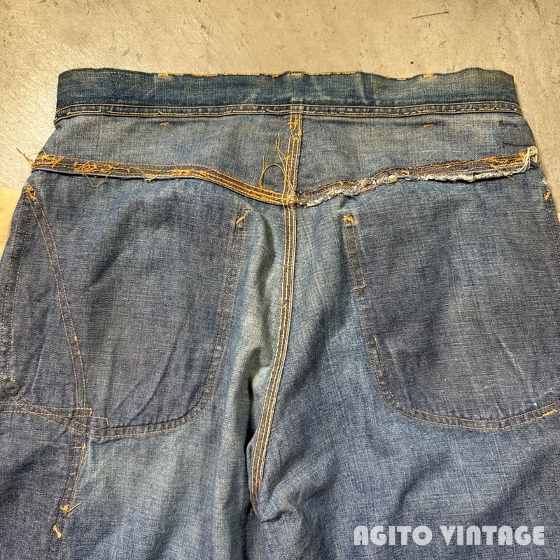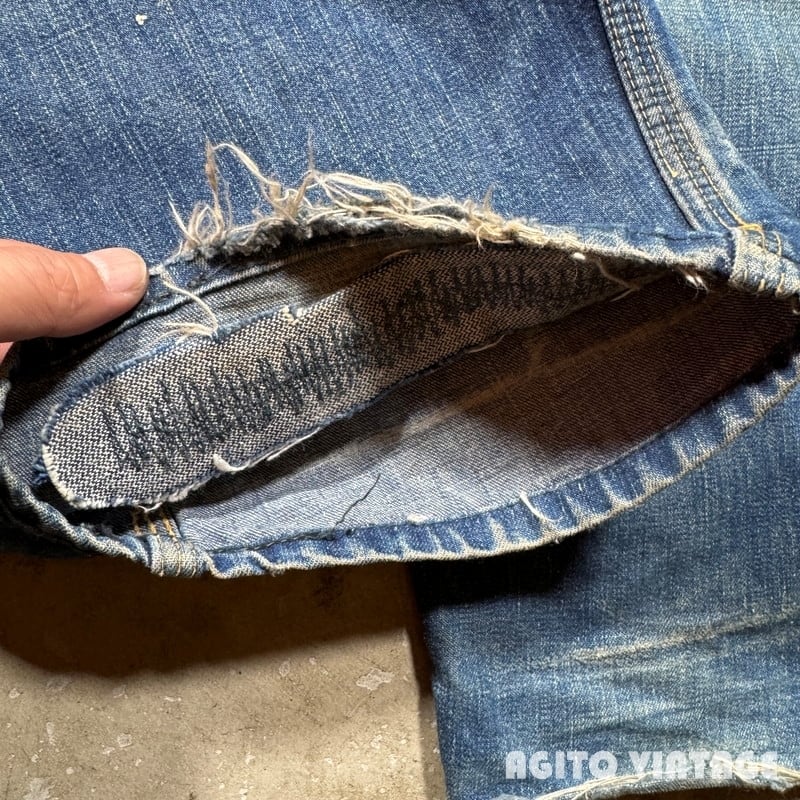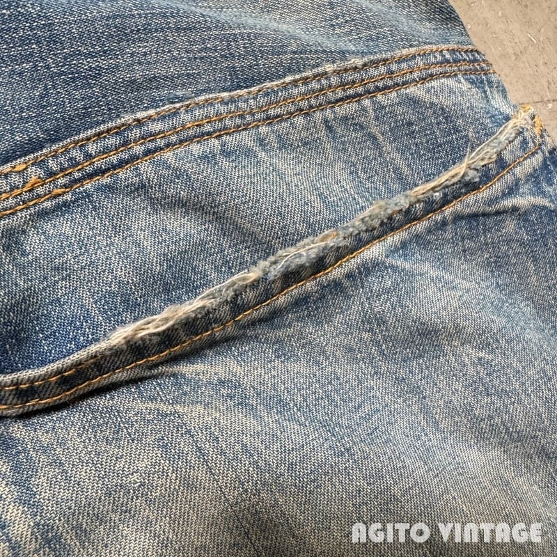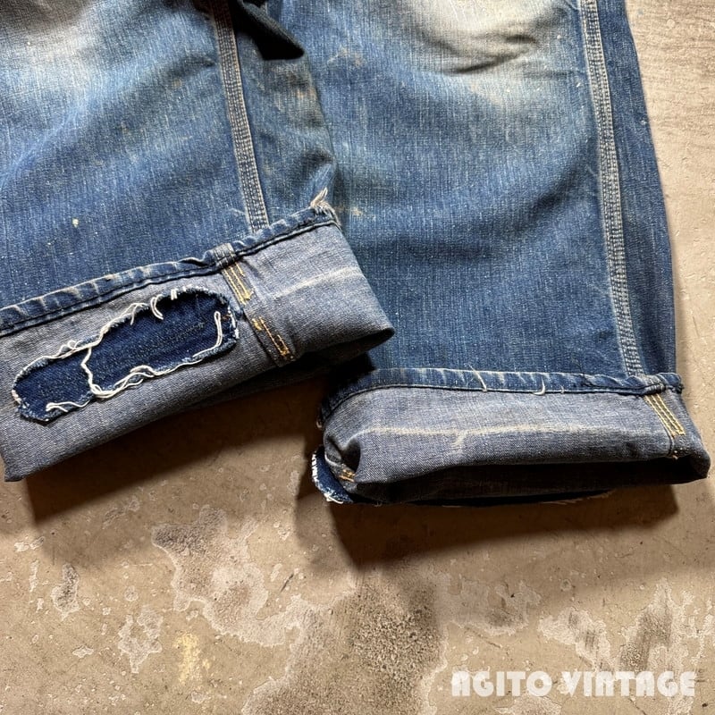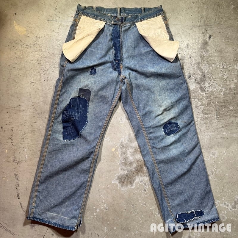 60年代から70年代初頭頃のLee191Zデニムペインターパンツです。全体的に激しく色落ちし、ペンキやダメージなどワークパンツらしい見事な面構えの1本です。フロントは42TALOMが使用されています。ポケットやスレーキ、股付け根、腿や膝、裾付近等多くのダメージやリペアが見られます。ペンキやインクの様な汚れも相まって非常に雰囲気の良い個体です。背面は良ーくやバックポケットにほつれなどのダメージがあり、両裾共にダメージがございます。ダメージやリペアはございますが生地はまだしっかりとしています。ウエストは実寸でW34程の良いサイズ感です。ストア物のペインターパンツに比べると191Zは見かける機会が減ったように感じます。ダメージ、リペアありのボロ系ですがグランジ系やリアルワークウェア等がお好きな方は是非この機会にいかがでしょうか。ヴィンテージのBeaconガウンなんかと合わせてもカッコ良いと思います。