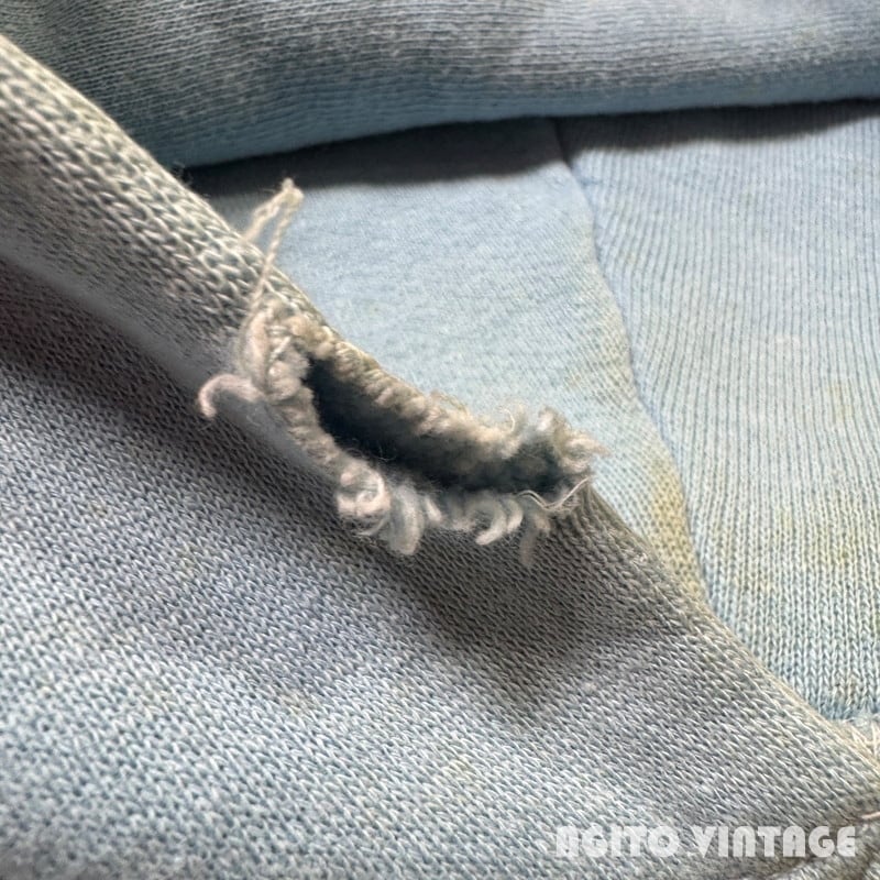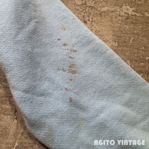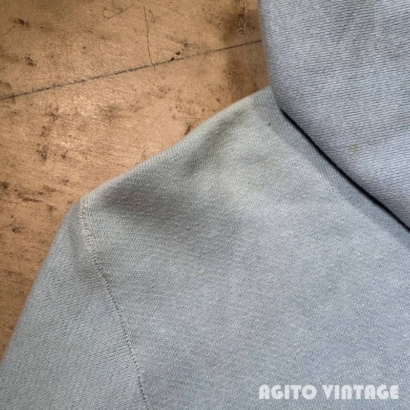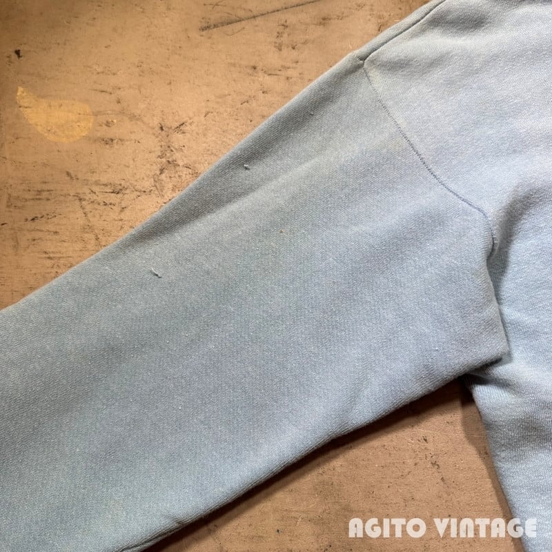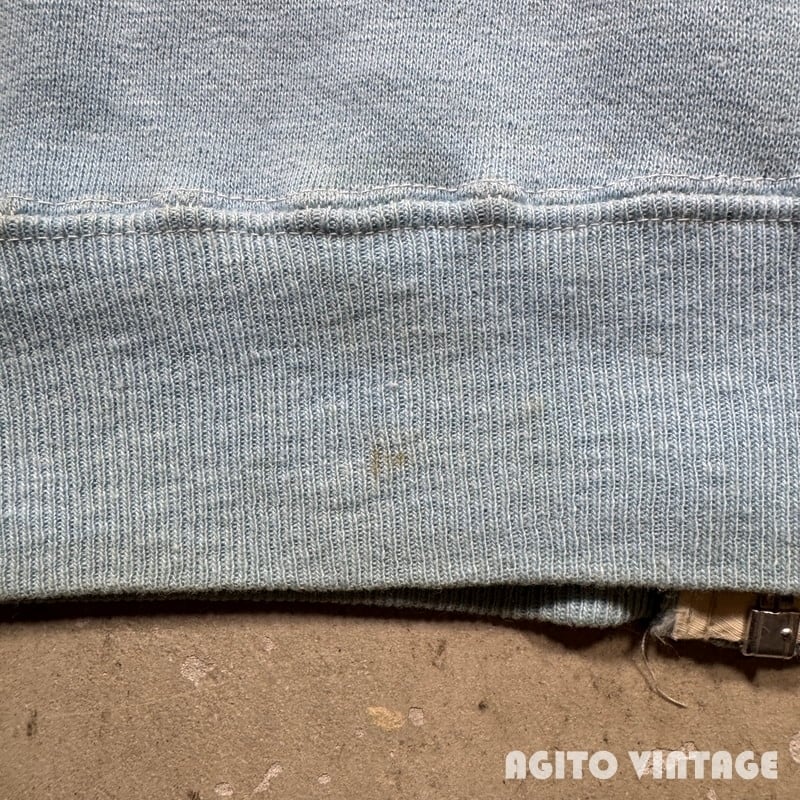 60年代頃のUnknownセパポケジップアップパーカーです。タグが欠損していますのでボディーメーカーは不明です。恐らくコットン100%と思われます。フェードしたライトブルーでフロントはアルミのTALONジッパーが使用されています。ハンドポケットはセパレートタイプでヴィンテージスウェットがお好きな方ではお馴染みのディティールかと思います。フード紐を通す穴にややダメージがございます。左袖に塗料の様な汚れが見られます。その他全体的に色褪せや薄汚れがございますが酷いダメージ等はございません。表記はございませんがM相当のサイズ感です。セパポケのジップパーカーというとグレーやレッド、グレーンが多いかと思いますので今回のライトブルーの個体はお探しの方も多いのではないでしょうか。サイズも比較的ある方なので是非この機会にいかがでしょうか。