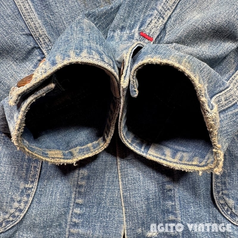 60年代頃のUnknown SANFORIZEDデニムカバーオールです。ヴィンテージカバーオールでは比較的よく見かけるのではないでしょうか。BLUE BELLやストア物でも使われている柄の入るボタンです。襟はシングルで、台襟仕様です。色残りは4割程でフロントや背面、袖先に擦れやダメージがいくつか見られます。どれも酷いダメージでは無いので簡易的なリペアさえしておけば長く着用していただけます。こちらもサイズ感は小さめで一つ前のBIG MAC同様に表記38のすっきりとした良いサイズです。色落ちの雰囲気も悪く無いので再zが合う方は是非この機会にいかがでしょうか。
