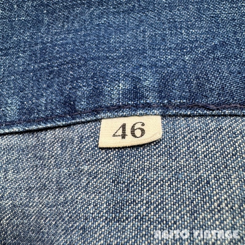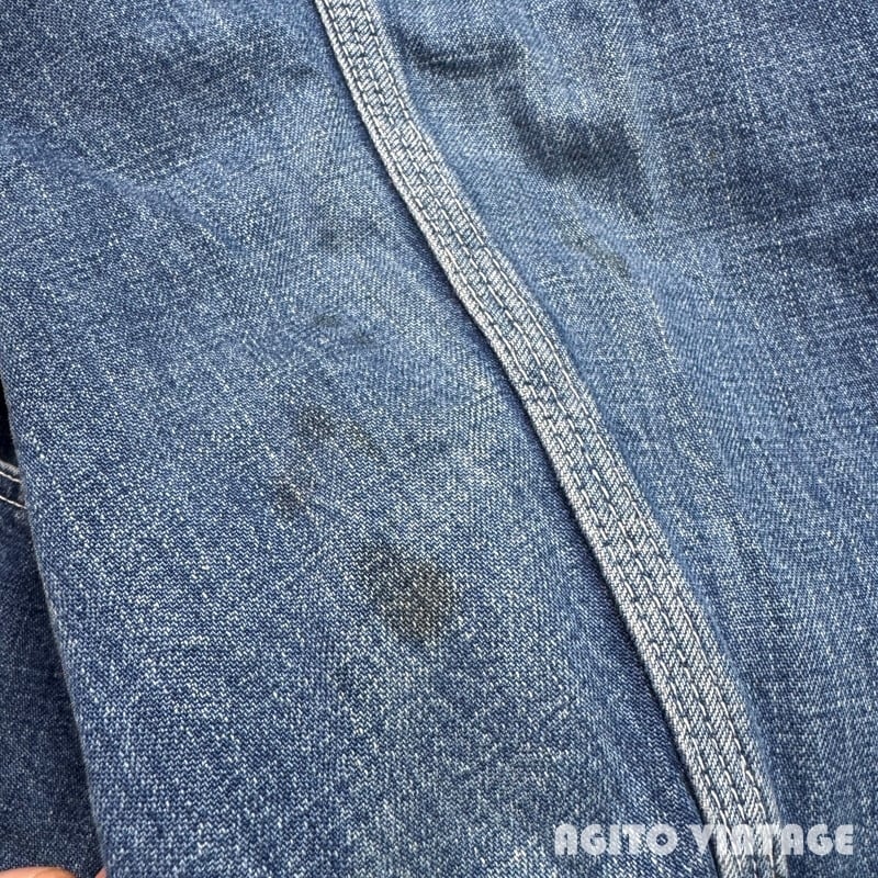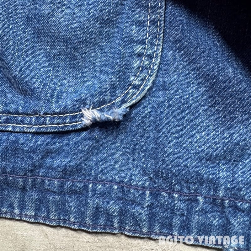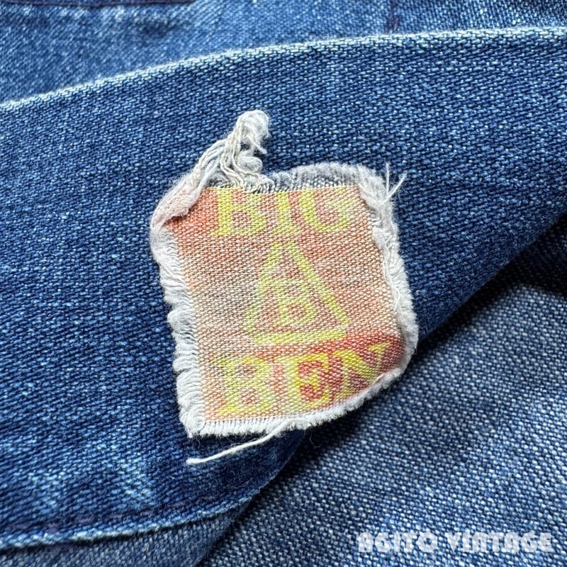 50年代頃のBIG BENデニムカバーオールです。BIG BENは1915年に創業し、後にBLUE BELL社に買収されたワークウェアブランドです。ご紹介するこちらは古いシールタグが付く1着です。色残りは4割=5割程でしょうか。ボタンはBLUE BELL等でも見られる柄の入ったボタンを使用しています。袖先に小さな擦れダメージがあり背面に2箇所ダメージが見られます。その他は目立つ汚れも無く比較的コンディションの良い個体です。サイズは46表記で身幅と着丈のバランが良いサイズ感です。古い年代で裏地の付かないカバーオールは年々見かける機会も減ってきたと思いますのでゆったり目をお探しだった方は是非この機会をお見逃しなく。