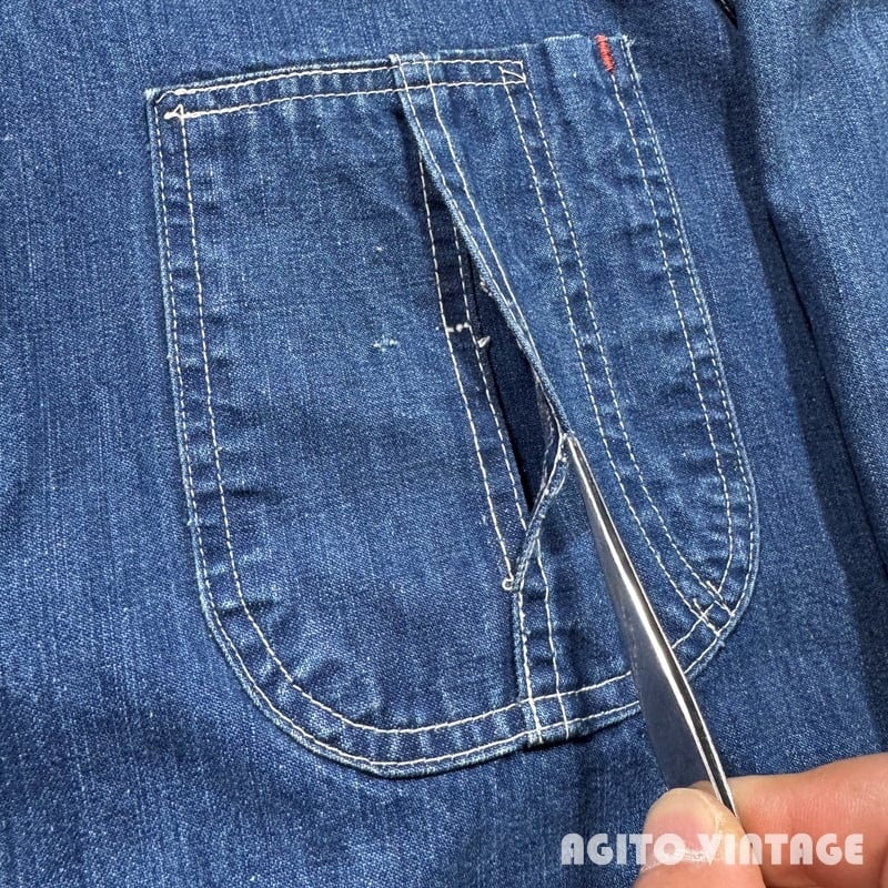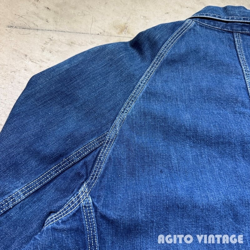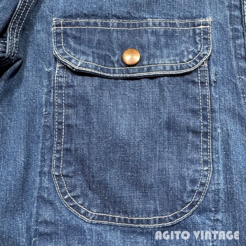 50年代頃のUnknownデニムカバーオールです。タグ等が欠損している為ブランドは不明ですが恐らくストアブランド計かと思われます。襟はダブルステッチで台襟仕様です。ラグランスリーブで、懐中時計を掛けるボタンホールもございます。BIG MAC等と同じようなブラスボタンですが刻印の入らないタイプです。左胸のウィッチポケットのすってちが解けています。左袖に小さな小穴がございます。その他細かン擦れ等はございますが、大きなダメージや目立つ汚れは特になくコンディションの良い1着です。身幅にもゆとりがあり、42-44(L相当)位の良いサイズ感です。コンディション、サイズ共に素晴らしい個体ですのでお探しだった方は是非この機会をお見逃しなく。色味も残っていますので経年変化も充分に楽しめる1着でオススメです。