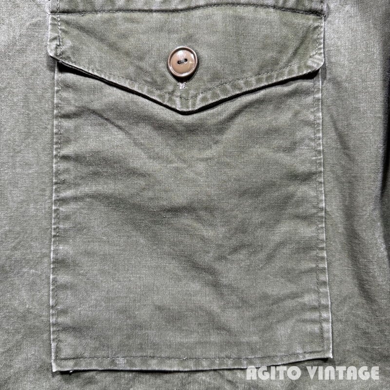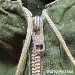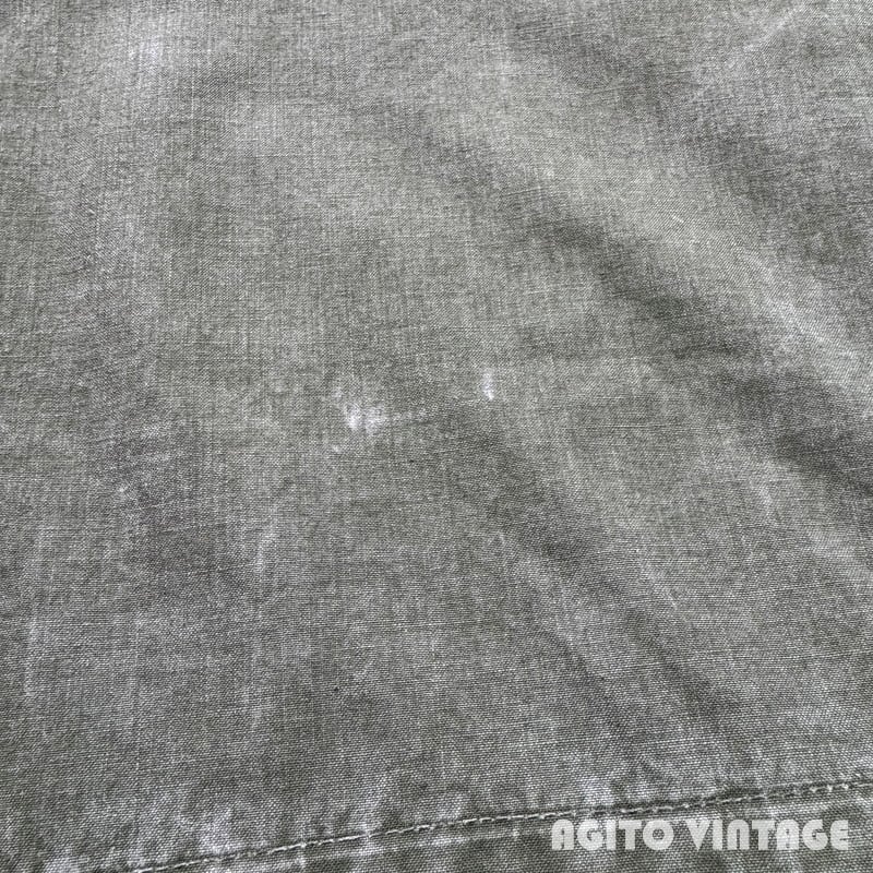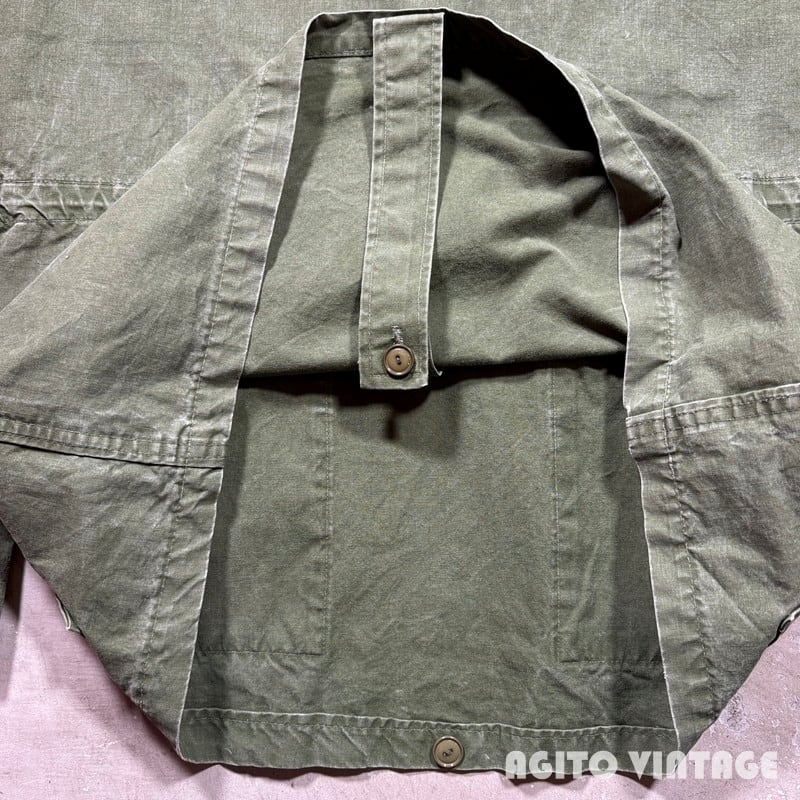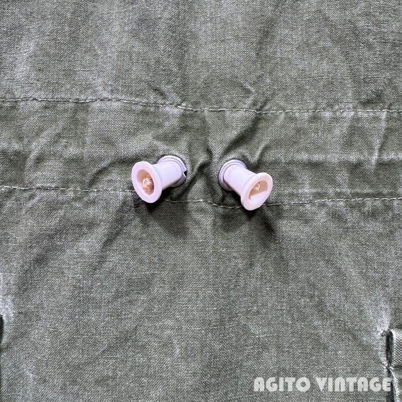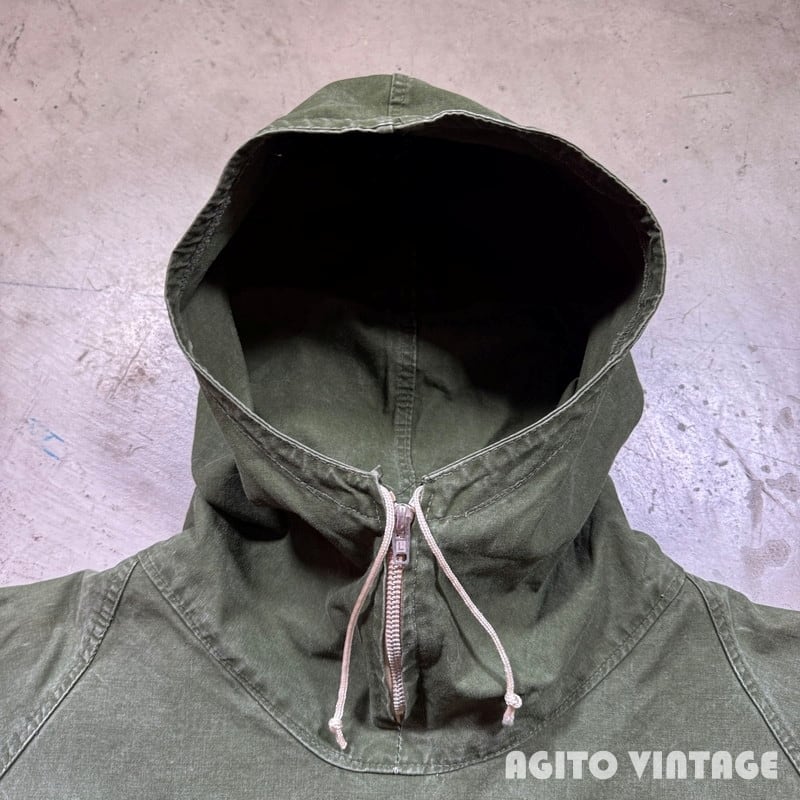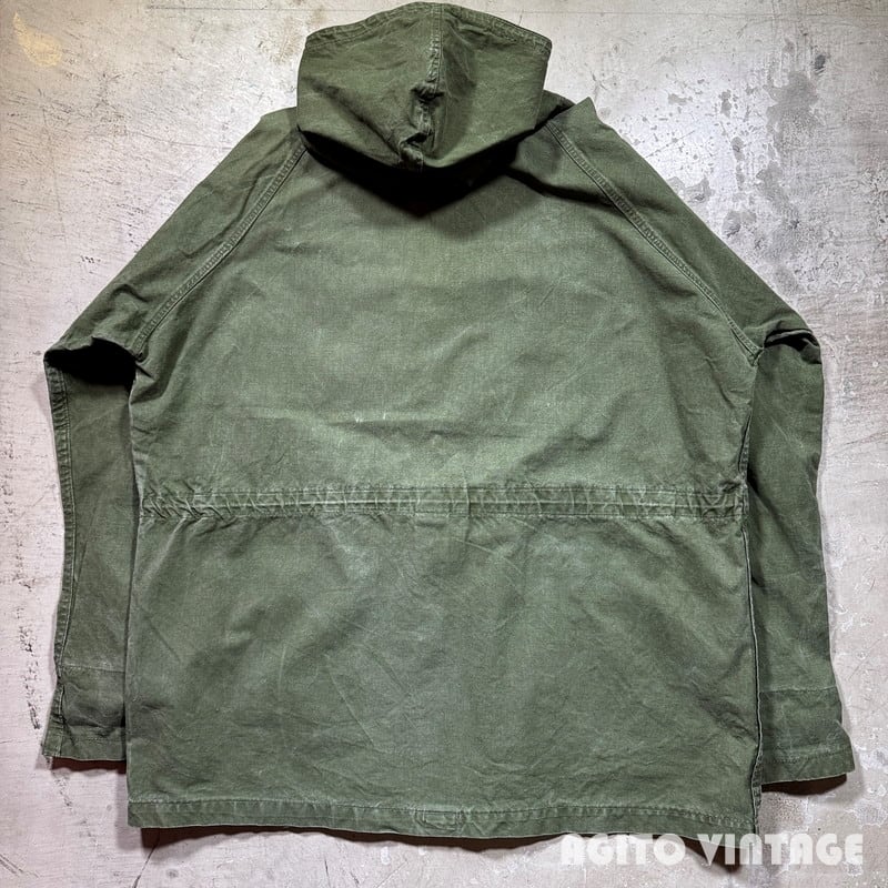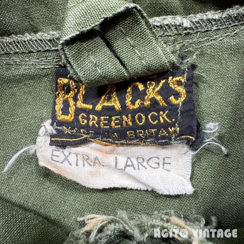 50年代から60年代頃のBLACK'S OF GREENOCK コットンアノラックパーカーです。BLACK’S OF GREENOCKは1861年に設立され現在ではテントを中心に製造販売している老舗アウトドアブランドです。ご紹介するこちらはイギリス軍のカデットスモックの原型とされる1着で、高密度に織られたコットン地が使用されており、表記はございませんがベンタイルなのかなという印象です。ラグラン仕様で生地特有のアタリが随所に見られます。フードのドローコードのストッパーが欠損しています。色褪せや細かな擦れはあるもののダメージは特に無く、コンディションの良い個体です。X-LARGE表記でゆったりと着用していただけます。ウエストにもコードがございますので絞る事でシルエットの変化も楽しんで頂けます。BLACK'S自体見かける機会は少ないかと思いますがこの大きさは滅多に出ないのではないでしょうか。イギリスアウトドア界の名門BLACK'Sの名作スモックをお探しだった方は是非この機会をお見逃しなく!
