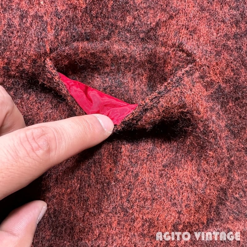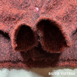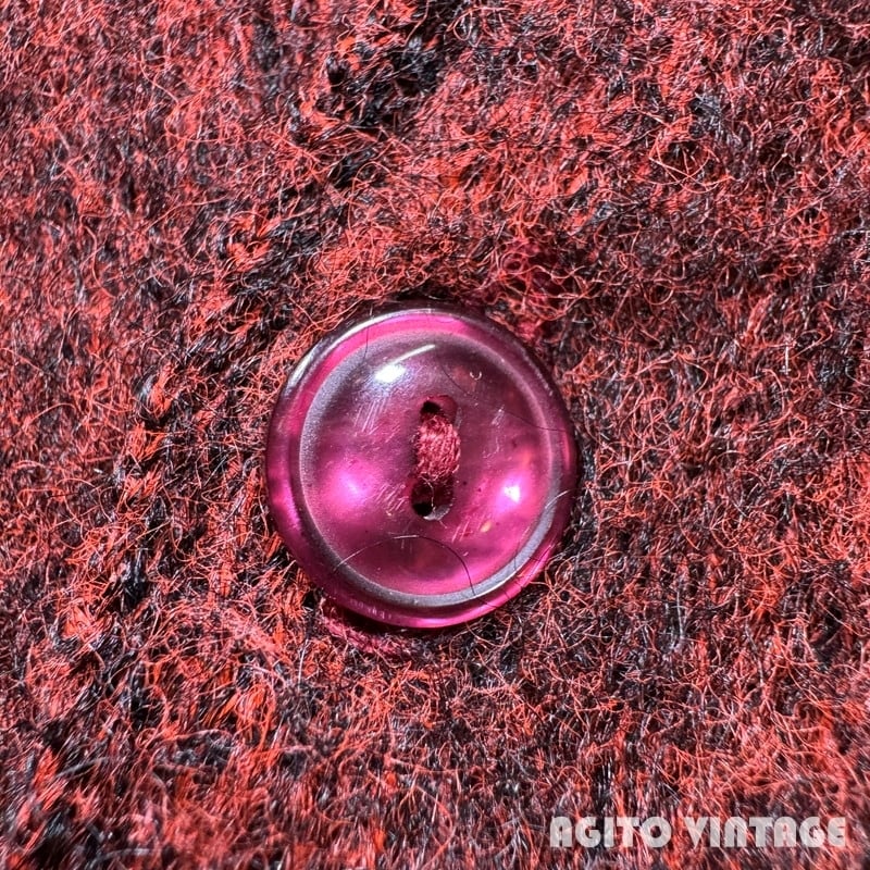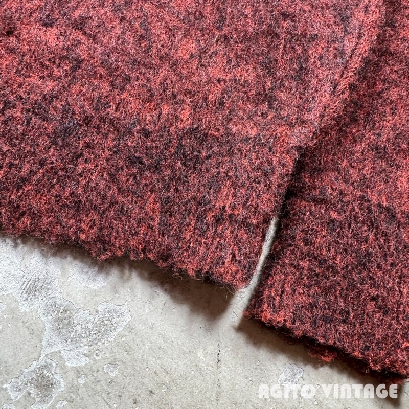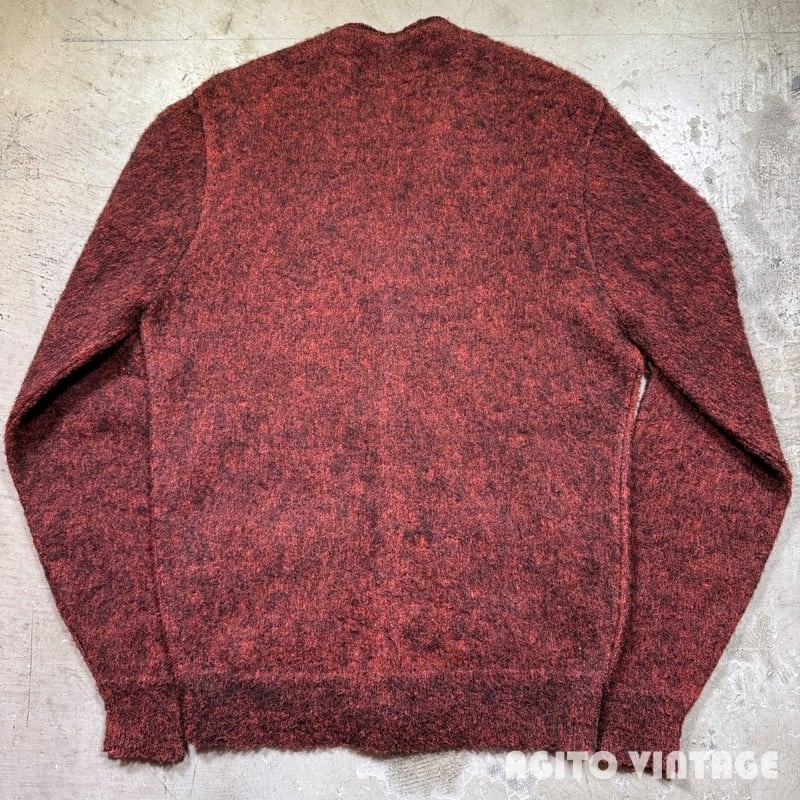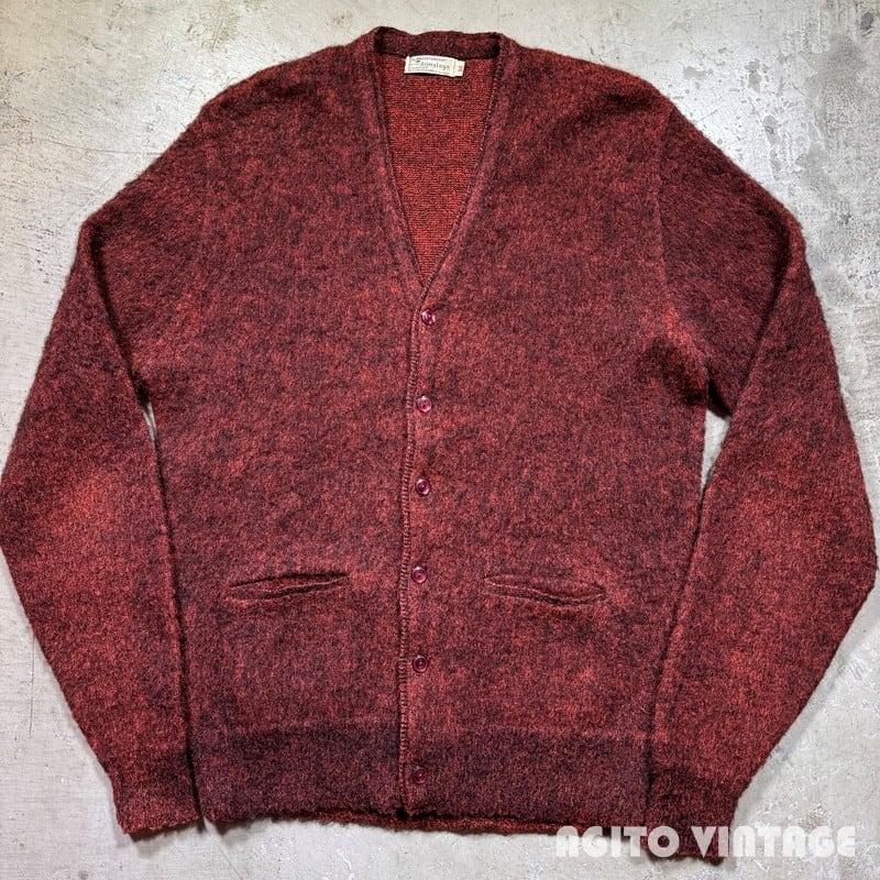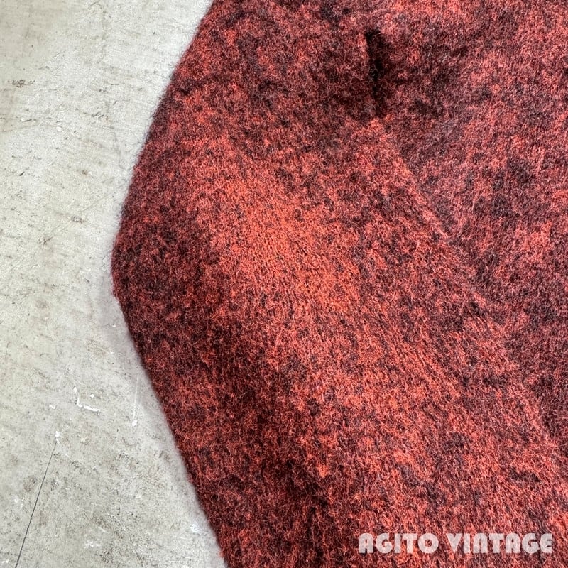60年代頃のthe Moonshiner KNIT BY himalaya モヘアカーディガンです。ブランドの詳細は不明ですがこの年代あたりでモヘアを使用したアイテムなどを製造していたブランドの様です。モヘア67%と割合の高い1着です。オレンジとブラックのミックスカラーで毛足は短めです。両肘にやや擦れがあり、細かな毛玉や毛羽立ちの使用感はございますが目立つ虫食い等なく状態は良好な個体だと思います。Mサイズ表記ですのでユニセックスで着やすいサイズ感です。この辺りのモヘアカーディガンはブルー系が多い印象ですのでこちらのオレンジ×ブラックのミックスカラーはお探しの方も多いのではないでしょうか。ヴィンテージのスラックスからデニムはまで幅広いスタイルで使い易い1着ですので是非この機会にいかがでしょうか。