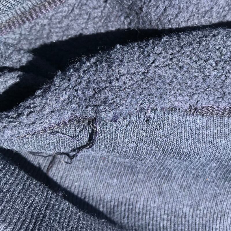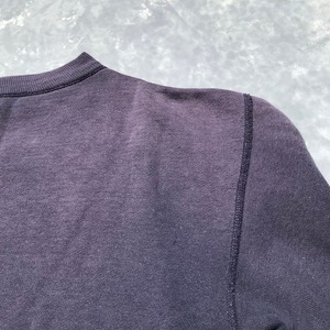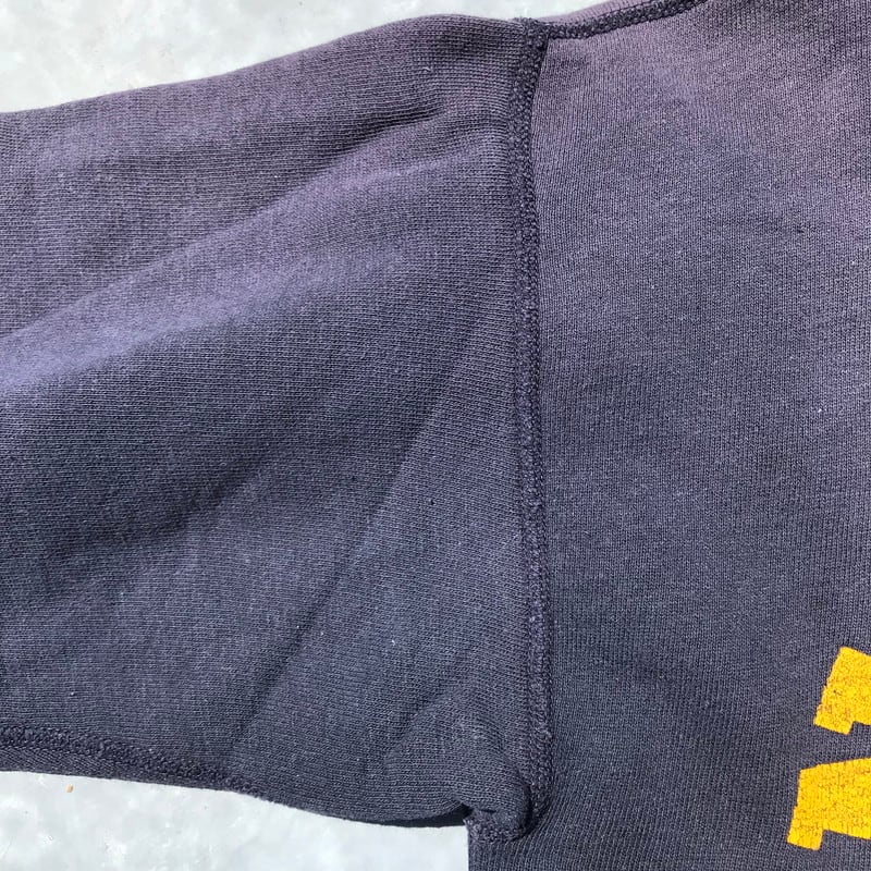 50年代から60年代頃のChampionスウェットトレーナーです。ランナーズタグ(ランタグ)と呼ばれるタグが付き、大文字表記デセットインスリーブですので、50年代カラ60年代頃と思われます。フロントにはヴィンテージスウェットでもなじみ深いNOTRE DOMEの文字がプリントされています。全体に色味は濃いですが、肩周りは程よくフェードしており、ナス紺のようなエイジングが期待できそうです。プリントに擦れがあり、フロント左下のリブの付け根が一部ステッチがほつけていて手縫で縫い直されています。Mサイズですので、女性も着やすいサイズ感でおススメです。