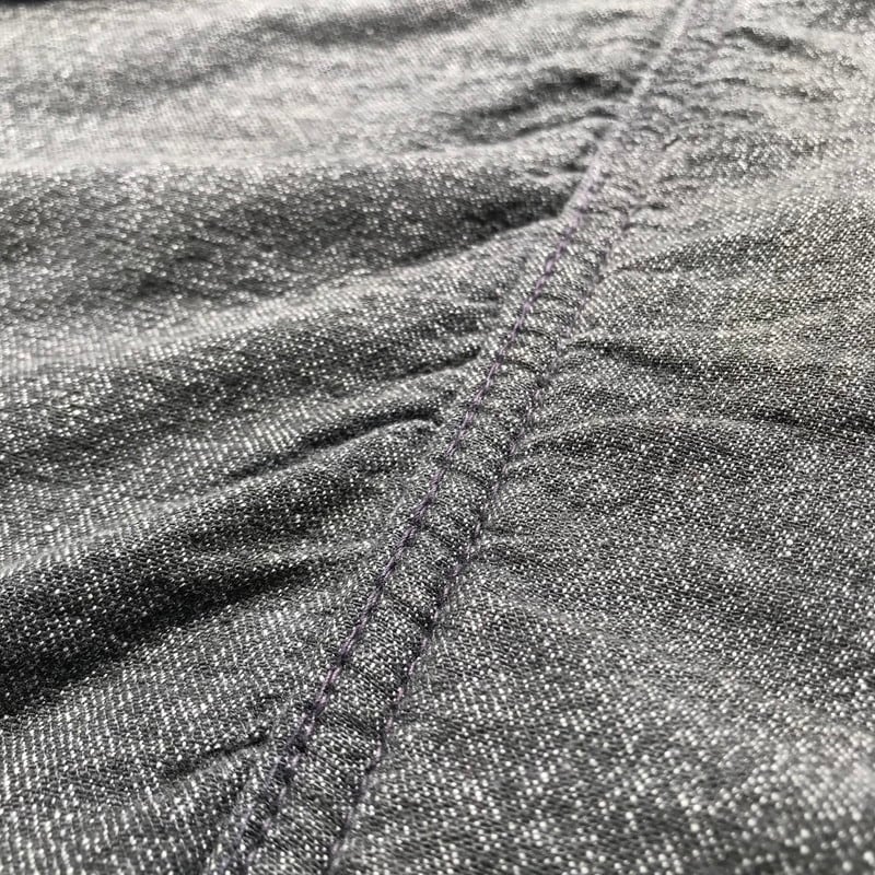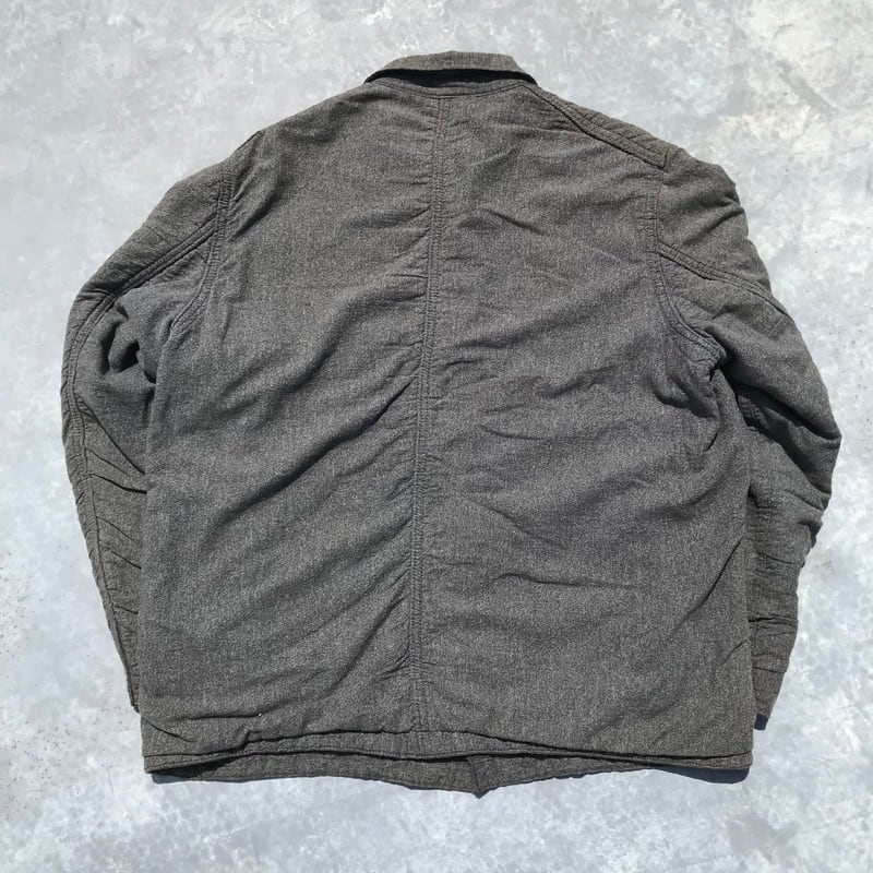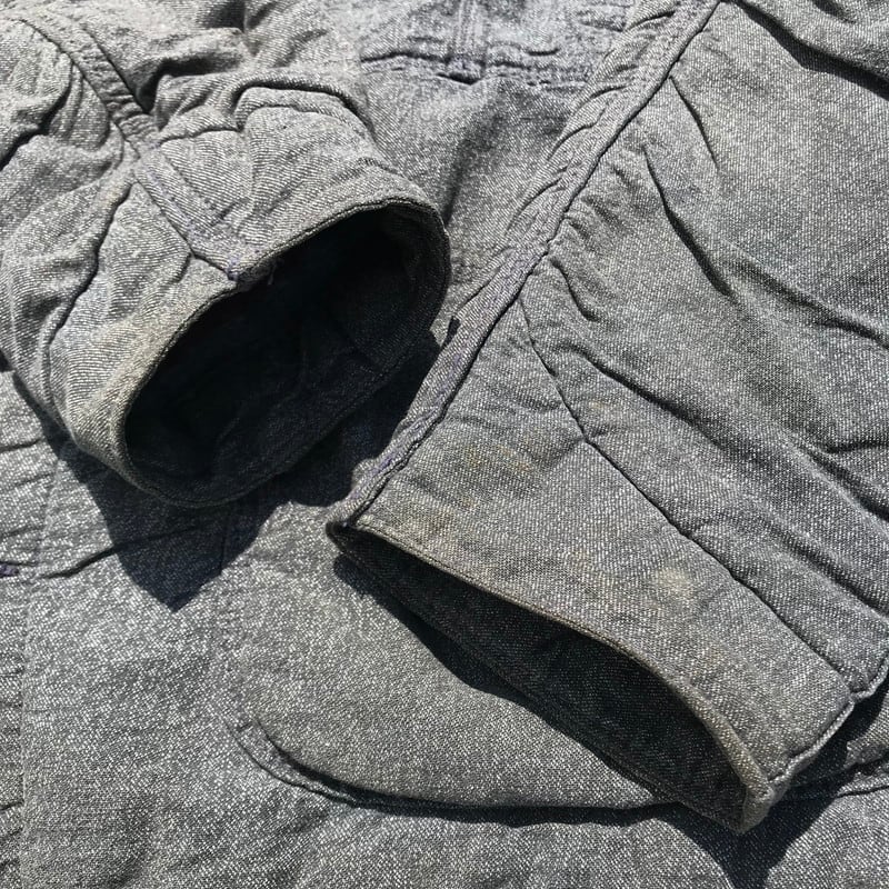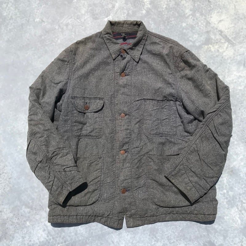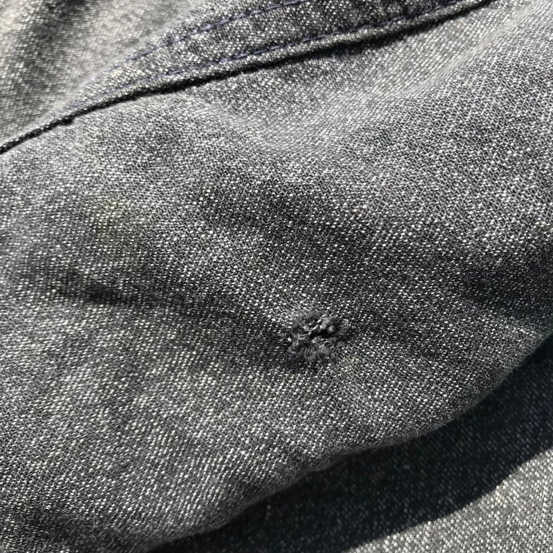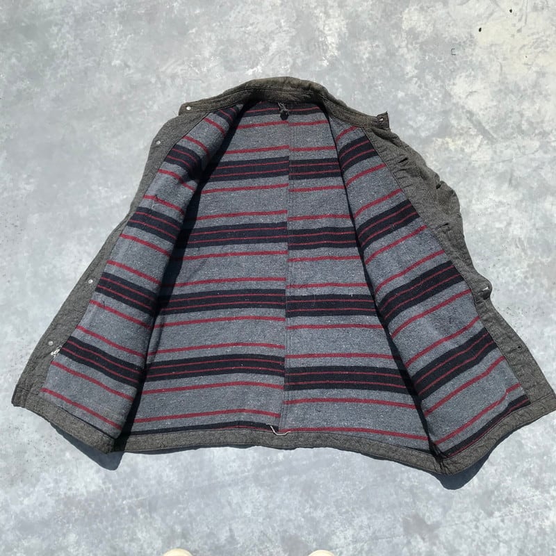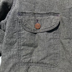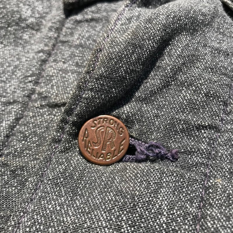 アメリカの3大ストアSearsが展開するプライベートブランドです。ヴィンテージ市場でも人気のブラックシャンブレーにブランケット地がライニングに使用されているモデル。縫製はほとんどがダブルステッチですが、補強のためか縫いかえしでトリプルステッチのようになっている箇所も見られます。右袖に小穴があり、全体にうっすらと汚れがございます。生地の特性上後身頃に縮みがあり、生地がたわんでいます。あまり見かけないSTRONG RELIABLEの黒シャン、ワークウェア好き必見です。