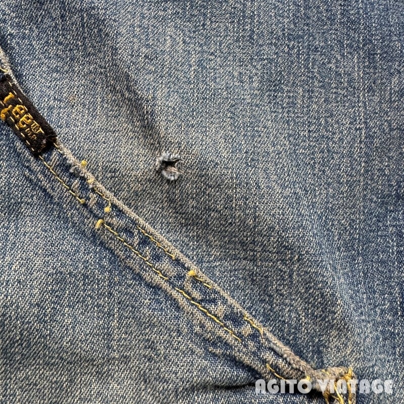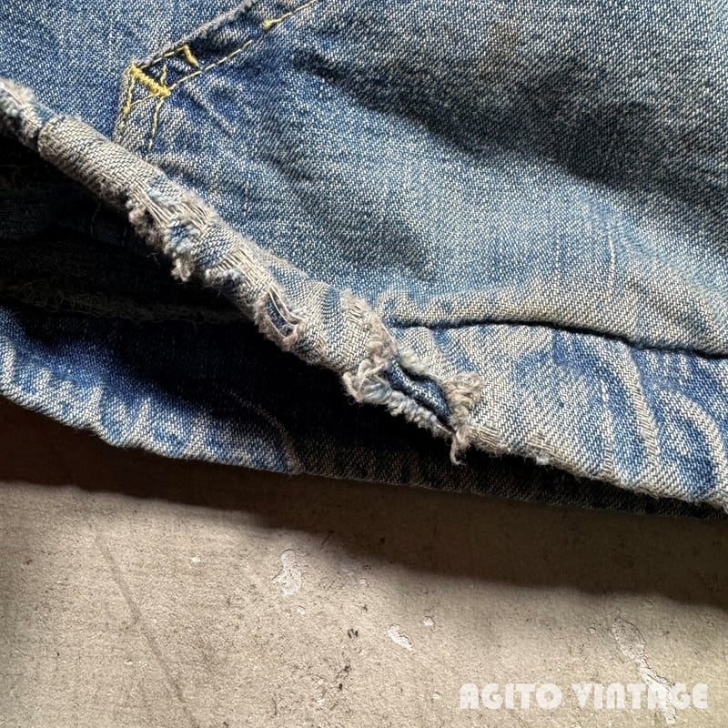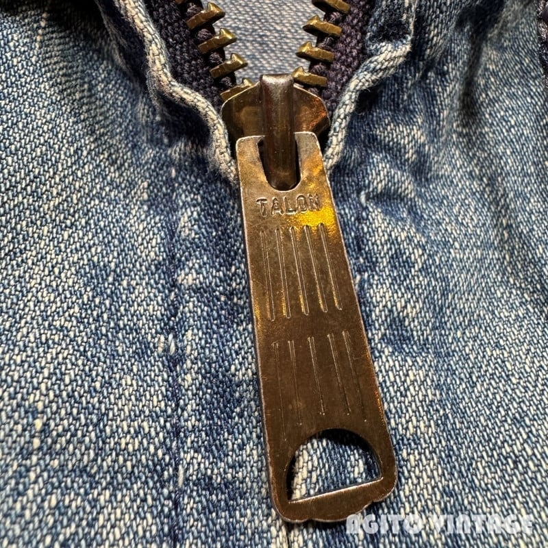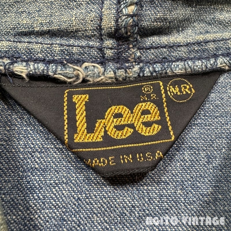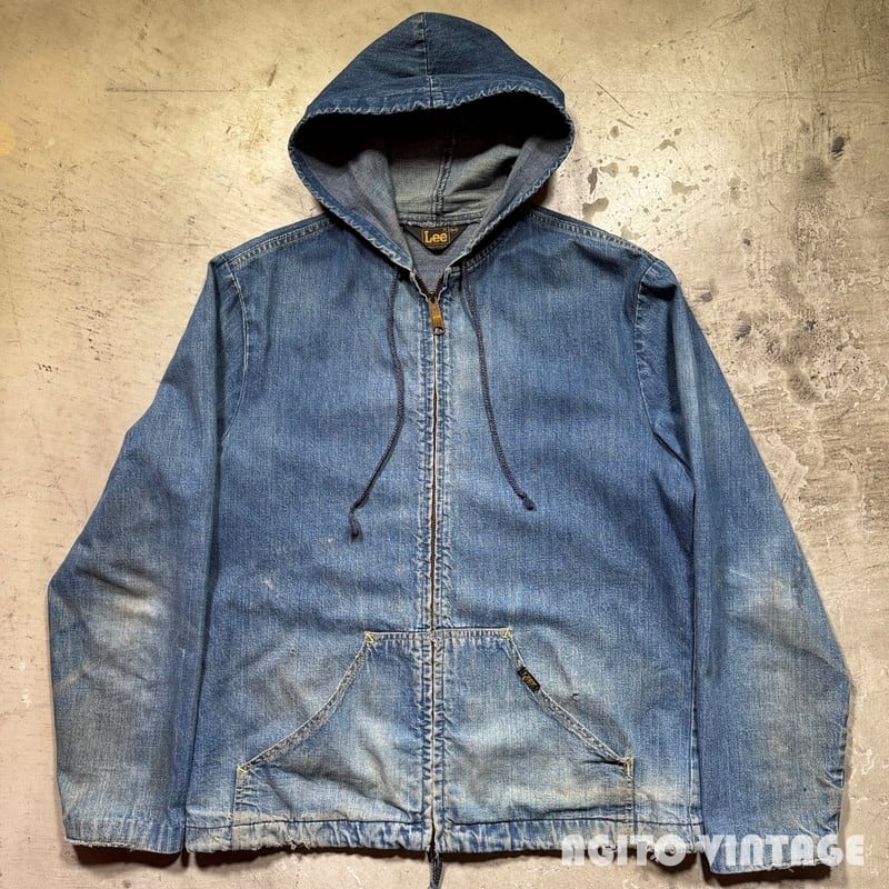 70年代頃のLeeジップアップデニムパーカーです。三角の黒い吊りタグが付くUSA製です。ペインターパンツ等で使われるライトオンスデニムを使用していますのでデニムながらもごわつきはございません。フロントにはブラスのTALONジッパーが採用されています。首タグ、ピスネーム共に®MR表記が入ります。全体的に色落ちが見られ、袖先や裾、ポケットや背面等にダメージがございます。ライトオンスデニムならではの荒々しい色落ちで袖にはうっすらとハチノスも見られます。サイズはMR(MEDIUM REGULAR)表記です。ライトオンスデニムで薄手なので通年使える万能アイテムだと思います。ダメージなどございますが色落ちの雰囲気も良くワークパンツなどとの相性も良いと思います。特徴的なアイテムではありませんが1着あると何かと使えますのでオススメです。
