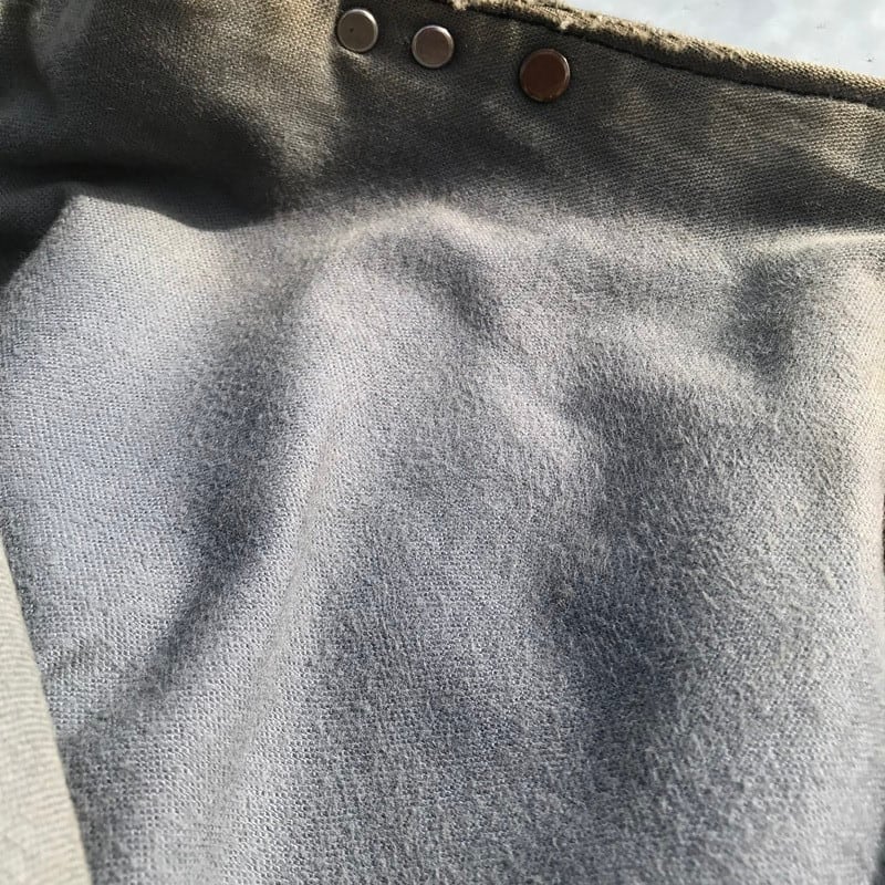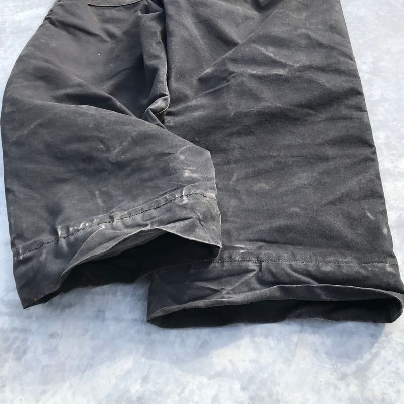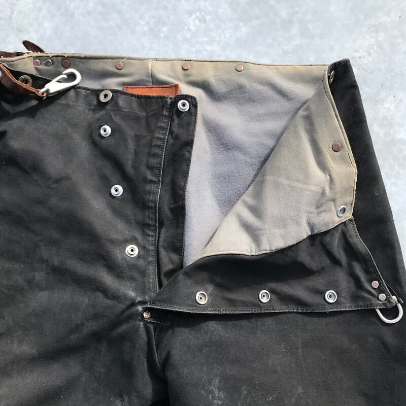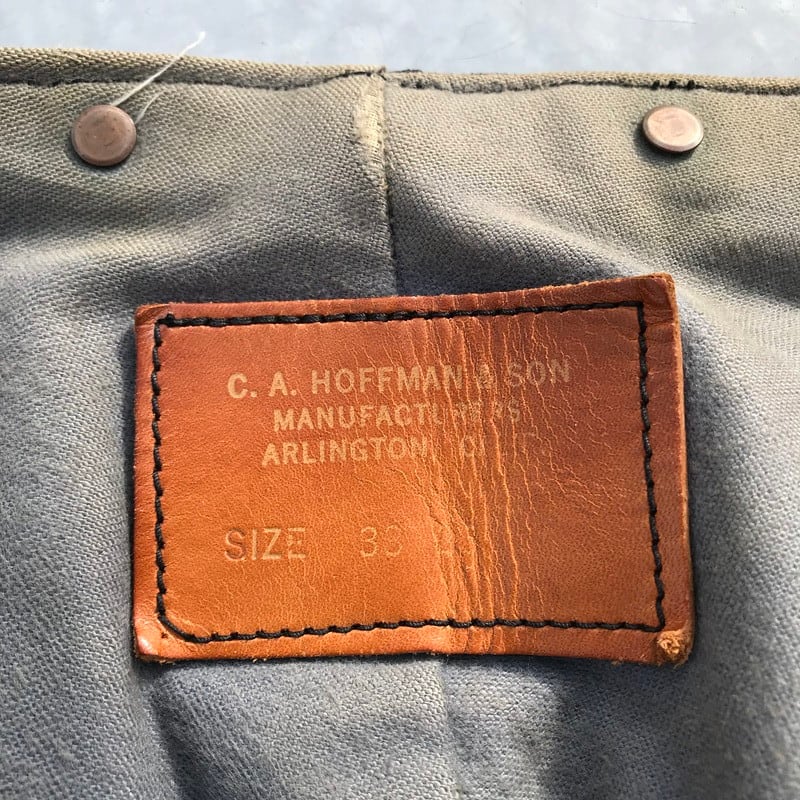 C.A.HOFFMAN&SONというレザーのガンホルダーや、ポストマンバッグ等を手がけていたブランドのファイヤーマンパンツです。あまり聞きなれないメーカーですが、ファイヤーマンジャケットも製作していたようです。作りもしっかりとしていて、表は上部なキャンバス地、裏地はコットン、そして表と裏の間にテント素材のターポリンのようなしっかりとした素材があり、水にも強い作りとなっています。ウェストのサスペンダーボタンは月桂樹ボタンを使用しており、ウエスト内側にレザーパッチが付きますが、30~40年代の物に比べ古くなさそうです。濃いグレーのようなブラックが所々擦れて雰囲気のある1着です。