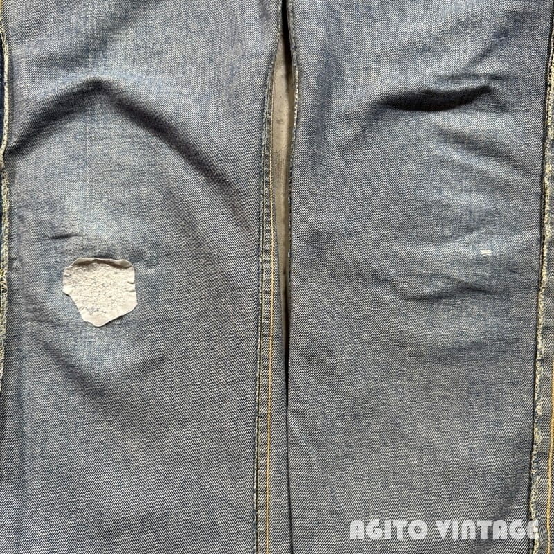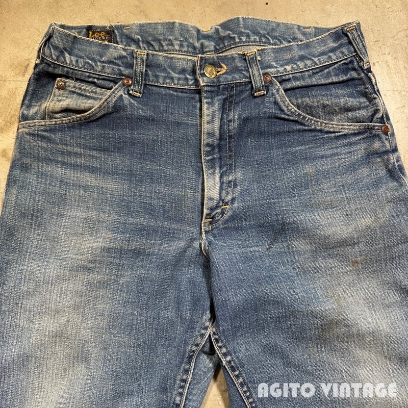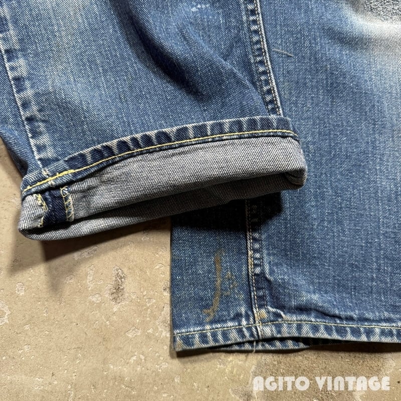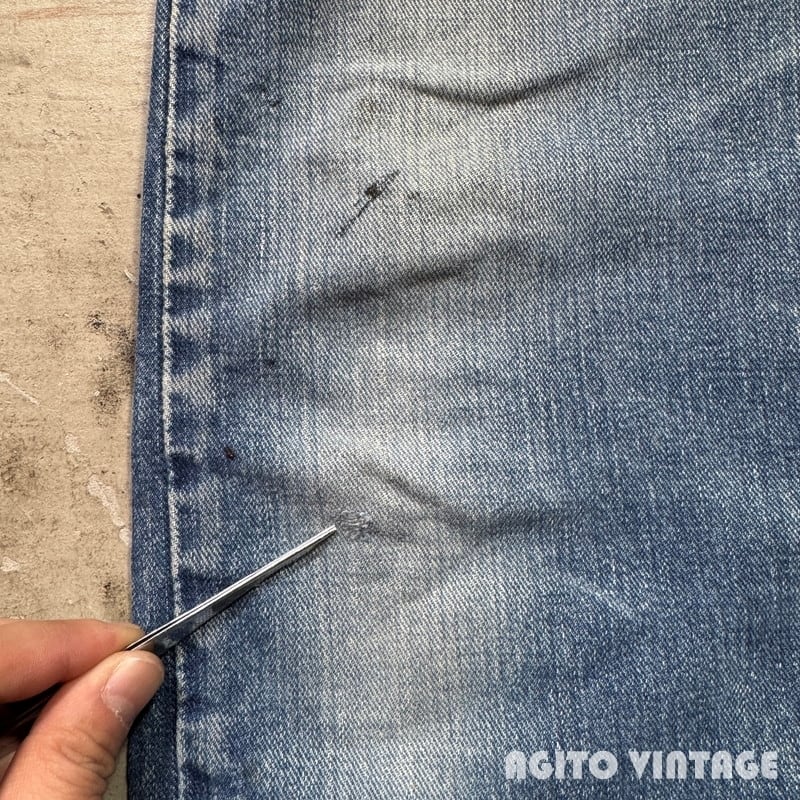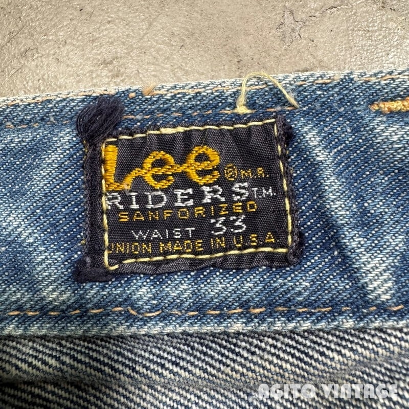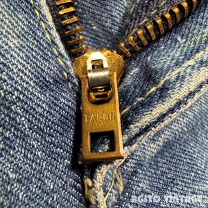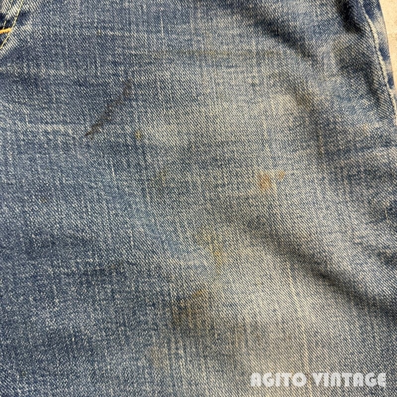 60年代のLee RIDERS 101Z デニムパンツです。101品番としては最終頃のサイド黒タグが付くモデルです。フロントはTALONのセミオートマチックジッパーが使用されており、アウトシームは脇割りです。バックポケット裏に当て布が付きます。色残りは4割程ですがバランスよく良い色落ちをした個体です。バックポケットのピスネームに擦れがありますが恐らくMR表記は入らないかと思われます。フロントのジッパー下部にステッチが飛んだ箇所がございます。レザーパッチ下部のステッチが半分程切れています。右膝に小さなダメージ、左ひざ下付近にリペアが施されています。その他細かな擦れ等ございますが目立つダメージは無く状態良好です。ウエスト表記はW33ですが実寸はW32インチです。レングスも長すぎないのでサイズが合う方も多いのではないでしょうか。生地もまだまだしっかりとしていますので長くご愛用頂けますのでお探しだった方は是非いかがでしょうか。