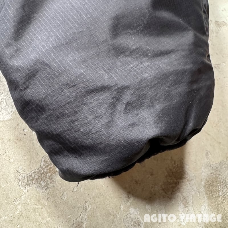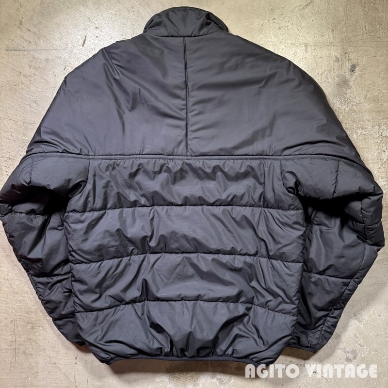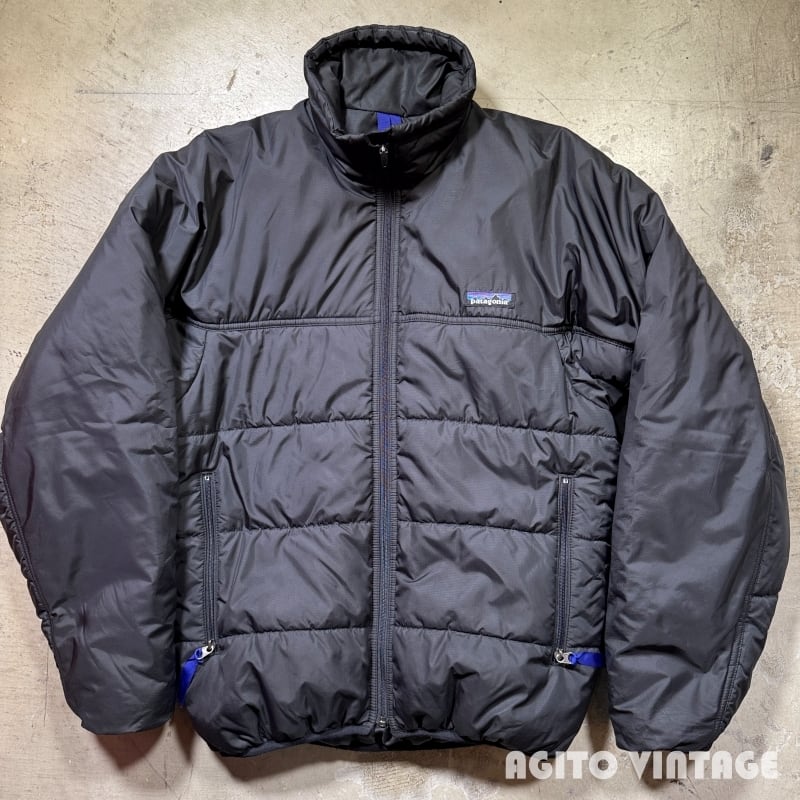 patagoniaのファイヤーボールジャケットです。2000年のタイ製です。1998年から2000年の約3年間のみ製造されていたモデルです。カラーはBlackです。中綿が入り耐風、耐水、速乾、透湿の機能を備えています。肩から袖には縫い目が無くすっきりとした印象です。袖と裾のパイピングに擦れや毛玉が見られます。袖や袖口等にうっすらとした汚れがございます。その他ダメージは特に無くコンディションは良好な部類かと思います。XSサイズですがややゆとりがございますのでSとMの間位のサイズ感だと思います。サイズが合う方は是非この機会にいかがでしょうか。