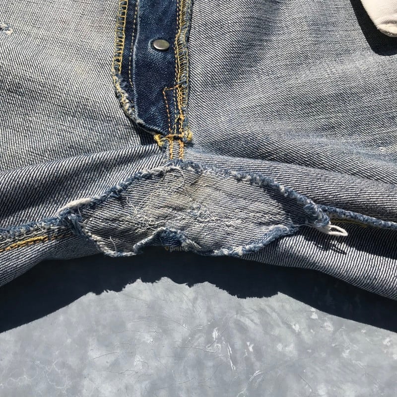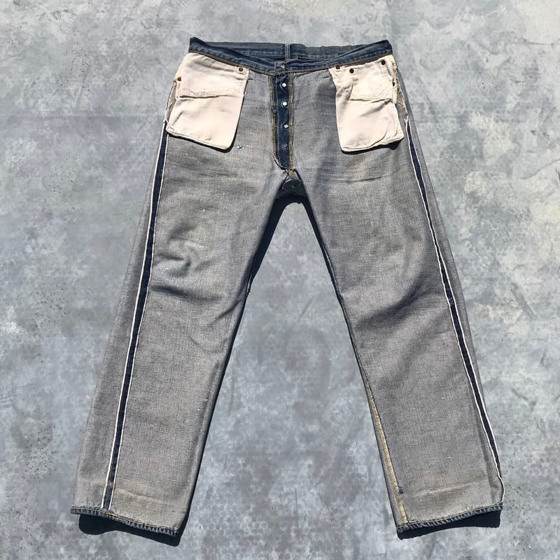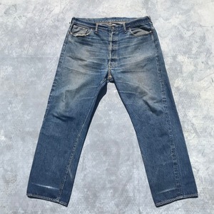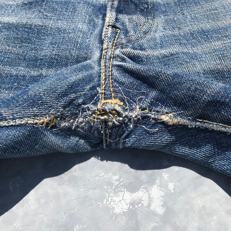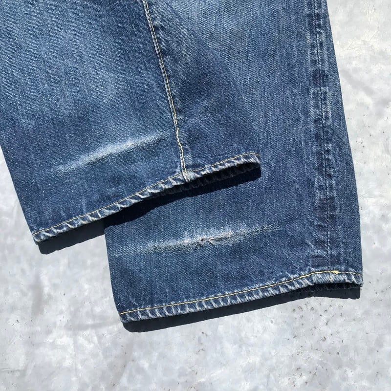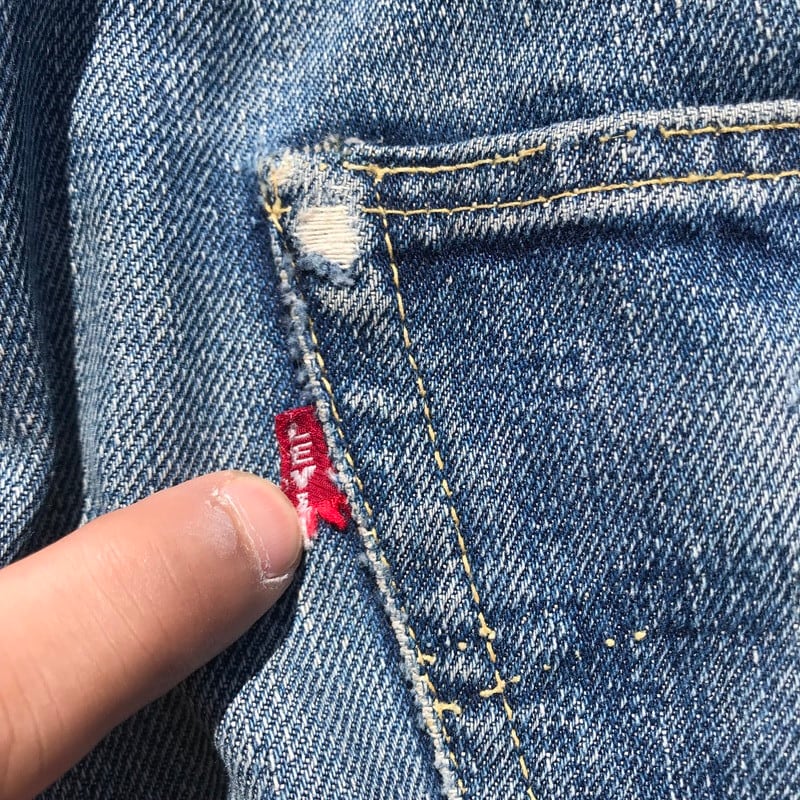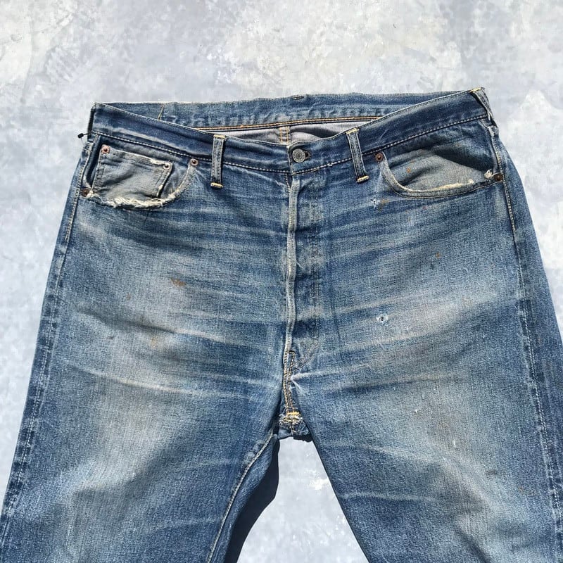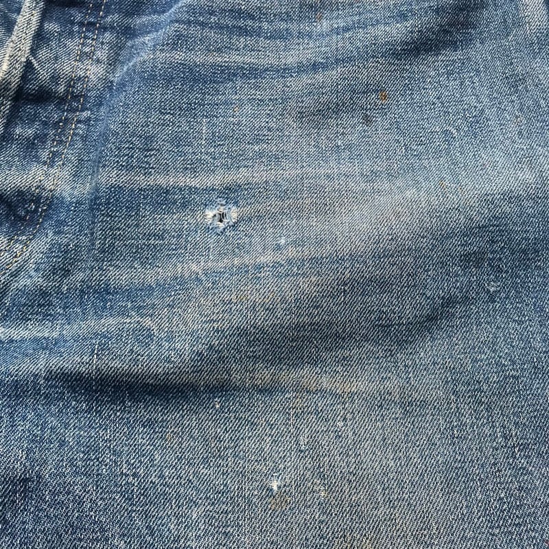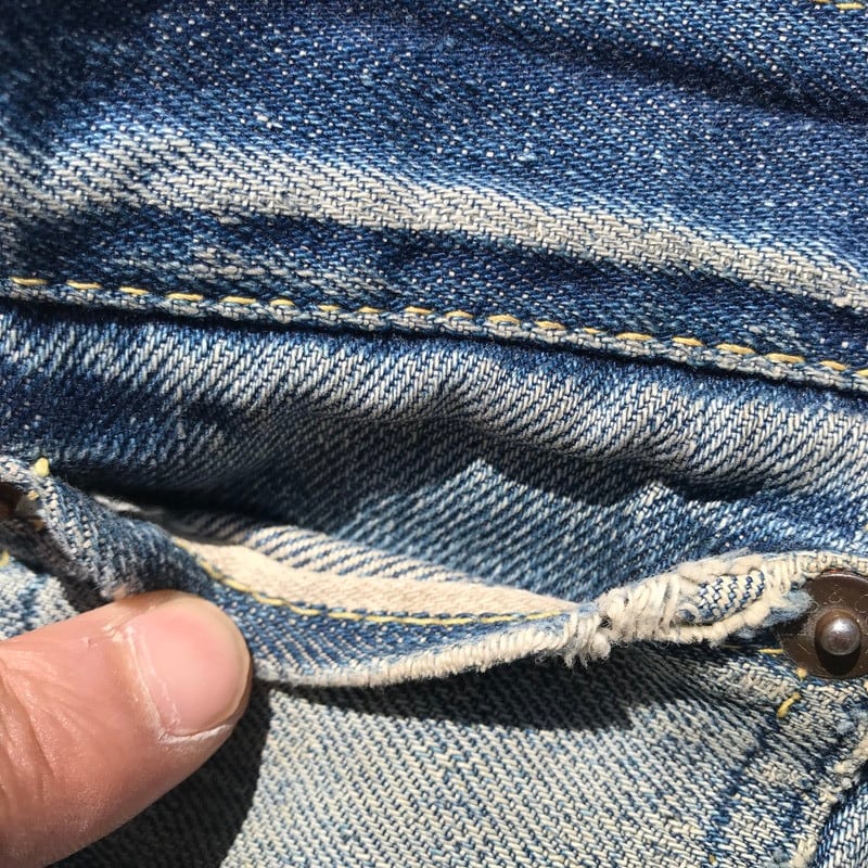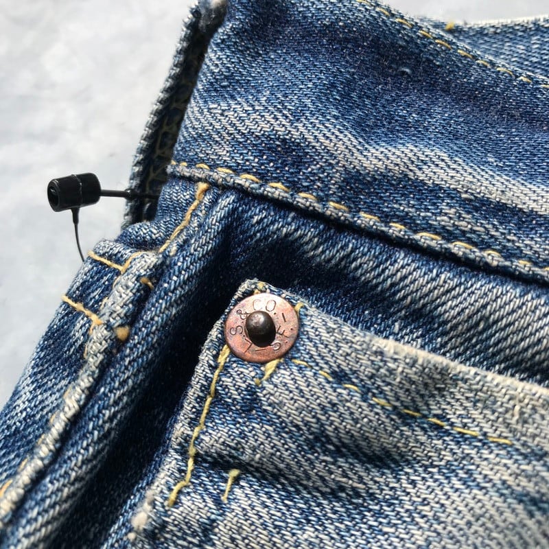 50年代から60年代頃のLEVI'S501XXです。トップを含めて5つのボタン、フライボタンには足長R、トップ裏刻印S、フロントVステッチの為ウエストシングル、リベット裏銅製、隠しリベット有り、コインポケット裏耳付きシングル、オフセットループ、両面赤タブ、Big E、均等V。55年頃から作られた紙パッチのギャラ入りモデルと思われます。アーキュエイトステッチはイエローの綿糸ですが、ほとんどが取れてしまっています。股に内側からリペアで生地が当てられています。バックのセンターステッチに5cm程ステッチ飛びがございます。裾はチェーンステッチで縫製されており、オリジナルと思われます。両フロントポケットにダメージがあります。ところどころにちいさなダメージはございますが、程よい色落ちでヒゲも確認できますので、これからもう少し育てていただけます。W38とゆったりしていますが、年々希少な存在となってきていますので、お探しだった方は必見です。