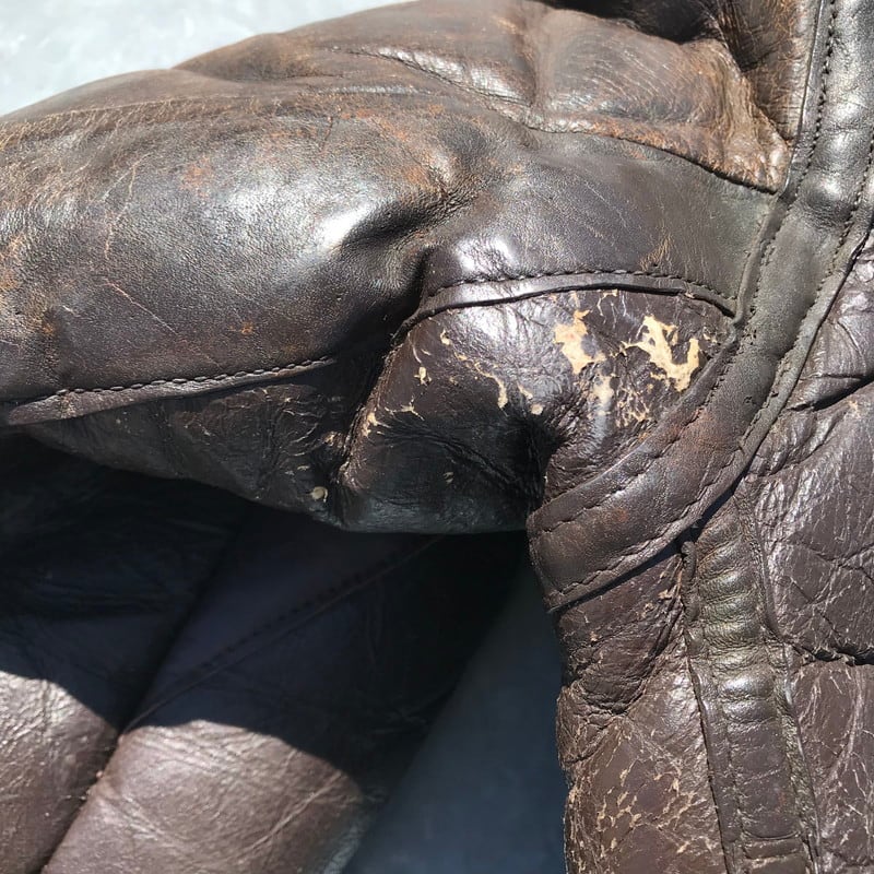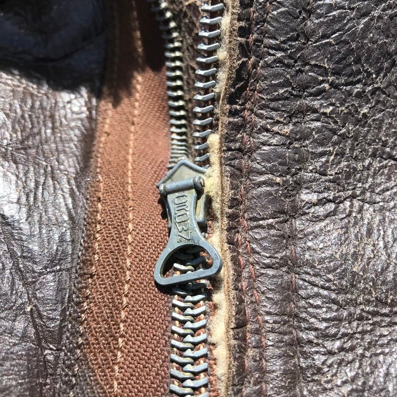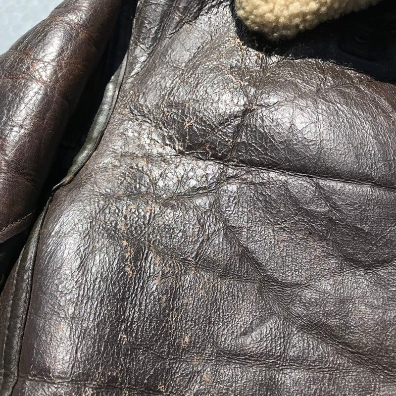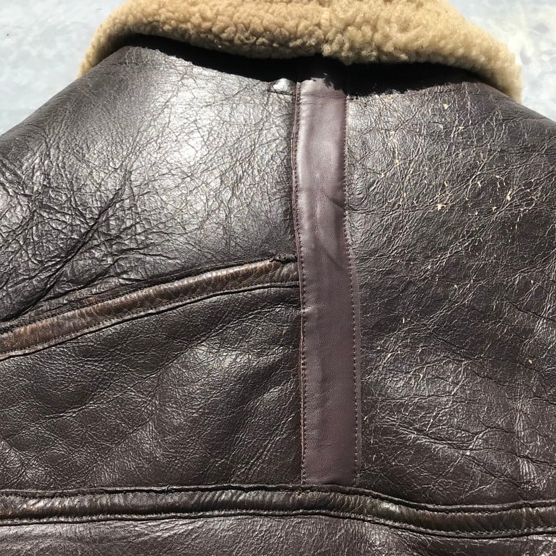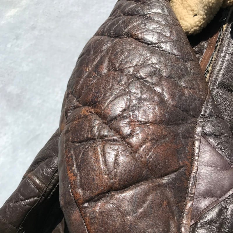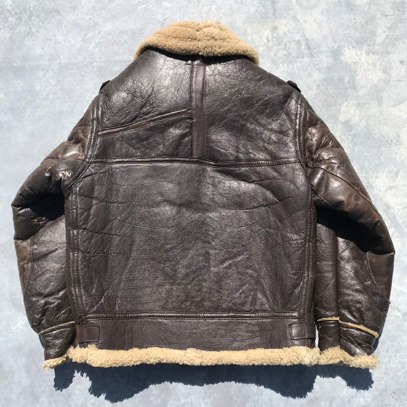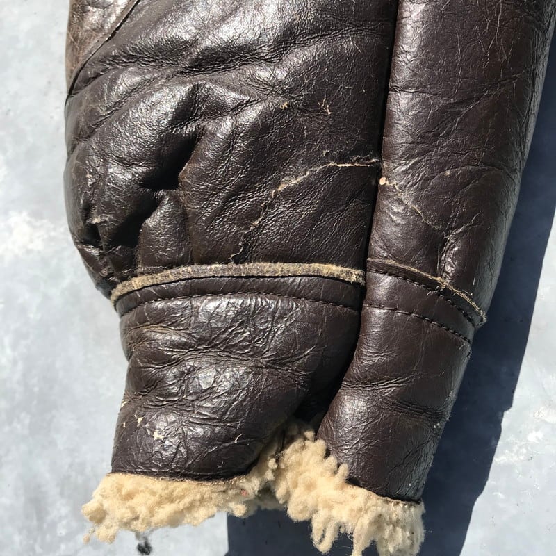 40年代頃のB-3ムートンジャケットです。U,S,AIRFORCEの前身であるU.S.ARMY.AIR FORCE時代の希少なタグが付きます。40年代初期のコントラクターであったH.L.B.CORP社製で、パッチワークのようなレザーの配置が目を惹く1着です。ところどころレザーの細かな剥がれやリペアはあるもののレザーに硬化は無くムートンの抜けも無いGOODコンディションです(ムートンに一部焦げのような箇所有)。ジッパーは50年代頃のCROWN社製のスプリングジッパーに交換されていますので、開閉はスムーズです。サイズは38と申し分無いゴールデンサイズ。70年以上前のヴィンテージと考えてもその希少性は非常に高く、今後このような着用できるコンディションのB-3はなかなか出会わないと思われます。ミリタリーコレクター必見のスペシャルピースです。