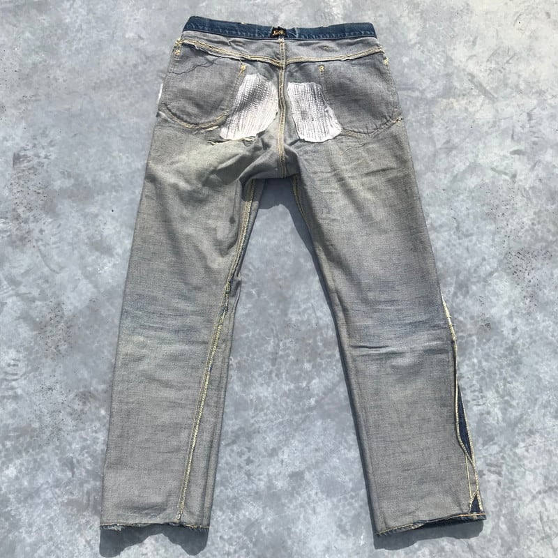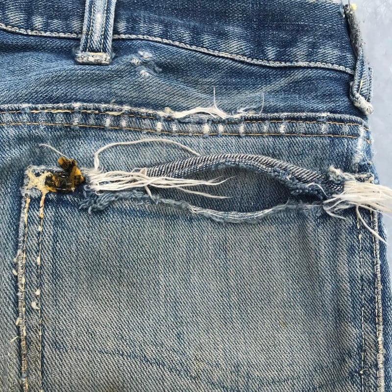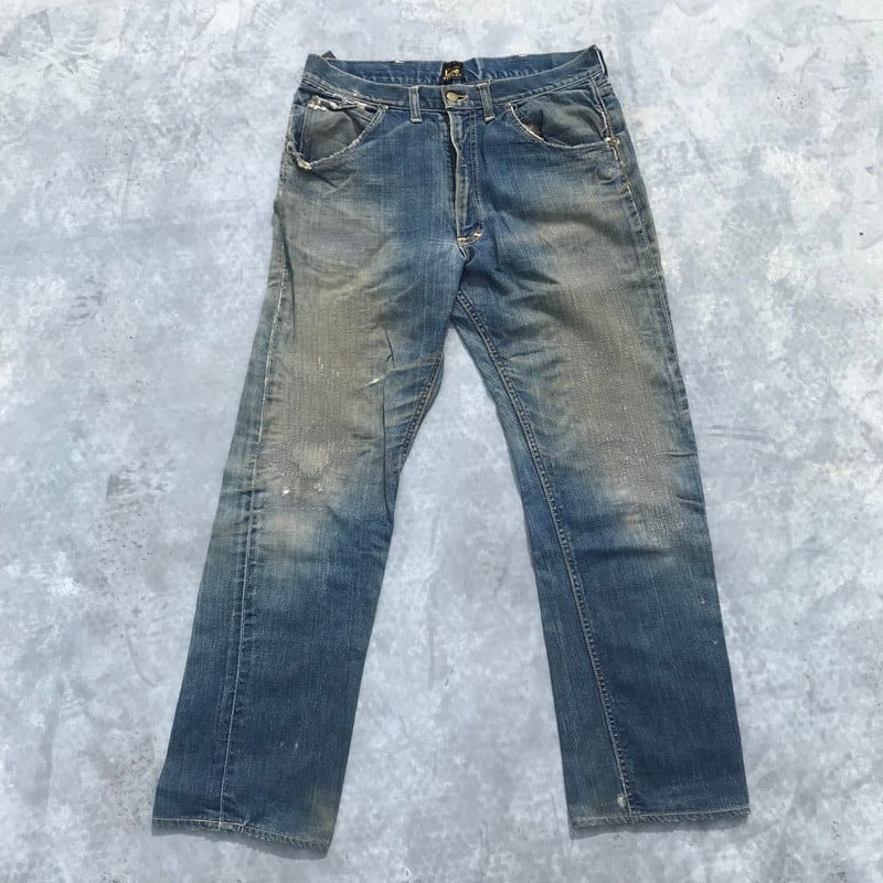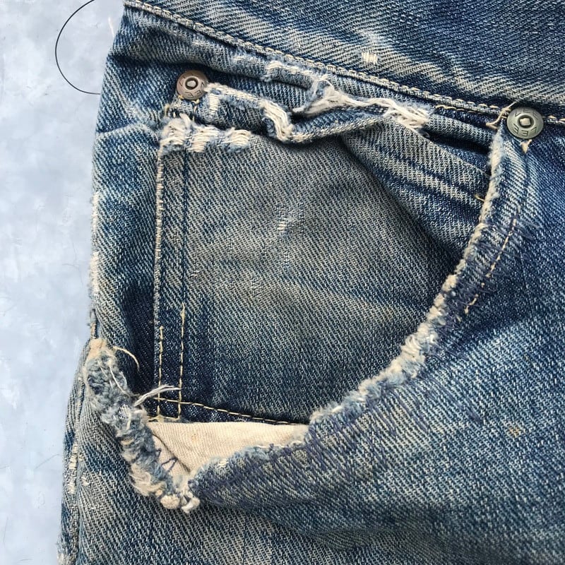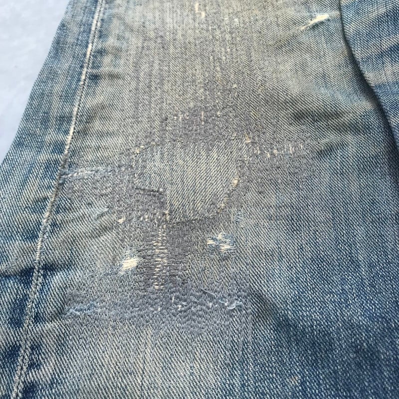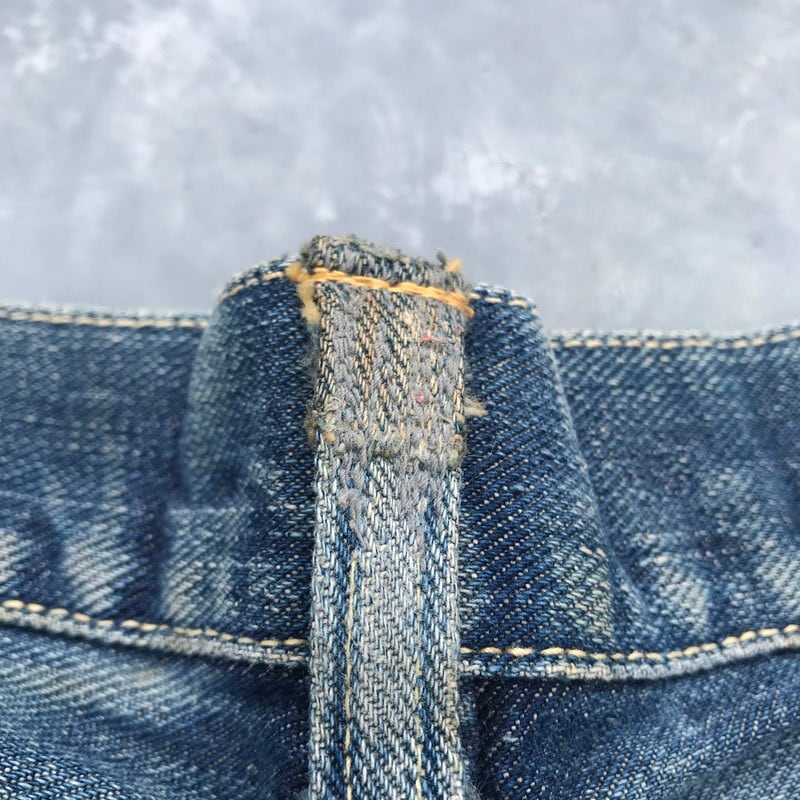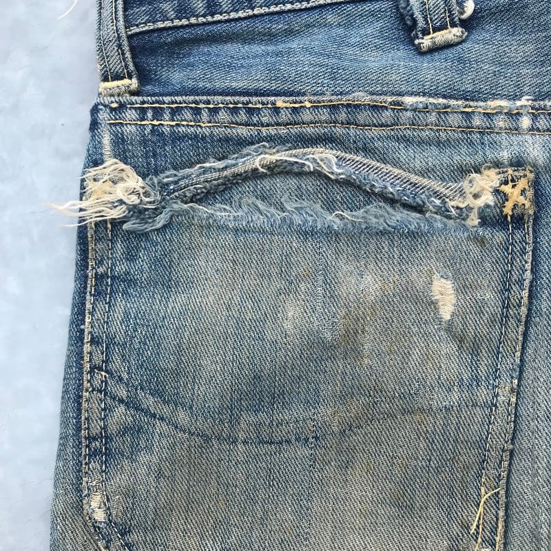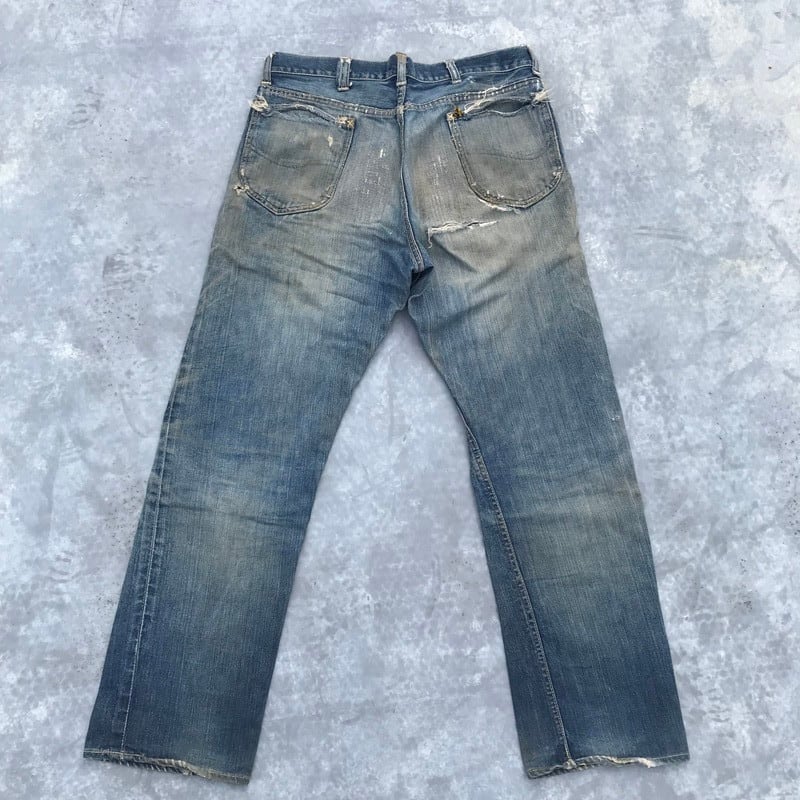 50年代頃のLee RIDERS 101Zです。センター黒タグと呼ばれる、赤タグの後継モデルで、ハリウッドスターのジェームスディーンが映画で着用していた事で有名なデニムです。タグにはサイズ表記は無く、実寸でW34位です。バックポケットのピスマークもボロボロでなんとかLeeの文字が確認できる状態です。バックポケット内側は当て布有り、ユニオンチケットも残っています。WALDES社のピンロックジッパーが採用されており、片側だけコの字留めとなっており嬉しいディティールです。アウトシームは脇割りです。珠数も少なく、非常に希少なモデルですが、全体にダメージとタタキが入る為特価となります。ヴィンテージマニアには堪らない色落ちで雰囲気のある1本です。リペアやカスタムを楽しめる方におすすめです。
