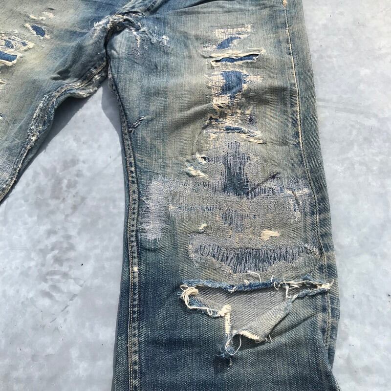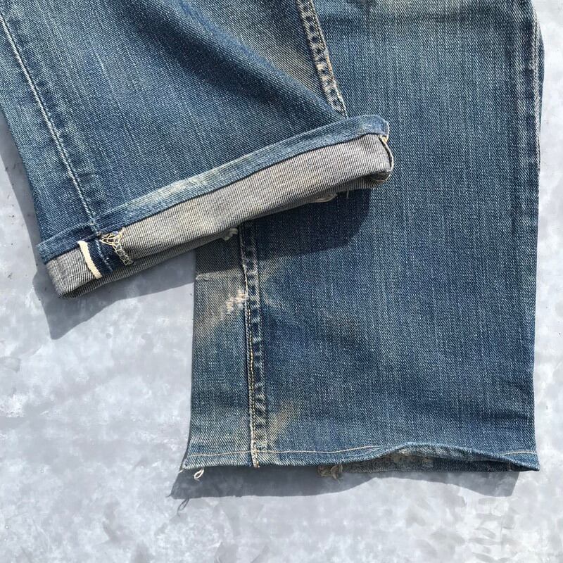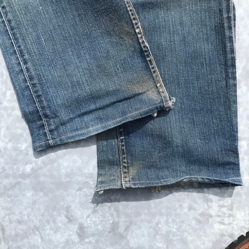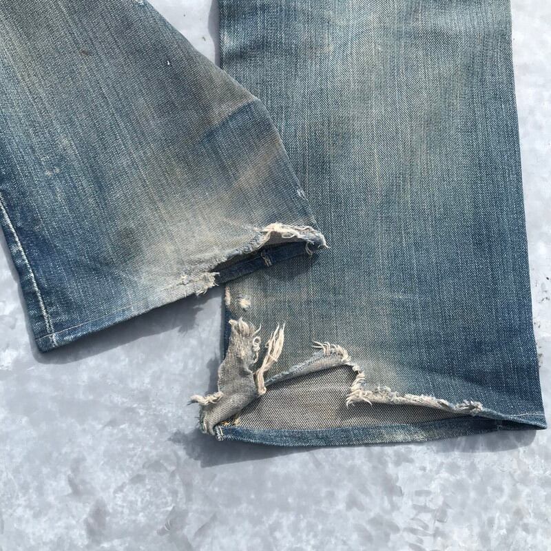 50年代後期から60年代頃のLee RIDERS 101Zです。サイド黒タグと呼ばれるタイプで、サイドタグにはサイズとMADE IN USA表記の無いサイドタグ中期頃のモデルと思われます。ジッパーはGRIPPER ZIPPERのカムロック仕様。アウトシームは両側片耳となります。トップボタン裏はKCと刻印されています。バックポケットは当て布と微かながらユニオンチケットが確認出来、ピスマークは®マークが入ります。全体にハードなダメージが有、リペアされており左ひざに裂け、両裾共にダメージがございます。ウェストは実寸でW33位。グランジ系ファッションがお好きな方はリペア等を楽しんでみてはいかがでしょうか?
