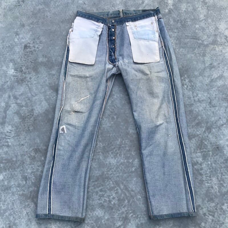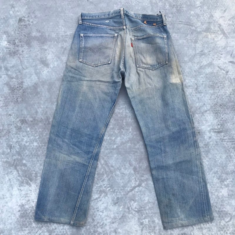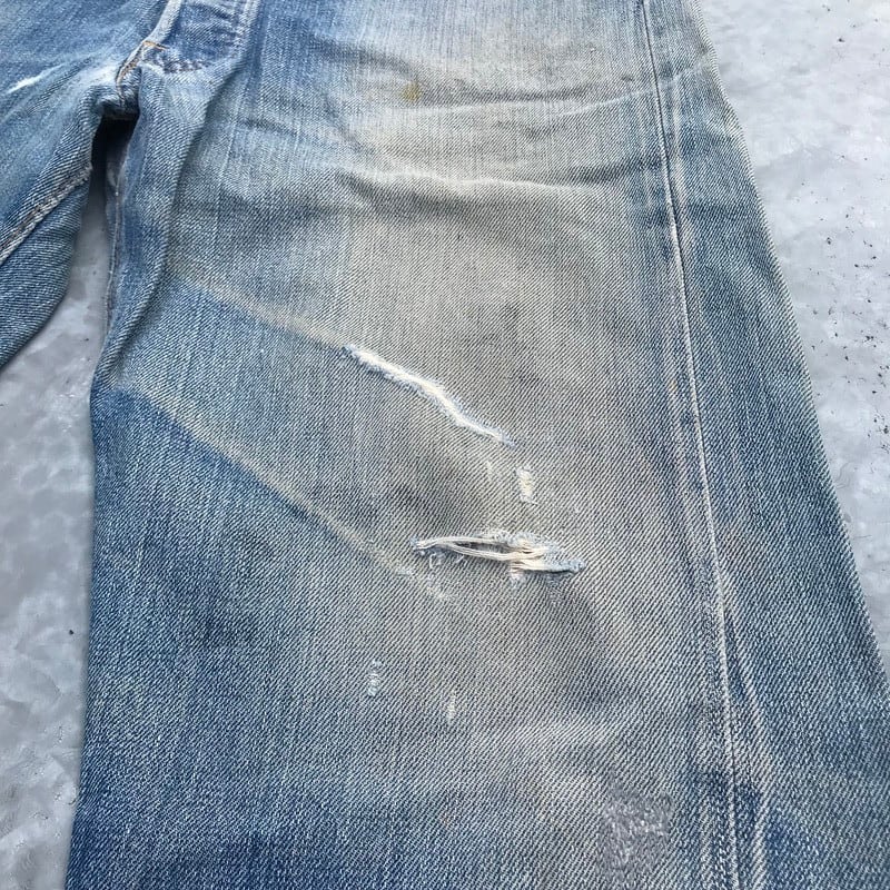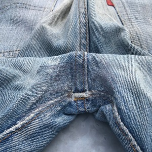 70年代頃のリーバイス501、66前期モデルです。トップボタン裏刻印6、ウエストチェーンステッチ、バックポケットシングルステッチ、ケアタグ縮率8%。この時代のデニムらしい見事な縦落ちした1本です。フロントベルトループ、両ポケット縁、両膝にダメージ、バックポケット右の縁、左ポケットの下部がほつけています。ウエストと、股にリペアがございます。全体にフェードしており、ところどころシミ汚れ等もあり雰囲気の良く、ヘヴィーネル等との相性も良いかと思います。ウェストもW35ですので、程よくゆったりと着用出来ます。
