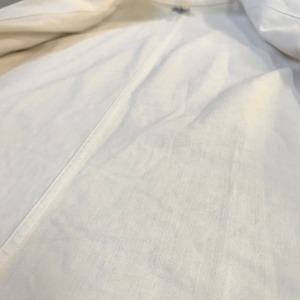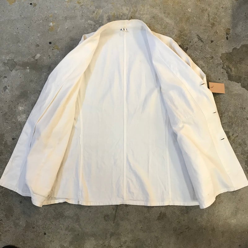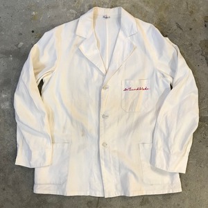 40年代頃のコットンカバーオールです。g.a.Petersonという会社の物で、首元に弑さな刺繍タグが付きます。フロントは3つボタンに3つポケ、ボタンはチェンジボタンです。胸ポケットにDr Lundbladと刺繍がされている事からメディカルジャケットとして使用されていたのではないでしょうか。sじっかりとしたコットン地ですのでダメージはございませんが、所々黄ばみのような汚れがございます。M~L位のサイズ感です。ヴィンテージのチェンジボタンでカスタムしても雰囲気が変わって面白いのではないでしょうか。