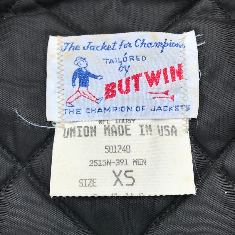 60年代から70年代頃のBUTWINウールボタンスタジャンです。1938年創業でスタジャン(アワードジャケット)で有名な老舗メーカーです。スタジャンといえば、スナップボタンのイメージも強いですが、こちらはボタンで留めるいわゆるボタンスタジャン(ボタスタ)です。ネイビー1色のレター等入らないプレーンタイプで、内側は中綿のキルティング仕様です。ダメージ等なく非常に綺麗です。プレーンのボタスタはあまり見かけないので、そのまま着ても良し、ワッペン等でカスタムしても良しとこれから育てていくのが楽しみな1着です。XS表記ですがS~M位のサイズ感です。