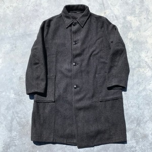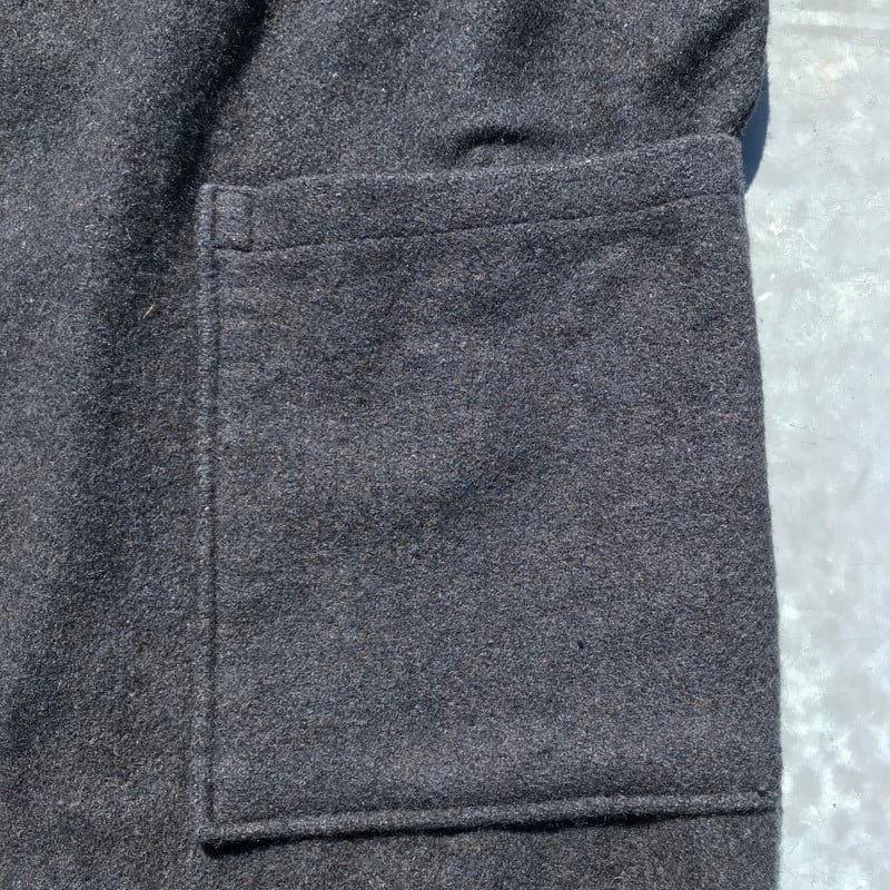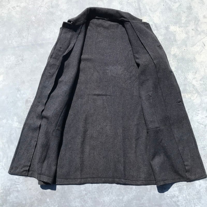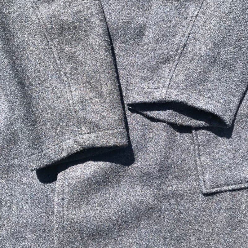 60年代頃のウールプリズナーコートです。プリズナーアイテムであまり見かけない珍しいコートタイプです。チャコールグレーのようなウール素材ですが、軽めですので、ストレス無く着用出来ます。背中にうっすらとRCCMのステンシルが入り、分かる人にはたまらないディティールです。比較的綺麗ですが、フロント胸部分や裾辺りに目立ちにくいですが生地が少し薄くなって小穴が開いてる箇所がございます。ざっくりとした大き目なサイズ感ですので、オーバーコートとして様々なコーディネートの上から羽織ってみてはいかがでしょうか。