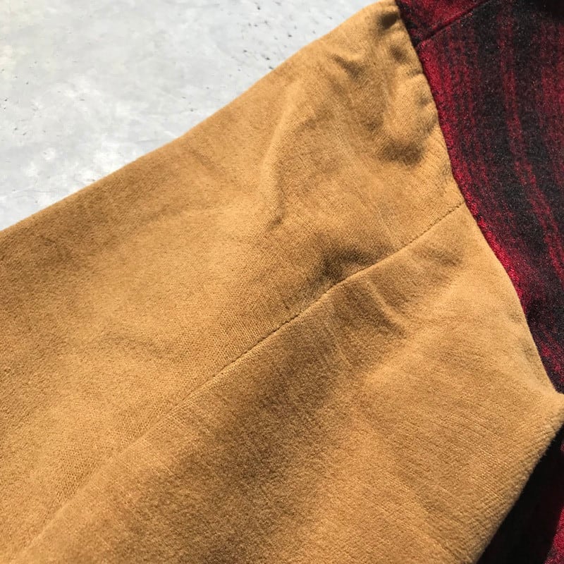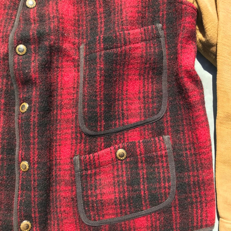 40年代頃のWOORICH、ウールジャケットです。ワークジャケットで見られるエンジニアジャケットのような形で、ボディーと袖が切り替えになっています。タグのWOOLRICHの横に®マークではなくREG表記となりますので、40年代の物と思われます。縁は全てパイピング処理が丁寧に施され、ハンティングジャケットならではの丈夫な作りです。袖はモールスキンですので、袖通しも良くデザイン性にも長けています。両袖共にスレや汚れ小さなダメージがございます。通常背面にはシンチバックが付いていますが、こちらは、綺麗に取り除かれています。あまり出ないタイプのジャケットですので、お勧めなアイテムです。
