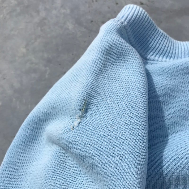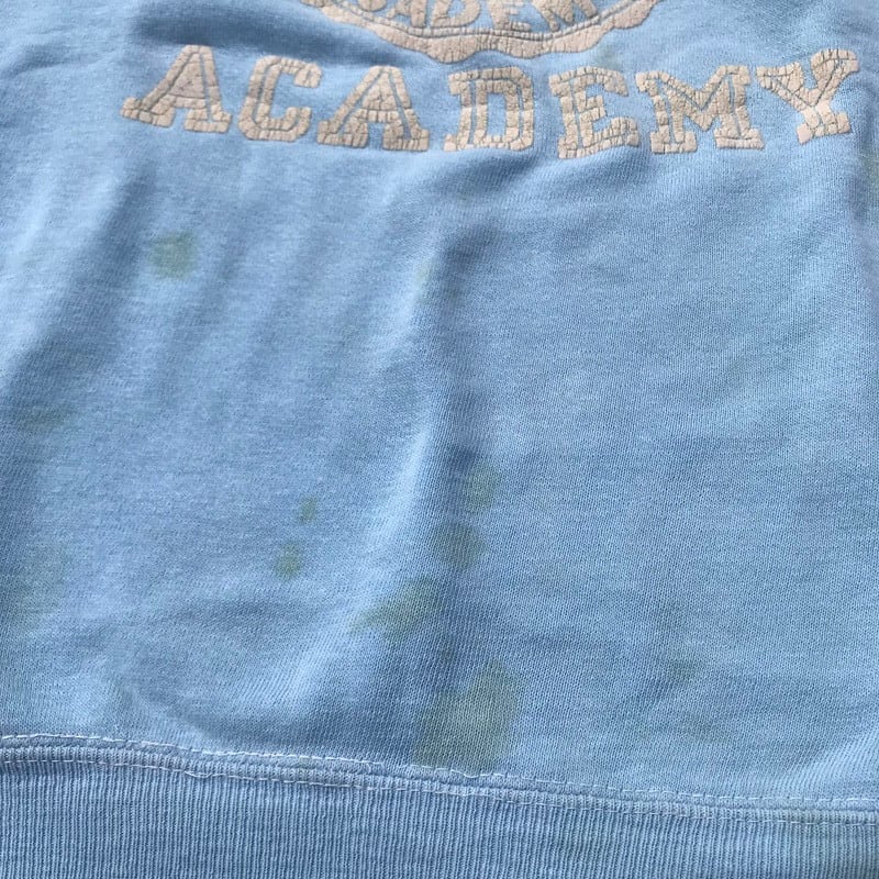 50年代から60年代頃のU.S.AIRFORCE ACADEMYのラグランスウェットです。エアフォースカラーを連想させるライトブルーにフロッキープリントが施されています。1950年代設立の空軍士官学校(USAFA)で支給されていた物と思われます。全体にフェード感が有り、フロントや袖にシミが数か所ございます。裾リブにステッチ飛びも見られます。左肩と裾リブ背面にリペアした箇所がございます。サイズはL相当で身幅に比べ袖は少し短めに感じます。USAFAのアイテムはあまり出ないと思われますので、ミリタリーアイテムがお好きな方はコレクションに是非。【身幅】63.5cm【着丈】55.5cm【袖丈】ラグラン袖の為首元から65cm