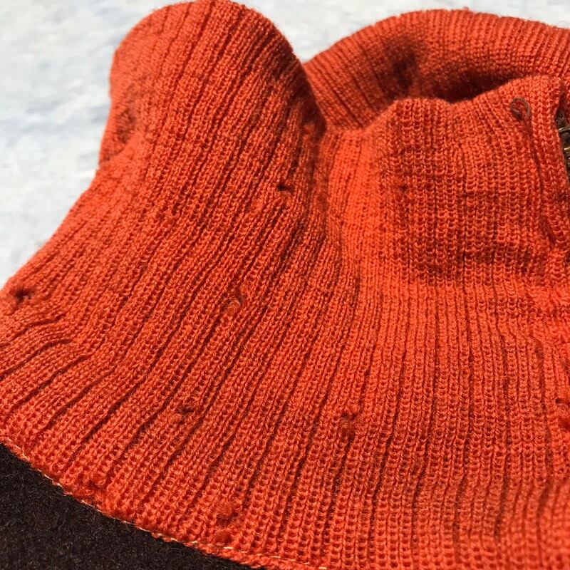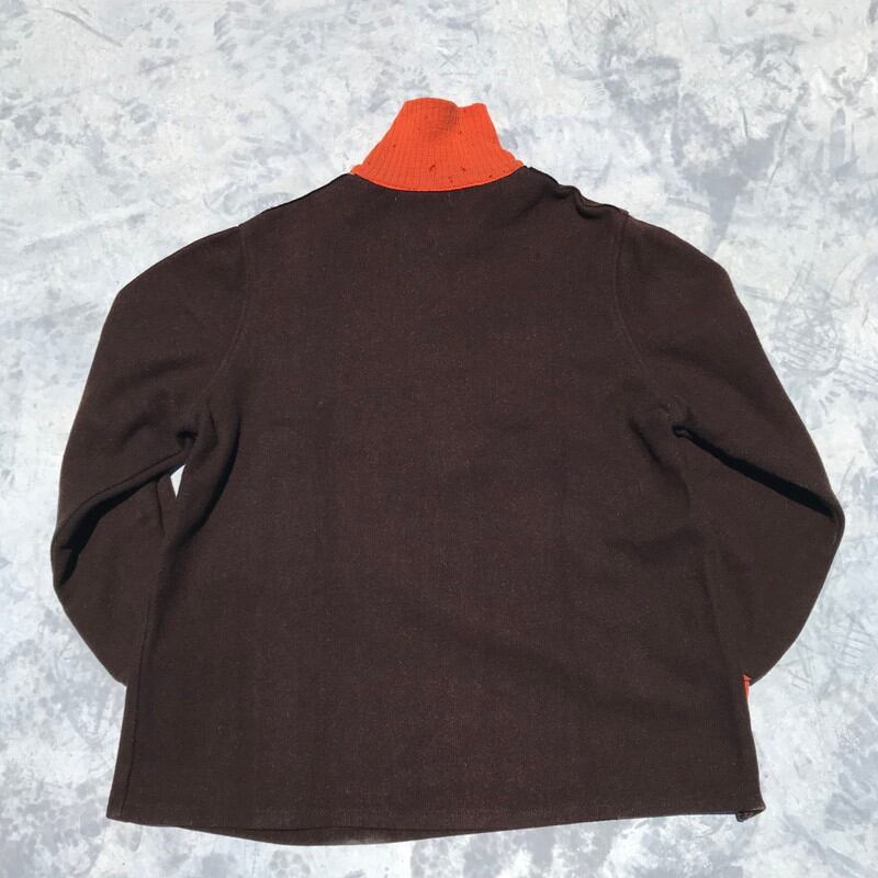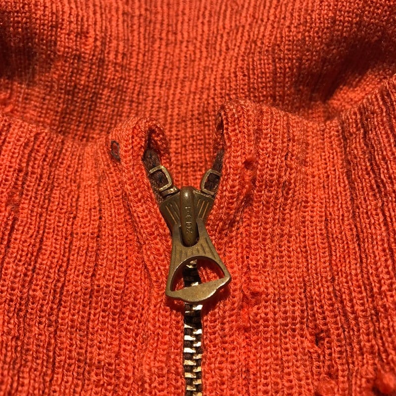 30年代から40年代頃に作られたと思われるウールプルオーバースポーツジャケットです。タグにはCravenette Processedと刺繍されていますが、ブランド名では無く、ゴアテックスのような素材の商標名と思われます。デコタロンと呼ばれる古いジッパーで、コの字留め仕様。ハンドポケットには古い年代に見られるボールチェーンが付きます。襟と袖リブは針抜きとなりヴィンテージディティール満載の1着です。内側の縫製はこの時代には珍しくロックステッチで施されており生地の裏地にもCravenetteのマークがプリントされています。ヴィンテージ市場でもほとんど見ない珍しいデザインで、希少性の高いアイテムと言えます。ボディにダメージはありませんが、リブには所々虫食いのような穴がございます。リブ自体伸縮性もございますが、経年劣化はあると思われますので、強く引っ張ったりすると裂ける恐れがございます。サイズはM(38)位と思われ170cm68kgのスタッフが中にロンTeeを着て丁度良いサイズ感です。非常にレアな珍品ですので、コレクター必見です。