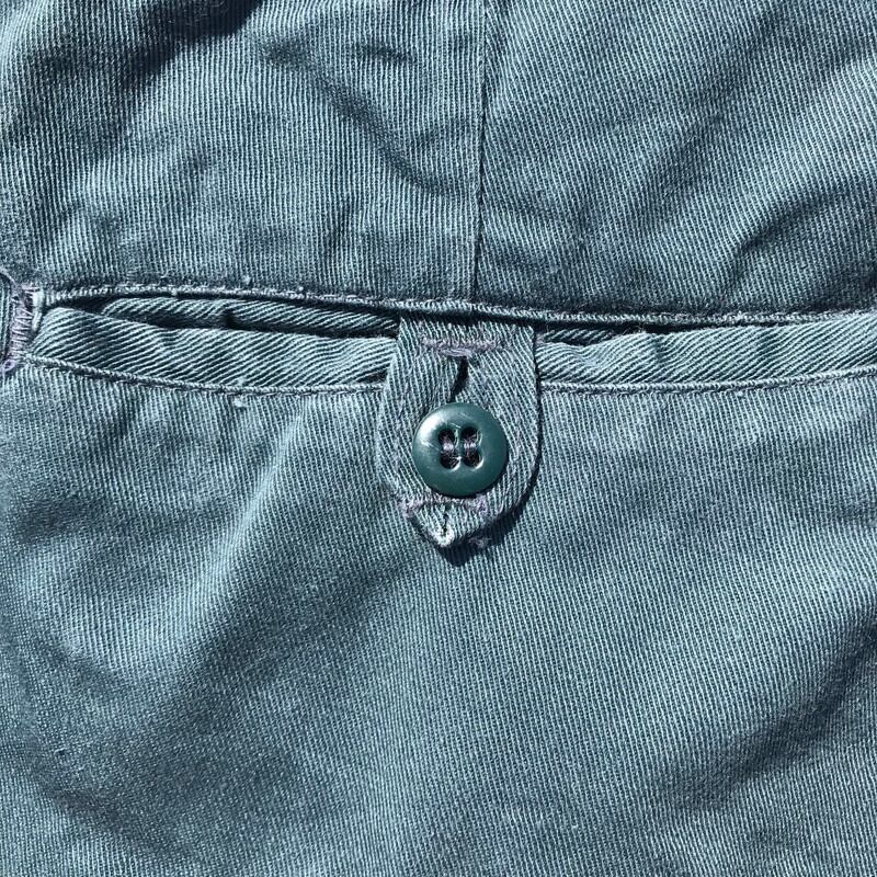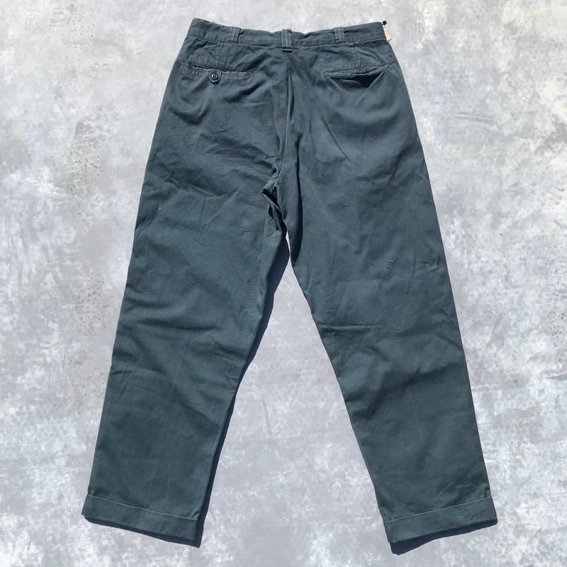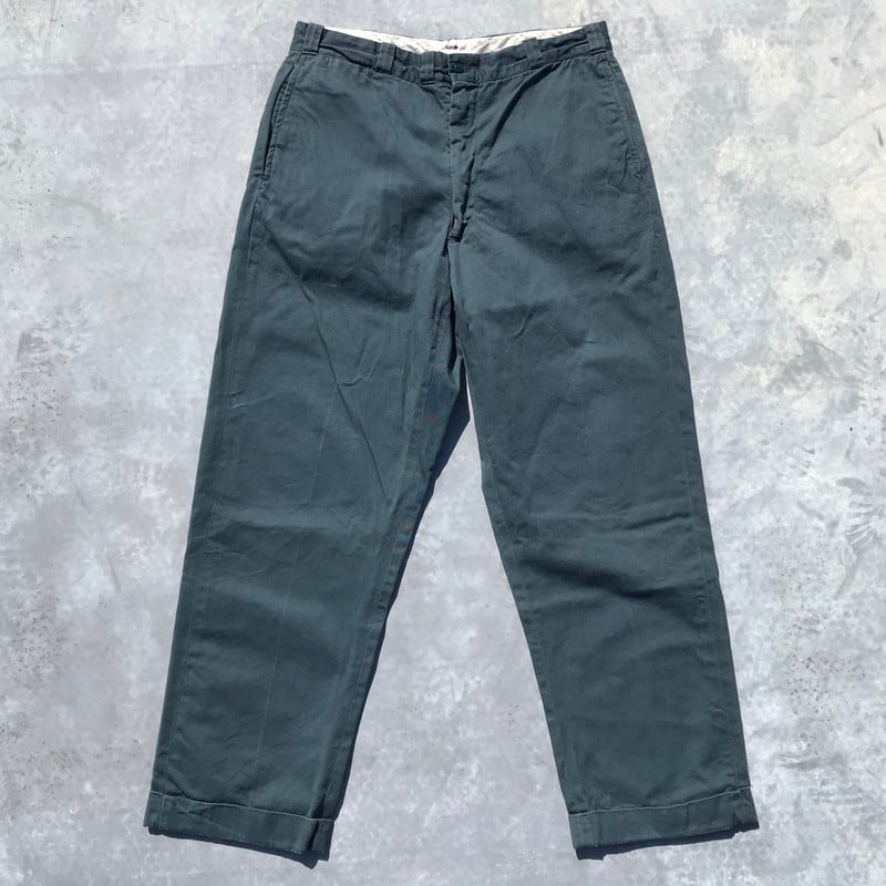 60年代から70年代頃のPowr Houseワークチノです。アメリカ3大ストアであるモンゴメリーワードのプライベートブランドで、1920年代後半には製造されていたとされています。コットンツイルのような素材で生地はしっかりとしています。フロントはトップがスナップボタン、ジッパーはTALON社のセミオートマチックを使用しています。ウエスト内側にSANFORIZEDのスタンプが押されています。裾は4cm幅のダブルとなります。全体にスレや色褪せの使用感があり、センターにプレス痕がございますが特筆するダメージは無くワークウェアらしい雰囲気でおススメな1本です。