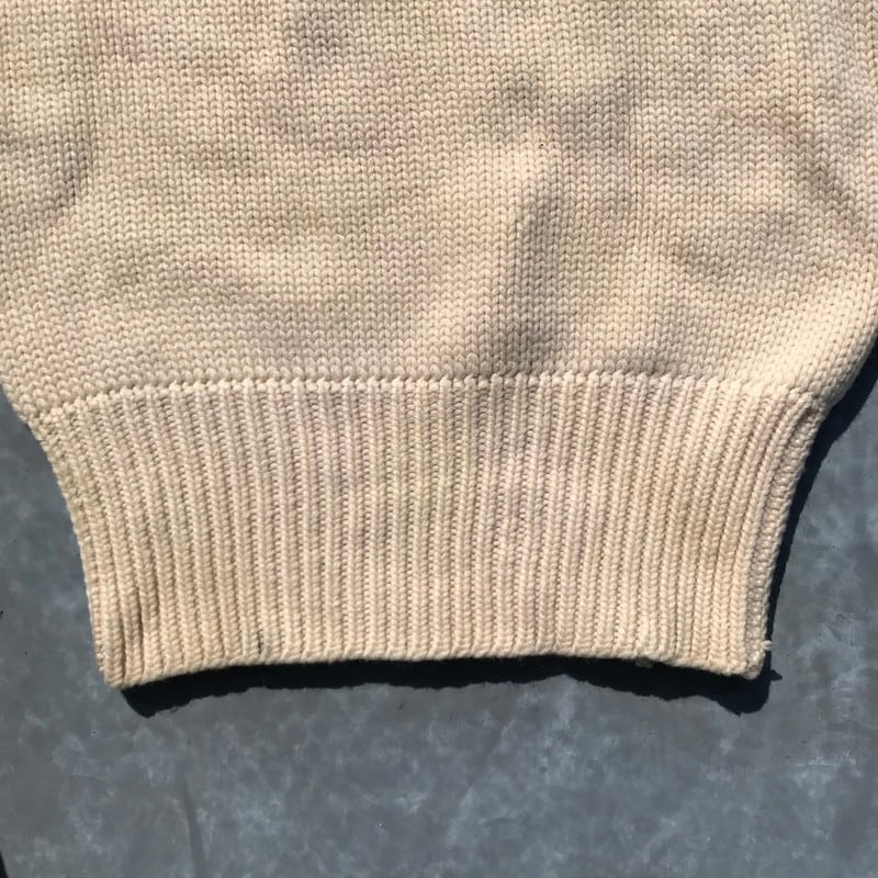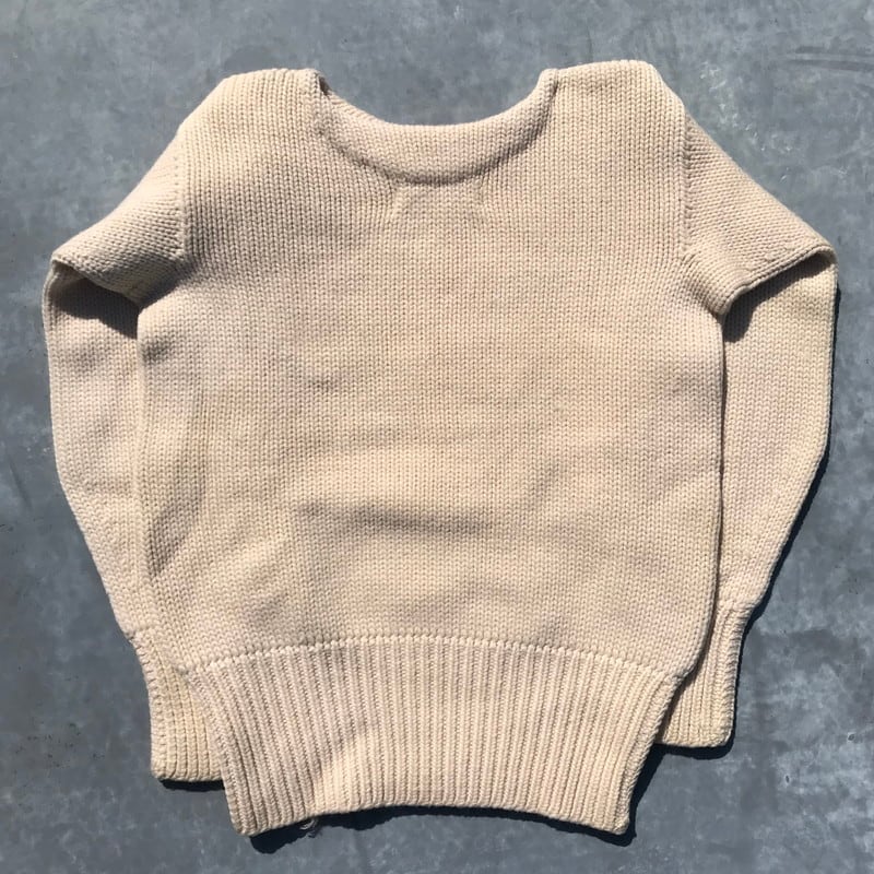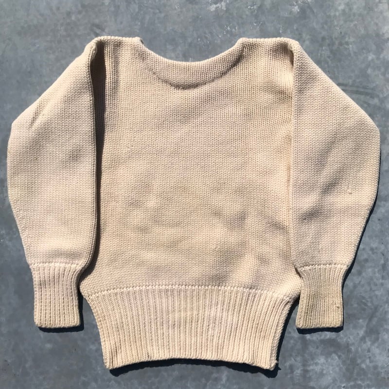 50年代から60年代頃のTHE NIXON COMPANYローゲージボートネックセーターです。カレッジ物等を手掛けていた様で、レタードセーターやカーディガン等も製造していたブランドと思われます。この年代あたりに見られる長いリブが特徴で、特にウエストのリブはその幅の広さから腹巻きリブとも呼ばれます。レタードや、ネーム刺繍等のないプレーンボディです。小さな変色した箇所はございますが、毛羽立ちも少なく非常に綺麗です。サイズs位ですので、女性の方にもおススメしたいアイテムです。【肩幅】41cm【身幅】48cm【着丈】55cm【袖丈】53cm