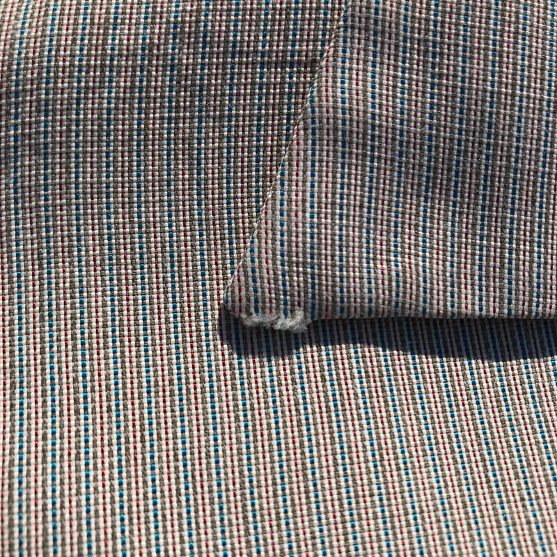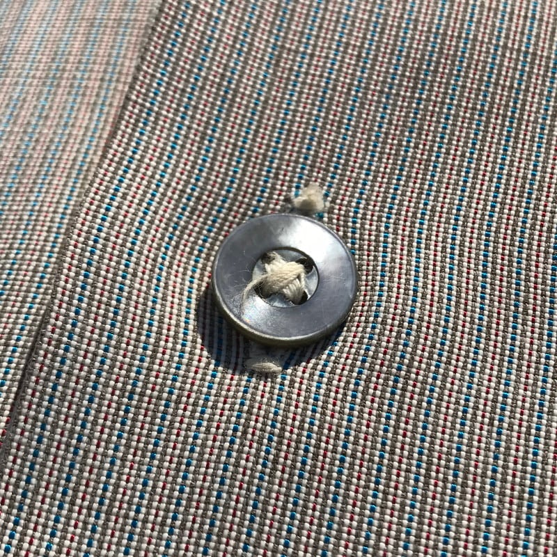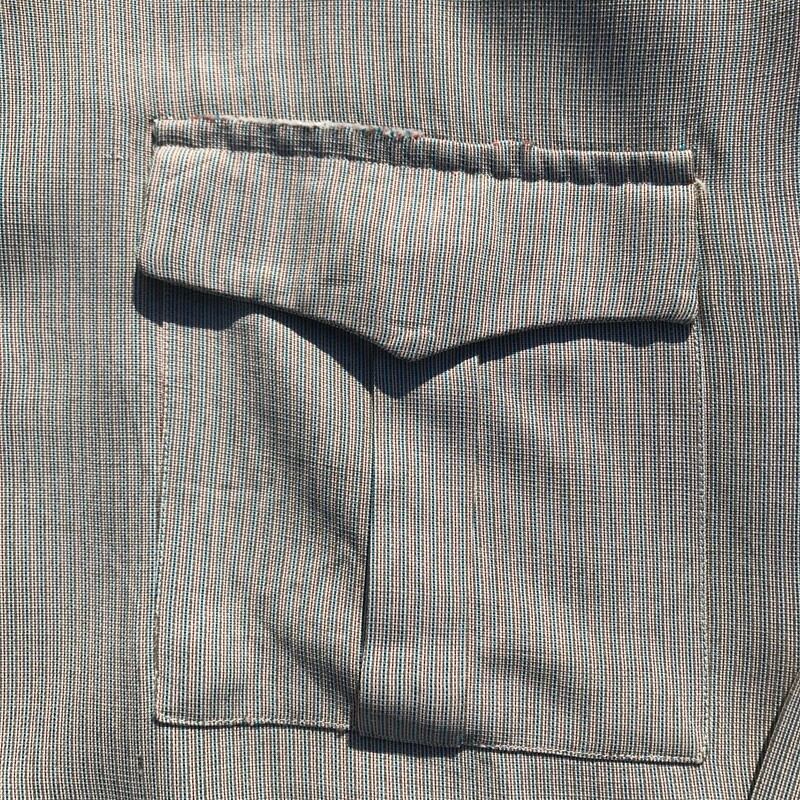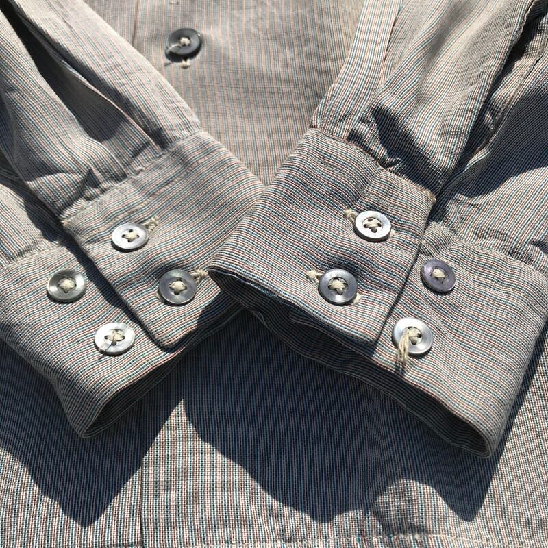 40年代から50年代頃のA Shermanというメーカーのギャバジンシャツです。白、グレー、青、赤の細かいピンストライプで構成されています。全て古いシェルボタンです。右襟先がすこし解れています。袖のダブルボタンが特徴的です。内側はロックステッチでしっかりと縫製されています。汚れやダメージはほとんどございませんが所々ピンホールのようなステッチ飛びがございます。上品なカラーですので、ジャケットスタイルにもおススメな1着です。