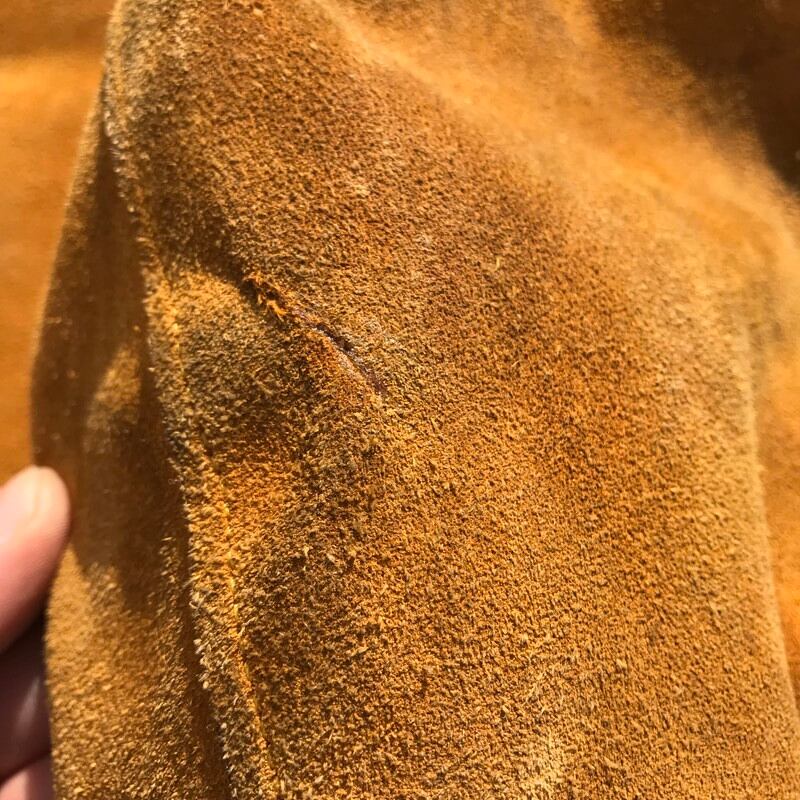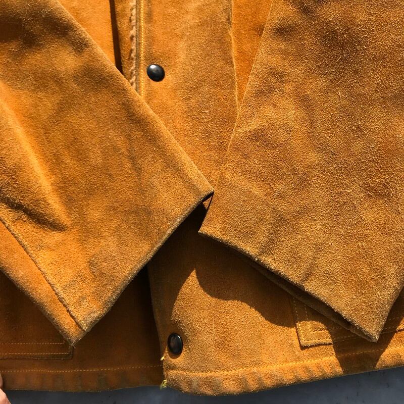 50年代頃のスエードランチジャケットです。Cliftonというメーカーのプライベートブランド物と思われ、襟とボディに珍しいブラウンのボアが施されています。所々に染みや摺れはござますが、ヴィンテージスエードアイテムとしては比較的綺麗です。右ひじに裂けた部分を補修した箇所がございます。袖のライニングに破れはございません。サイズは42表記で着用感はM~L位です。秋冬のコーディネートに大変お勧めな1着です。【肩幅】49cm【身幅】61cm【着丈】66cm【袖丈】56cm