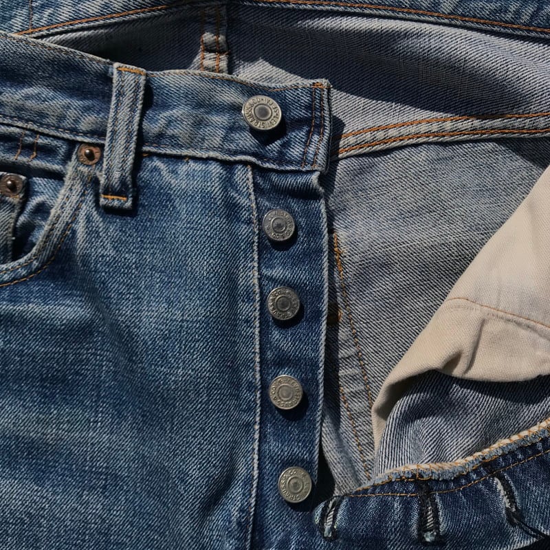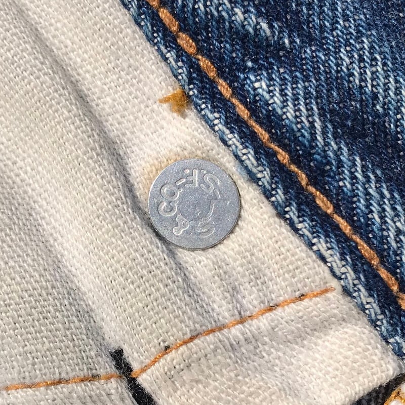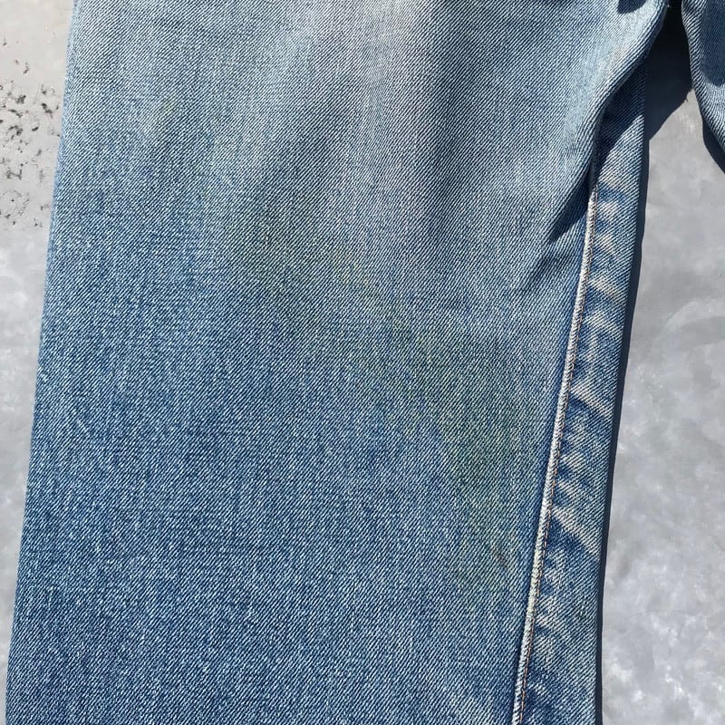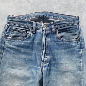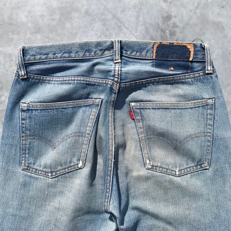 70年代頃のリーバイス501、66前期モデルです。トップボタン裏刻印6、ウエストチェーン、バックポケットシングル、アウトシーム片面シングル、スモールe。全体に程よくフェードしており、うっすらとですがヒゲも入ります。。右ひざ、股付近、裾にダメージが入ります。レングスはオリジナルと思われますが、元のステッチがほとんど無いので別の糸で縫われています。(目立ちません)眺めのレングスをお探しの方におすすめな1本です。