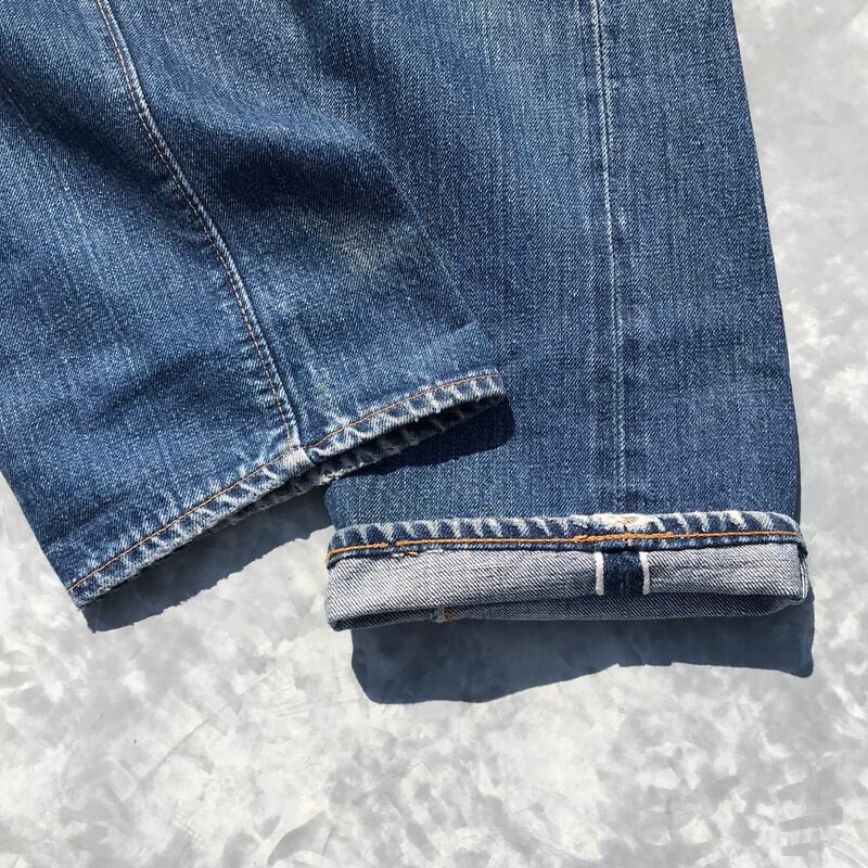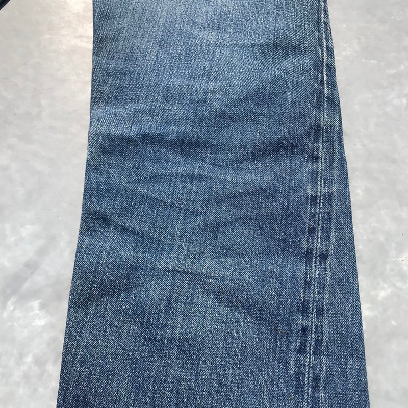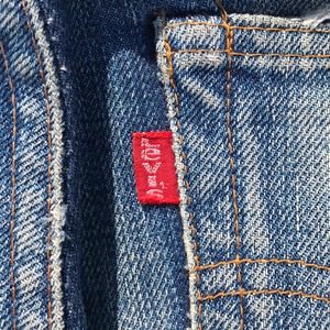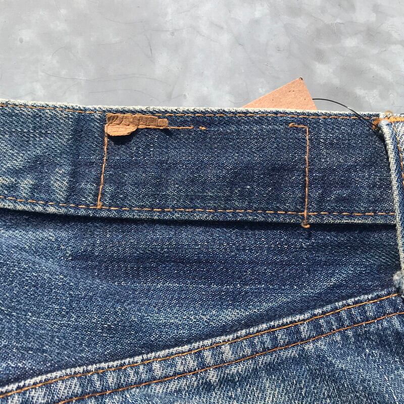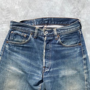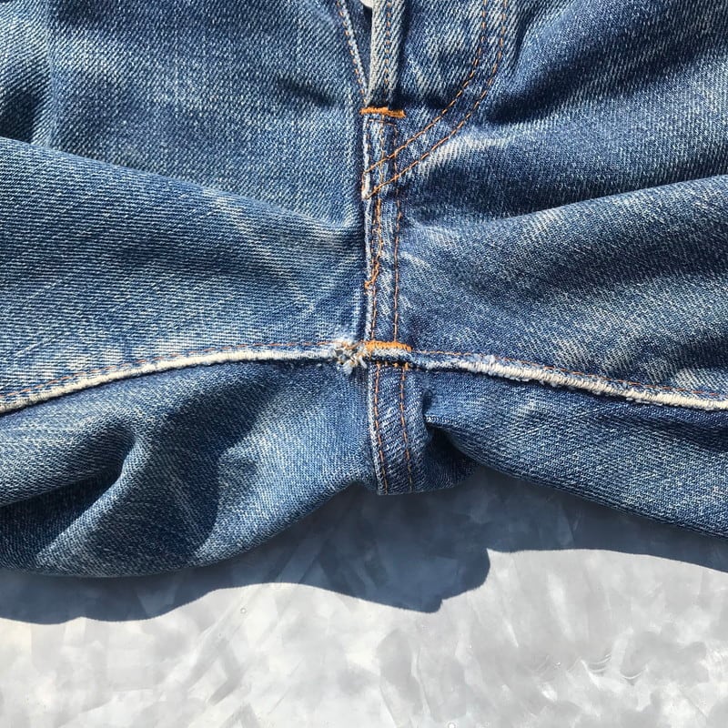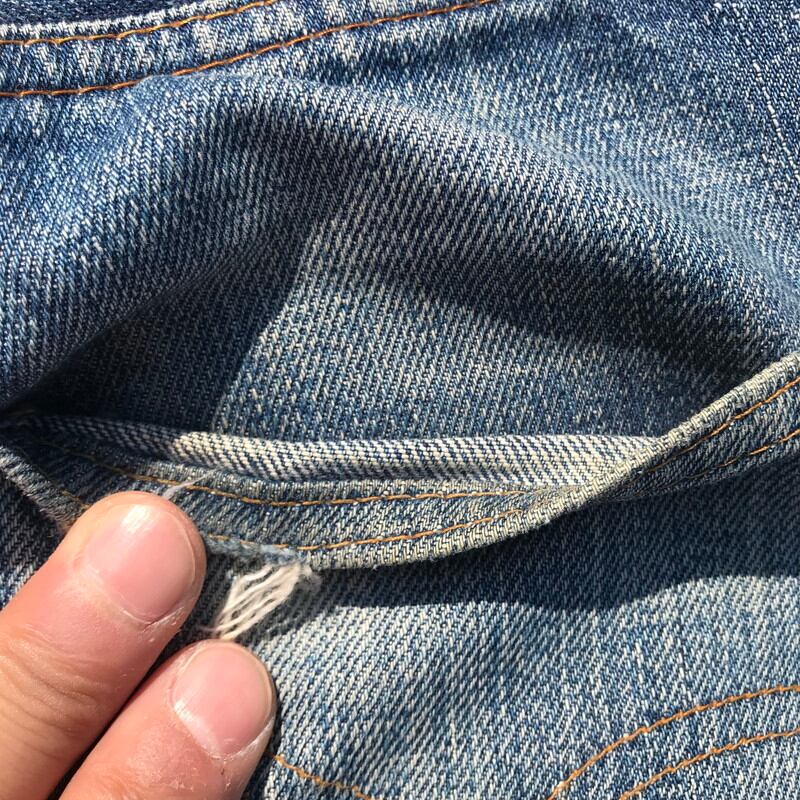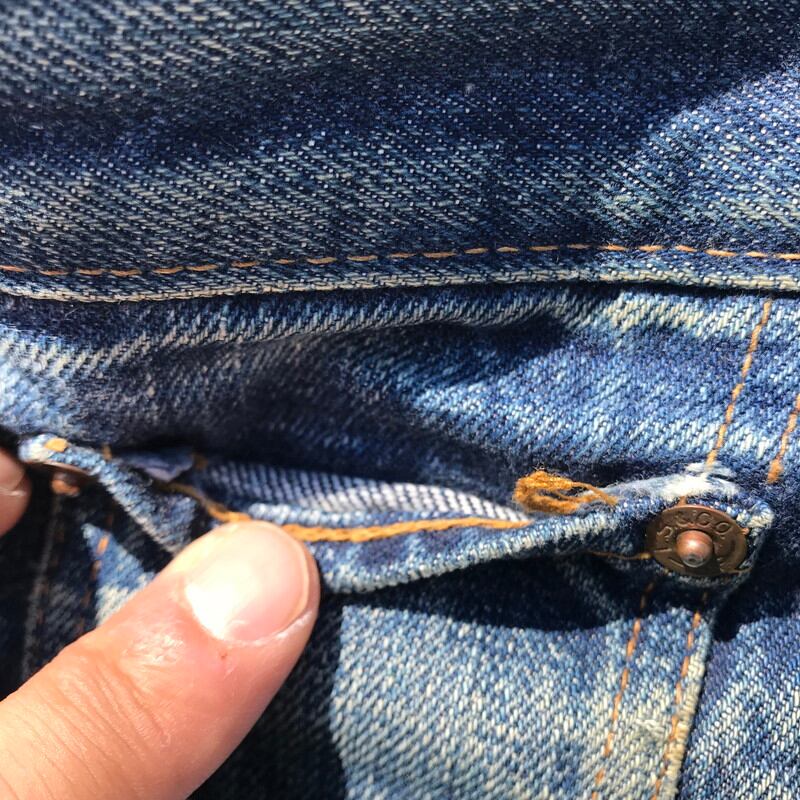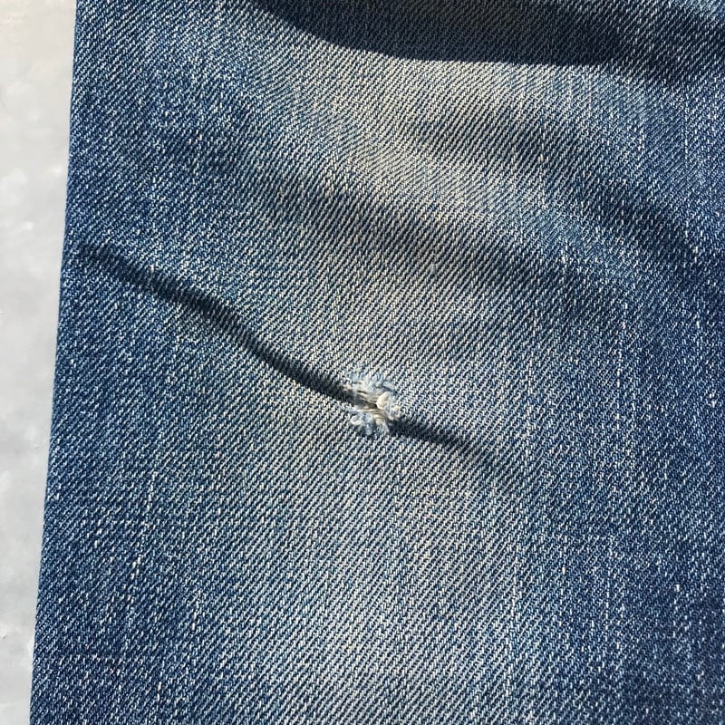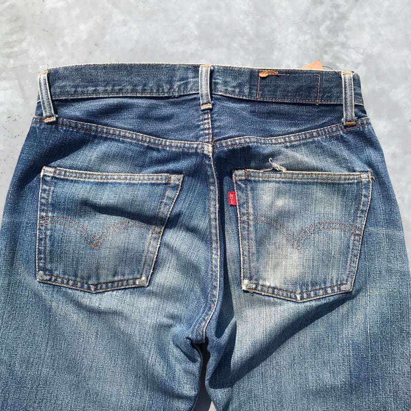70年代頃のリーバイス501、66前期モデルです。トップ裏刻印6、フライボタン3つ、ウォッチポケット、ウエストチェーン、バックポケットシングル、赤タブスモールe、セルヴィッジ裏片方チェーン。ウエスト実寸W29でフライボタンが3つですので、ボーイズサイズ、いわゆる503になるのではないでしょうか。色落ちもメリハリがあり良いアタリも出ています。右ひざと裾、股の一部に小さなダメージがございます。女性にもおススメな1本です。