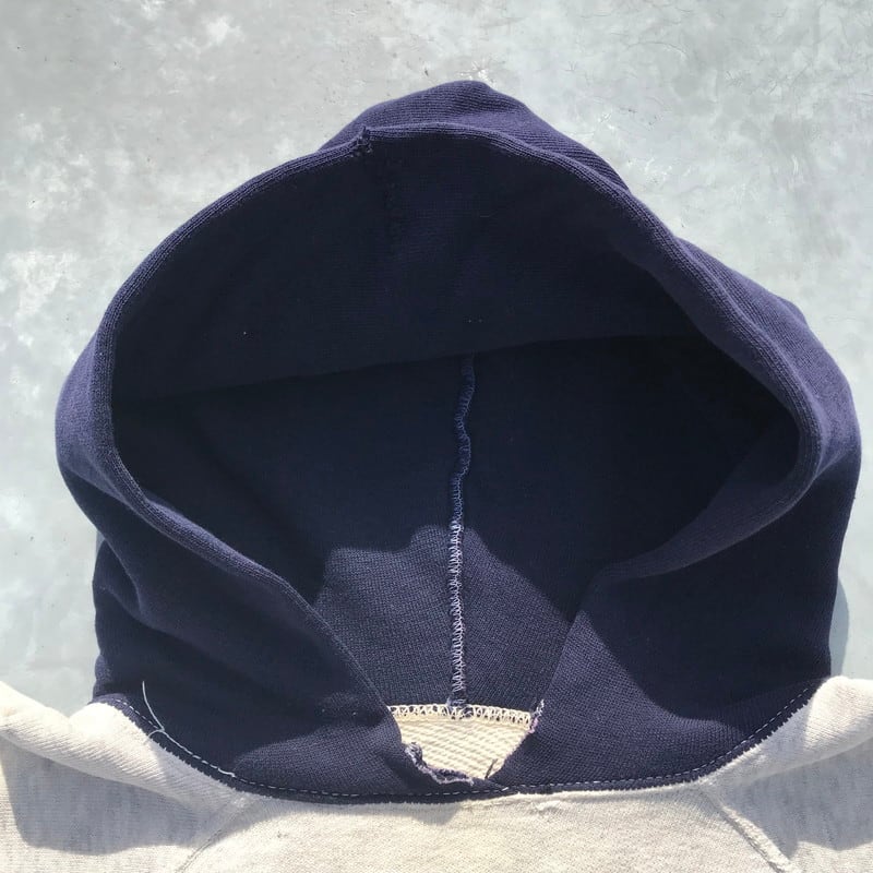 50年代頃の2トーンスウェットパーカーです。今ではなかなか見つけるのが難しくなった2トーンで人気のグレーネイビーとなります。ポケットはリブに接着していないドラポケとなり、袖と胴のリブはボディと同色というこの年代ならではディティールとなります。フードに2箇所、ボディーと袖に小さなリペアが数か所ございます。袖に少しシミがございます。裏地は裏毛です。サイズはM位です。(袖は若干短め)全体的にコンディションも良く170cm位の方でしたらジャストで着用出来る良いサイズ感ですので、コレクター必見のアイテムです。