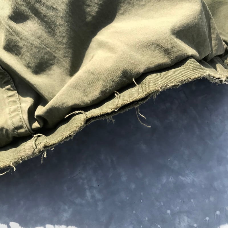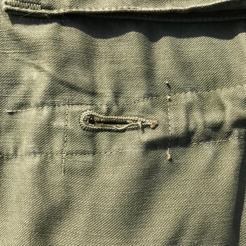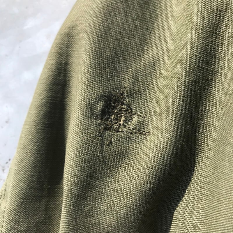 50年代頃のU.S.ARMY M-51フィールドジャケットです。M-65の前身で、襟裏にジッパーは無く、スナップボタンの数8個の仕様となっています。腕周りもアクションプリーツも無くシンプルな作りです。胸には第3機甲師団と在欧州米陸軍のパッチ、腕には太平洋空軍のパッチがついておりますが、後付けとなっております。右肩と袖口にリペアがあり、両袖口と裾にもダメージがございます。ライナーをお持ちの方は取り付けができますので、冬でもアウターとしてお使いいただけます。