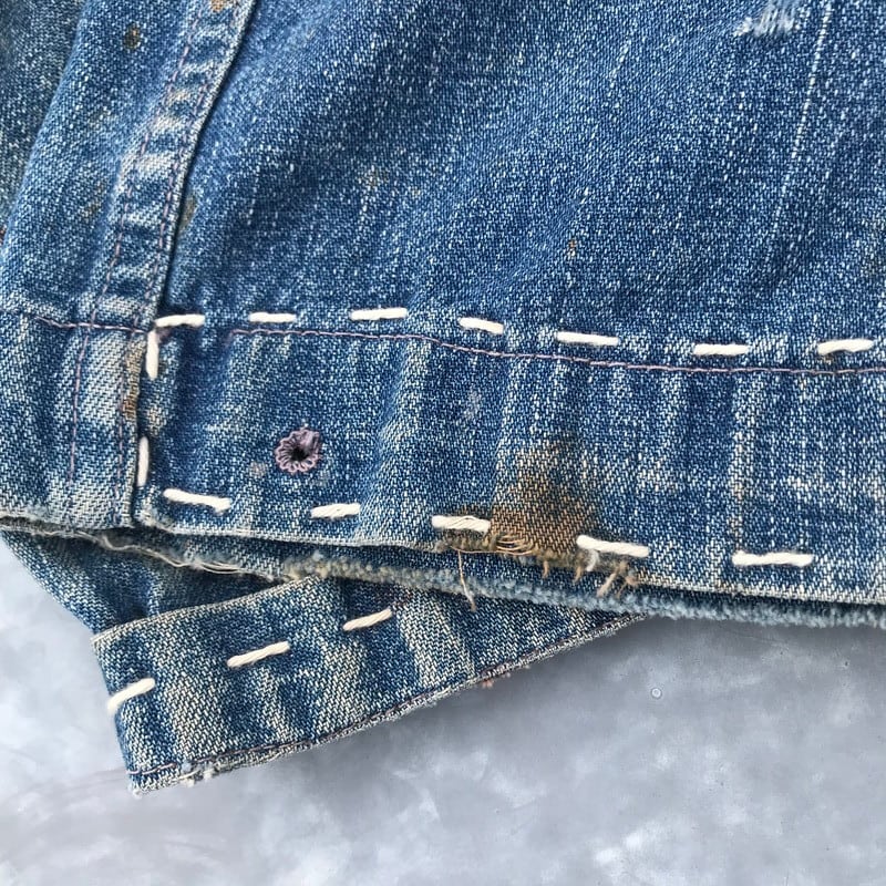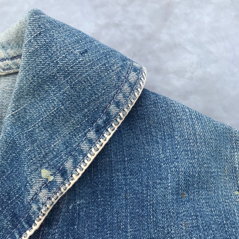 40年代頃のU.S.NAVYデニムショールカラーカバーオールです。第二次世界大戦時に兵士の作業着として使用されて、ヴィンテージミリタリーウェアの中でも人気のアイテムです。ボタンはチェンジボタンから縫い付けボタンに全て替えられています。通常はBOX型のカバーオールですが、ハンドステッチでカスタムされており、背中はテーラードのようにシェープされております。全体のフェード具合や汚れ等の雰囲気はまさにヴィンテージにしか出せない味わいです。背中のステッチは解いて元のBOXシルエットに戻しても良いかもしれません。唯一無二のカスタムですので、人と違った物をお探しの方は必見です。
