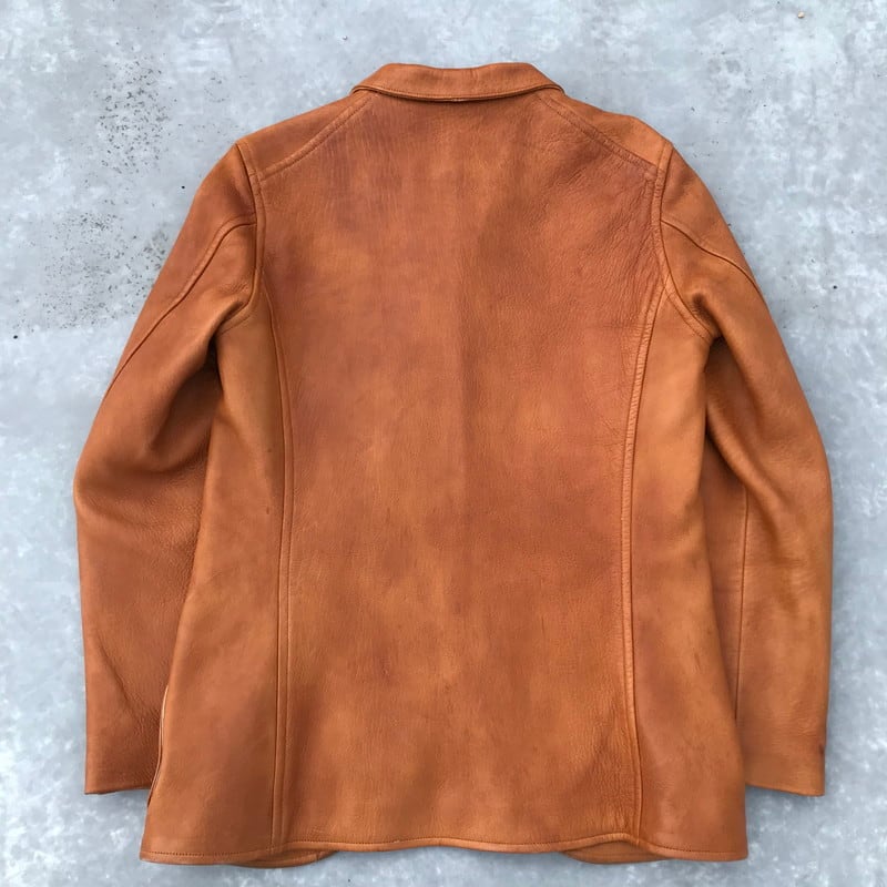 FREEWHEELERSが手がけるインラインブランドのGreat Lakes Gmt.Mfg.Co.のLATE 1800's TAILORED SACK COAT DARIUSです。上質で、しなやかなディアスキン【鹿革】を使用したレザージャケットで、1800年代のサックコートをモチーフに作られています。擦れや小傷などございますが、ディアスキンならではのエイジングを楽しめる1着です。オイルメンテナンス済ですので、長く着用して頂けます。右胸辺りが若干色が濃ゆくなってます。サイズは36で、170cmで痩せ型の方でジャストなサイズ感です。定価は非常に高額ですので、お探しだった方は必見です。