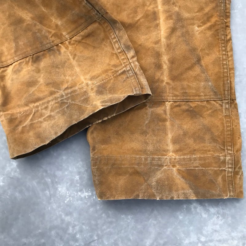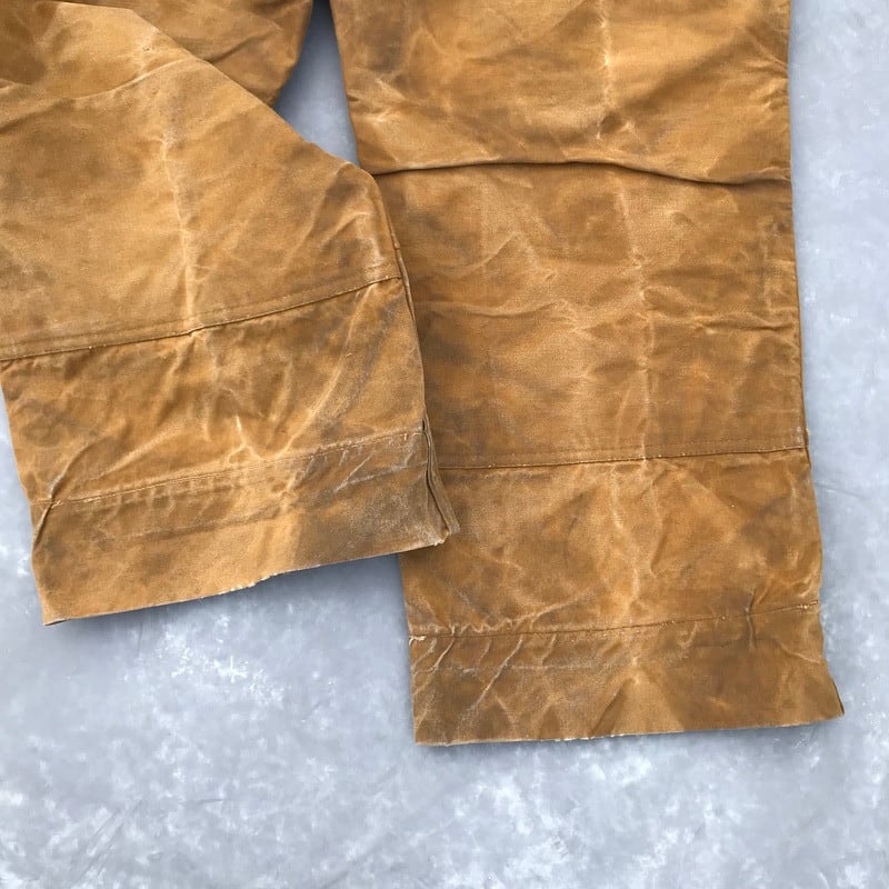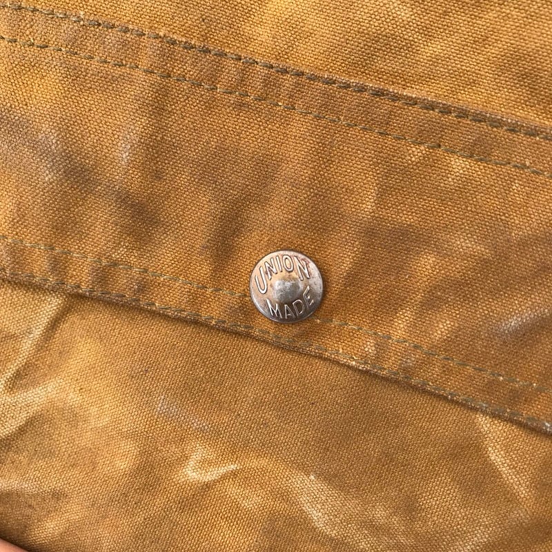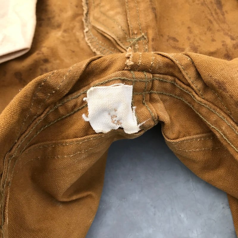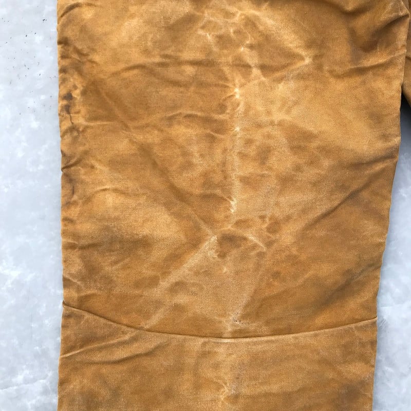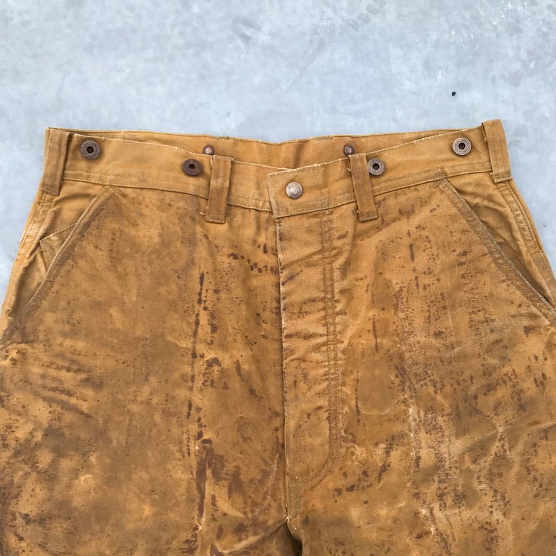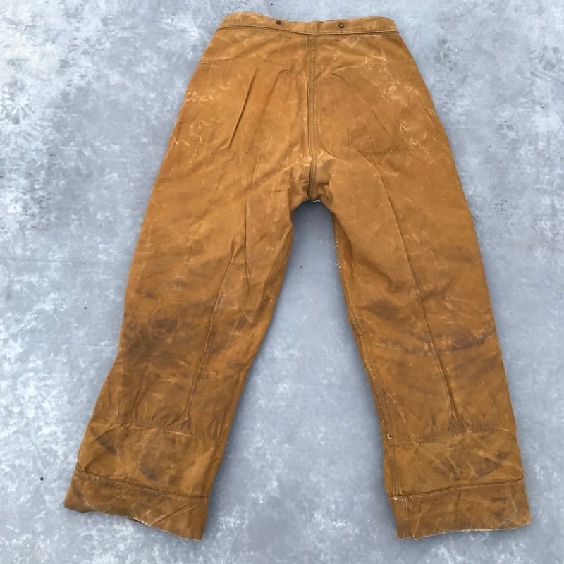 30年代から40年代頃のBLACK BEARアーミーダックロガーパンツです。腿から脛にかけて2枚仕立てとなるダブルニー仕様です。ボタンは社名入りとUNION MADEボタンですので、第二次世界大戦以前に作られたと考えられます。RAIN TITEとあるように雨などに強いオイルドコットン生地です。全体の汚れやアタリはまるでアートの様で、唯一無二のスペシャルな1本です。股の内側に小さなリペアがございます。あえて綺麗めなシャツやジャケットのハズしとしてコーディネートしてみてはいかがでしょうか。【ウエスト平置き】43.5cm【ヒップ平置き】58cm【股上】37cm【ワタリ平置き】34cm【股下】71cm【裾幅平置き】27cm