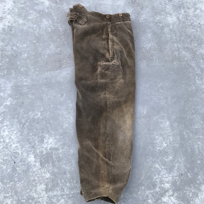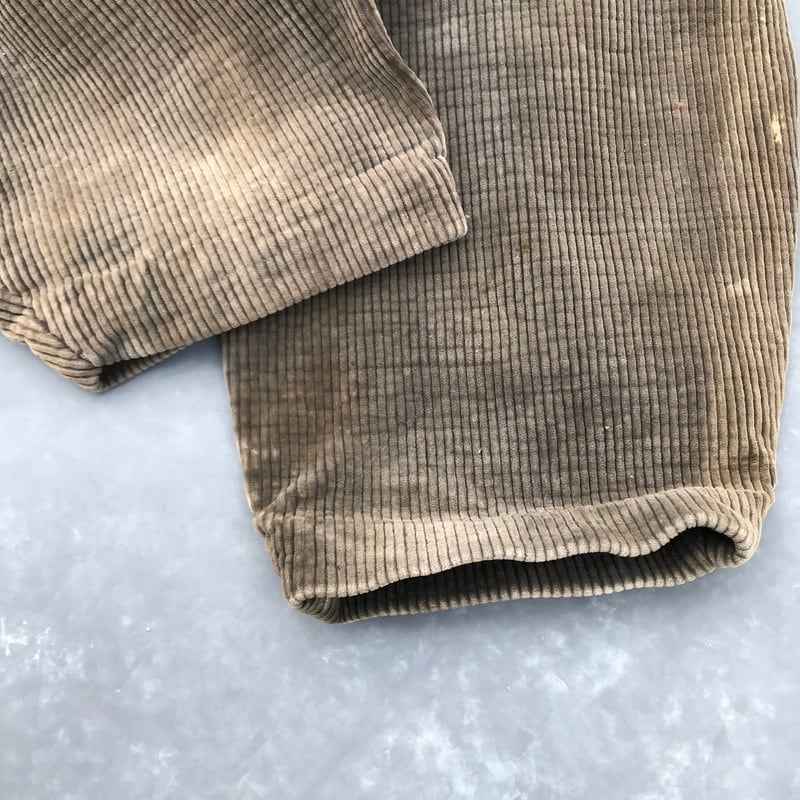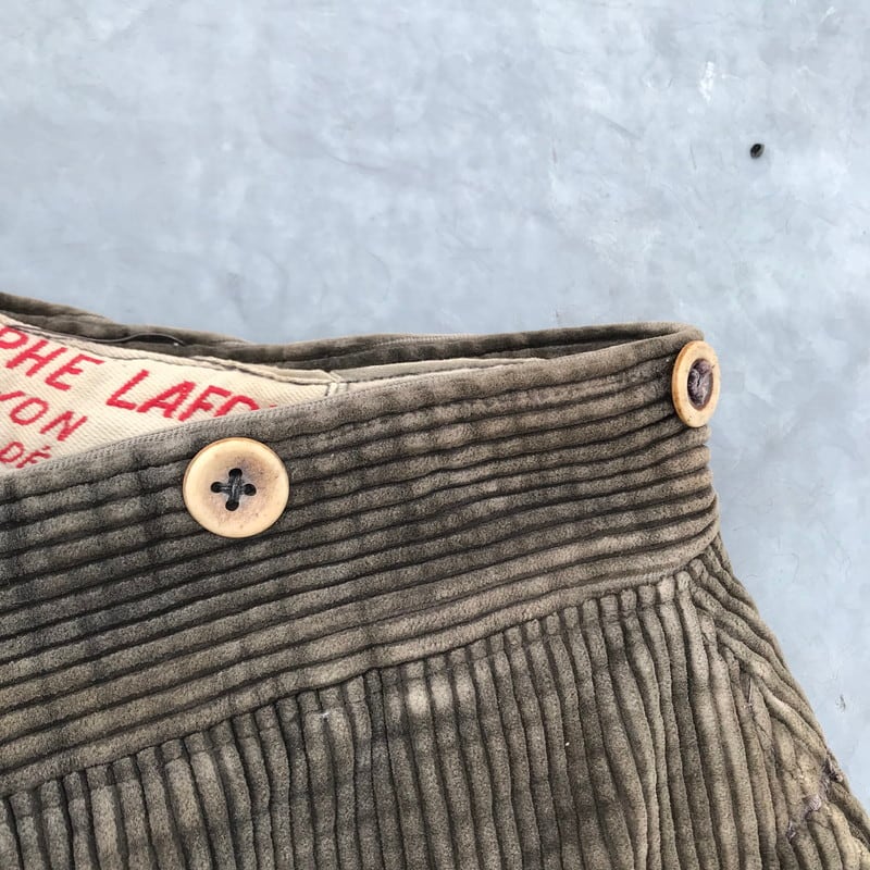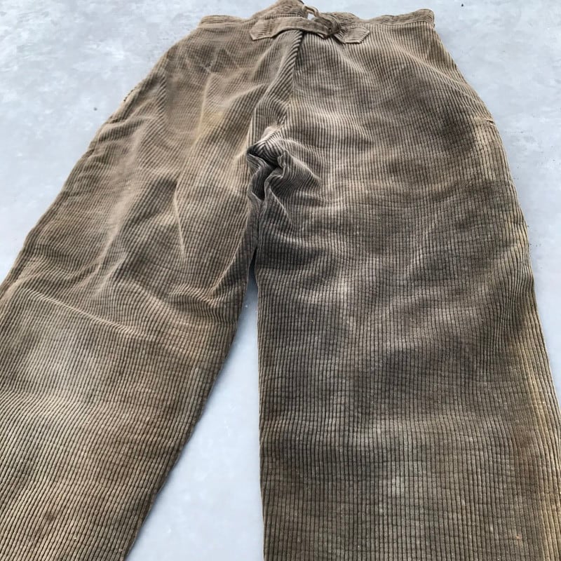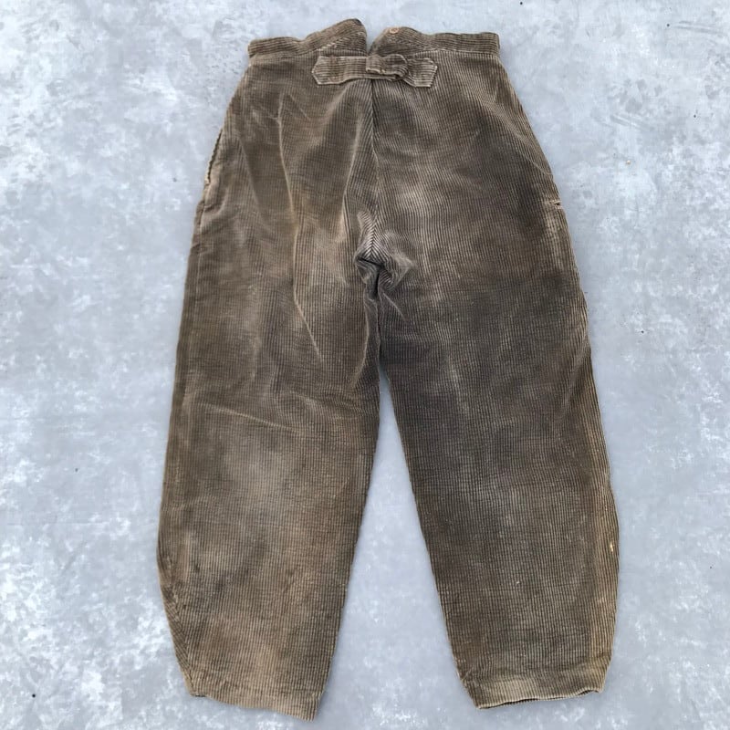 30年代から40年代頃のADOLPH LAFONTの太畝コーデュロイファーマーズパンツです。ダミアンコーデュロイとも呼ばれる厚手で非常にコシのある丈夫なでハンティングジャケットなどにも使用された生地で作られております。グレーとブラウンの【】中間のような色合いでフェード具合もすばらしい1本です。フロントのオリジナルフックは片方が壊れている為別のフックが取り付けられています。裾に向かってラウンドしている独特なシルエットとなります。ツイードジャケットに合わせてトラッドな着こなしにお勧めです。【ウエスト平置き】41cm